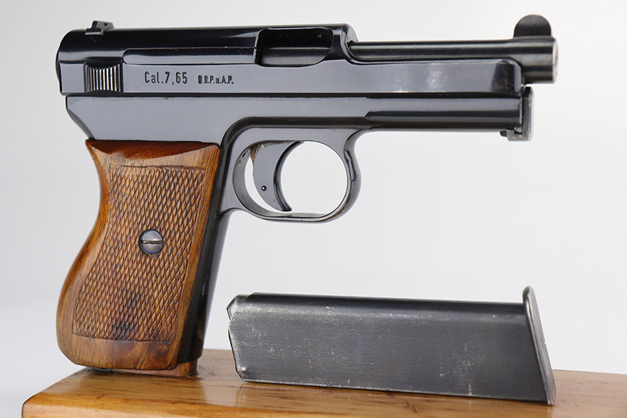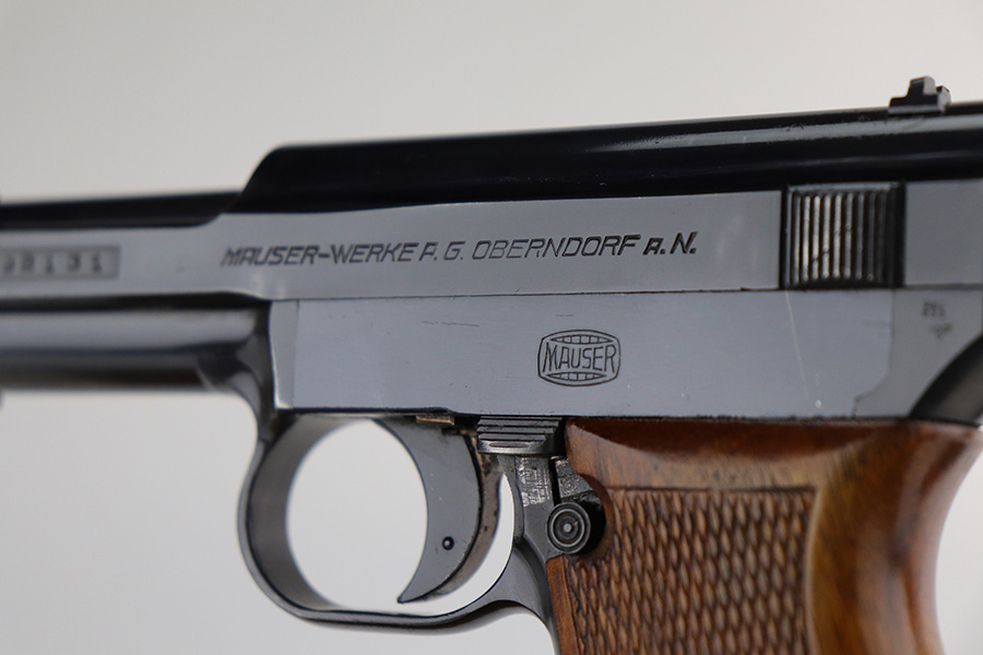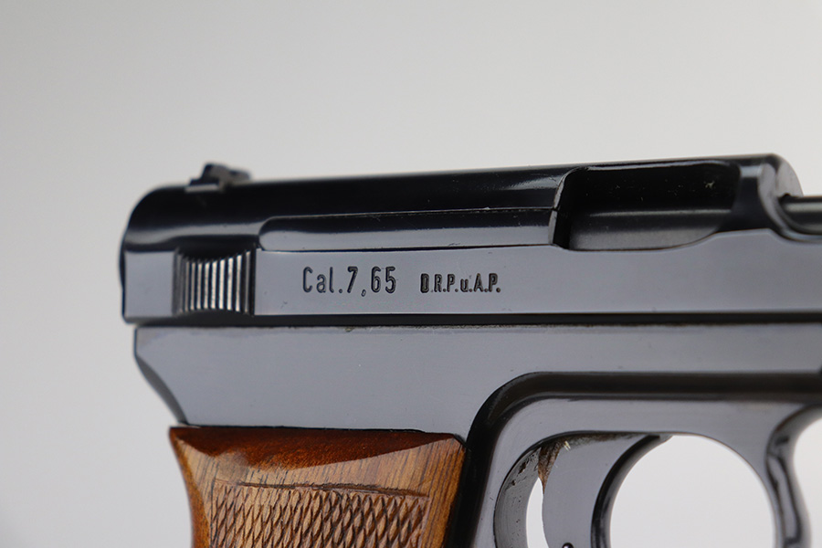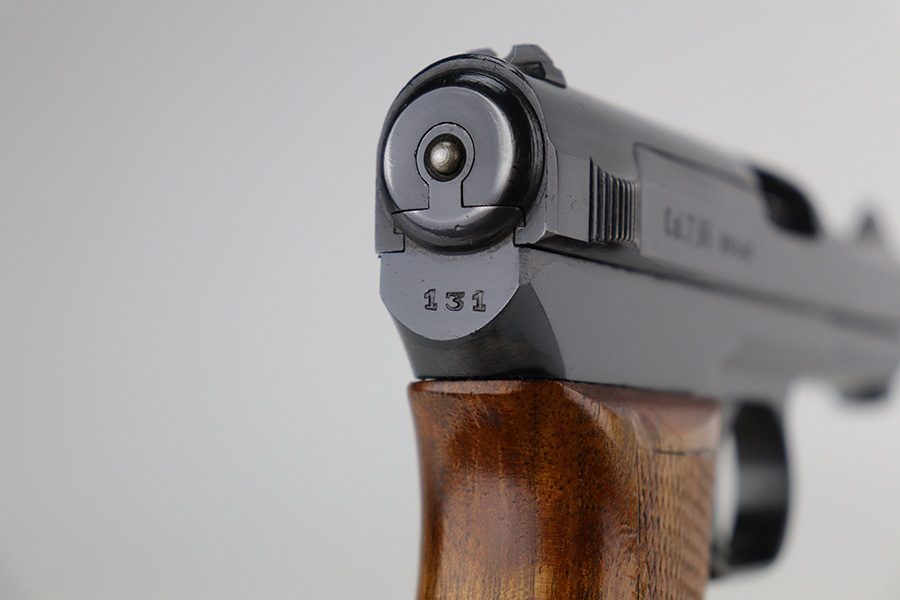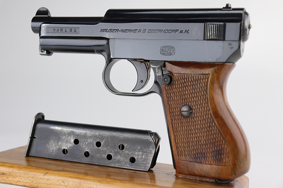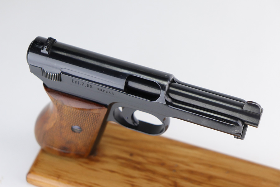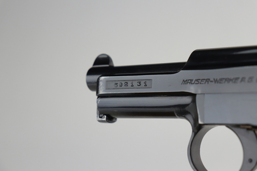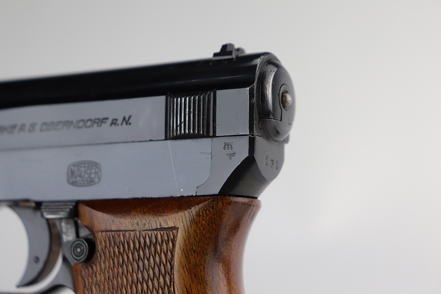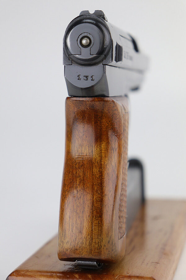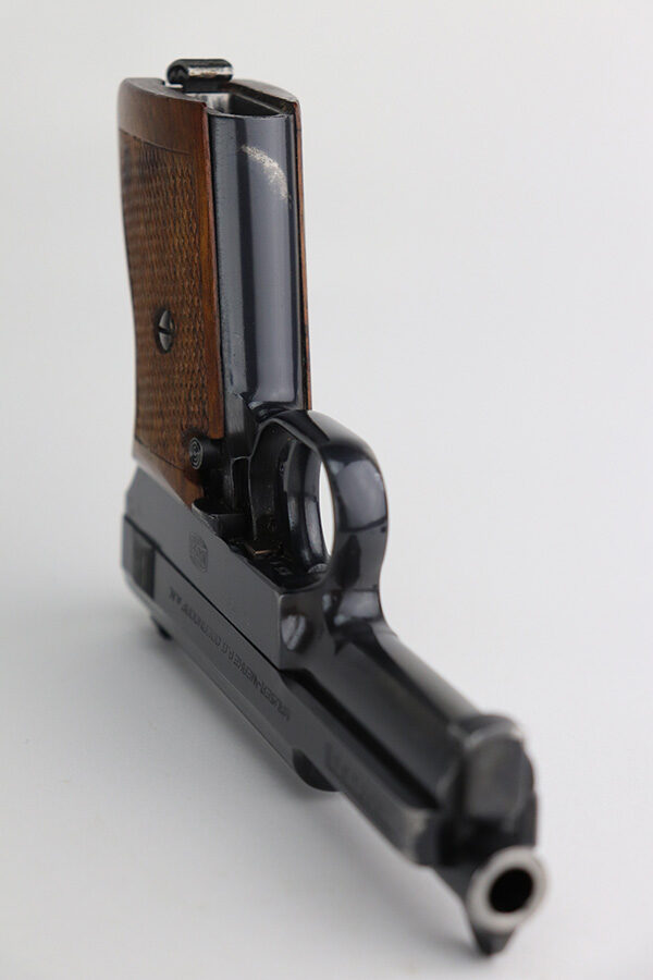 9/17/21 – This is an excellent example of a scarce Mauser Model 1934 issued to the Nazi military in 1940-41. This gun would have been produced just before the factory switched over to HSC production, around 1940-1941. It is proofed on the back left side of the frame with Eagle/655 and a test-fire eagle stamp. There were only about 8,000 of these pistols issued in this way. This one is all matching and has retained about 95% of its original finish. There is wear around the muzzle, hints of wear on the top of the slide, and an area of spotty wear on the right side of the slide. There is also a streak of wear on the front strap. Comes with an excellent wood grip and a period-correct magazine. Minty bore. The slide does not lock back with this magazine.