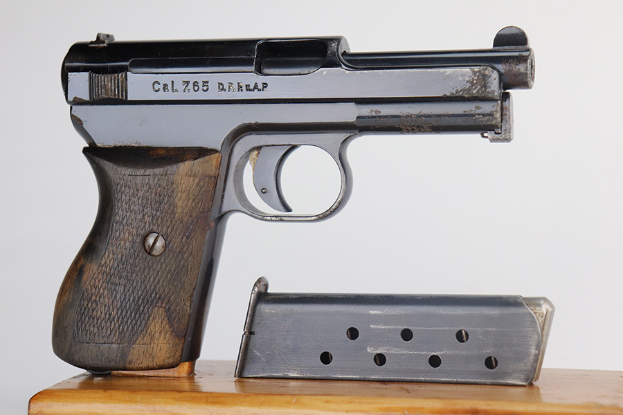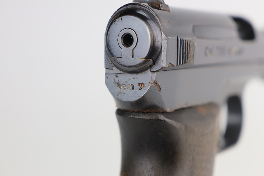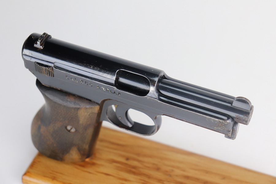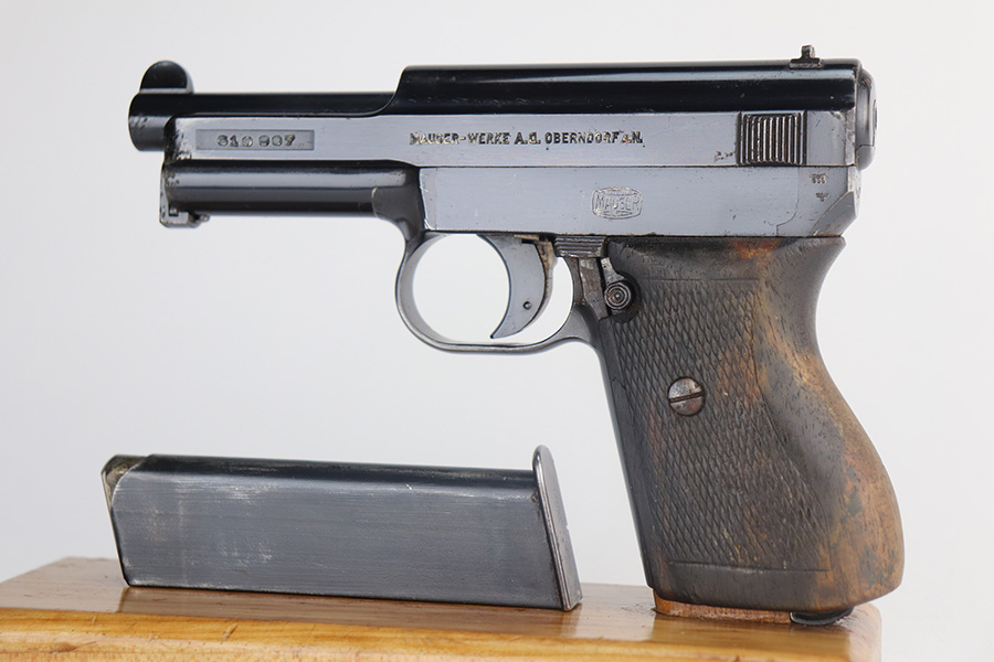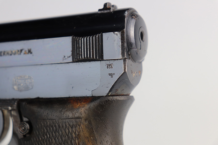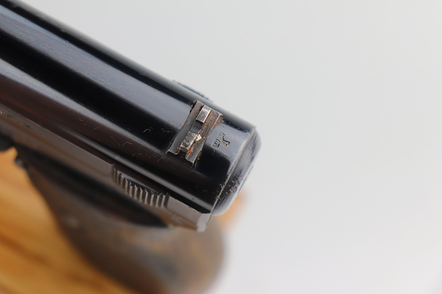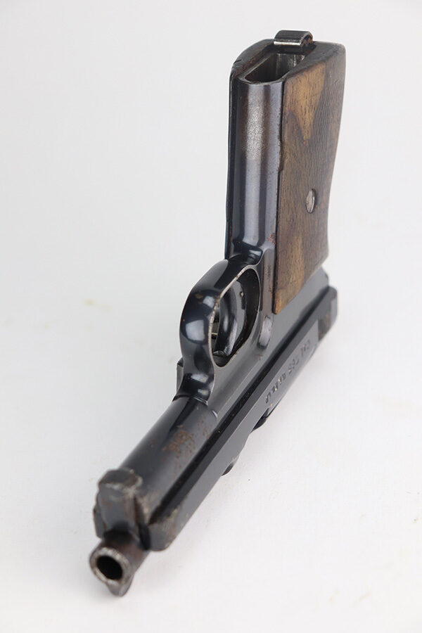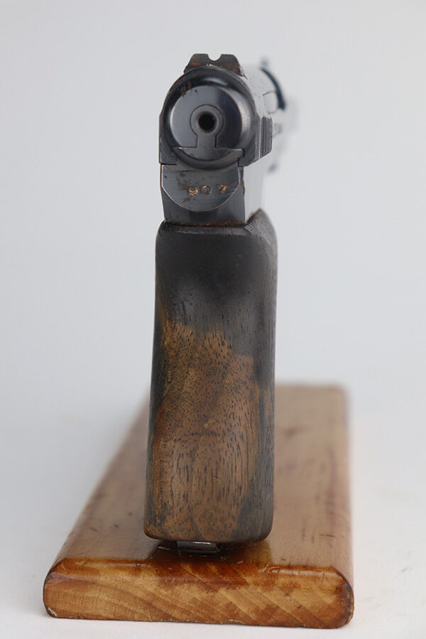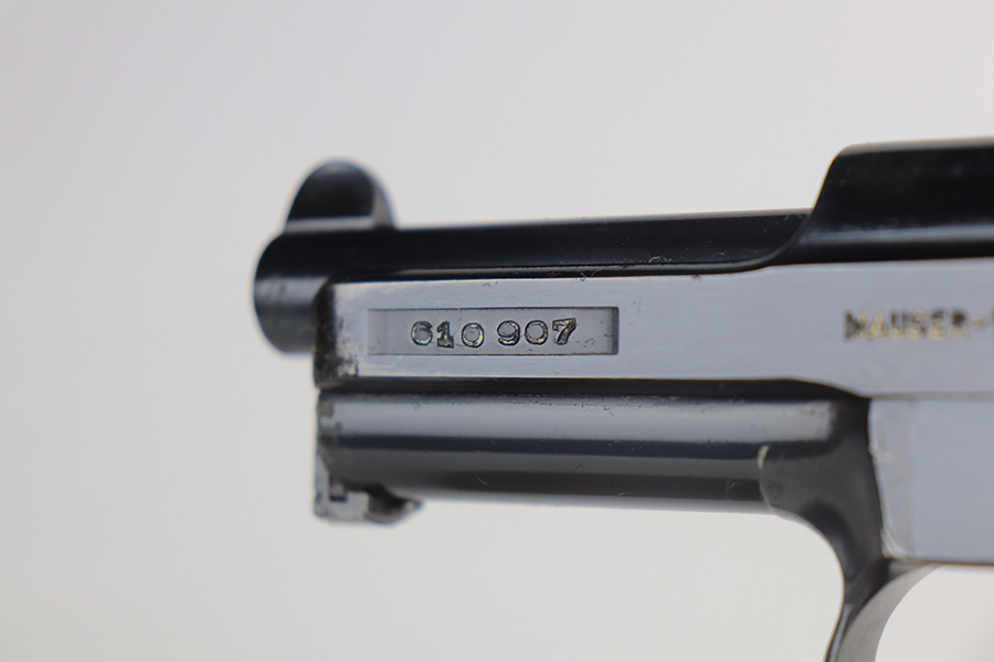 5/24/21 – This is a nice example of a Mauser Model 1934 issued to the Nazi military during WW2. The gun is matching and has the proper military proofs on the left side of the frame near the tang. The gun has retained about 93-94% of its original high polish finish. There is minor wear and patina on the front strap and spotty wear on the top of the slide. While there isn’t much actual finish loss, there is noticeable significant pitting all around the muzzle. The grip is nice but has a small hairline crack on the left side and a small chip on the right side. Comes with a correct magazine. Nice shiny bore.