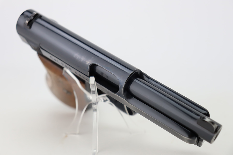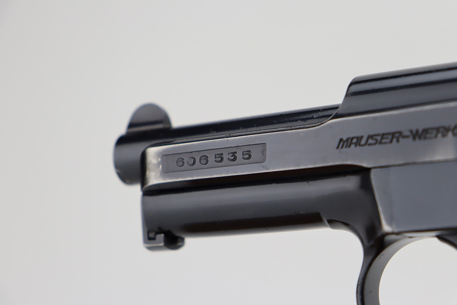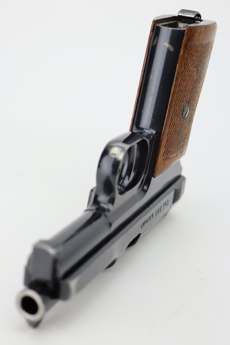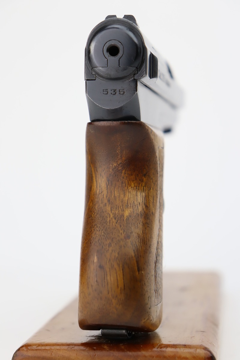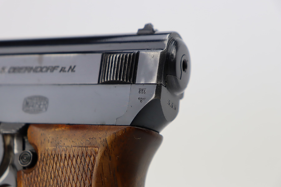 10/9/23 – This is a very nice example of a scarce Mauser Model 1934 issued to the Nazi military in 1940-41. This gun would have been produced just before the factory switched over to HSC production, around 1940-1941. It is proofed on the back left side of the frame with Eagle/655 and a test-fire eagle stamp. There were only about 8,000 of these pistols issued in this way. The original high polish finish rates about 93% with areas of wear around the muzzle, along both sides of the slide, on the underside of the trigger guard, and a couple of small dots on the front strap. Fitted with an excellent wood grip. Comes with one proper magazine. Excellent bore with strong rifling.