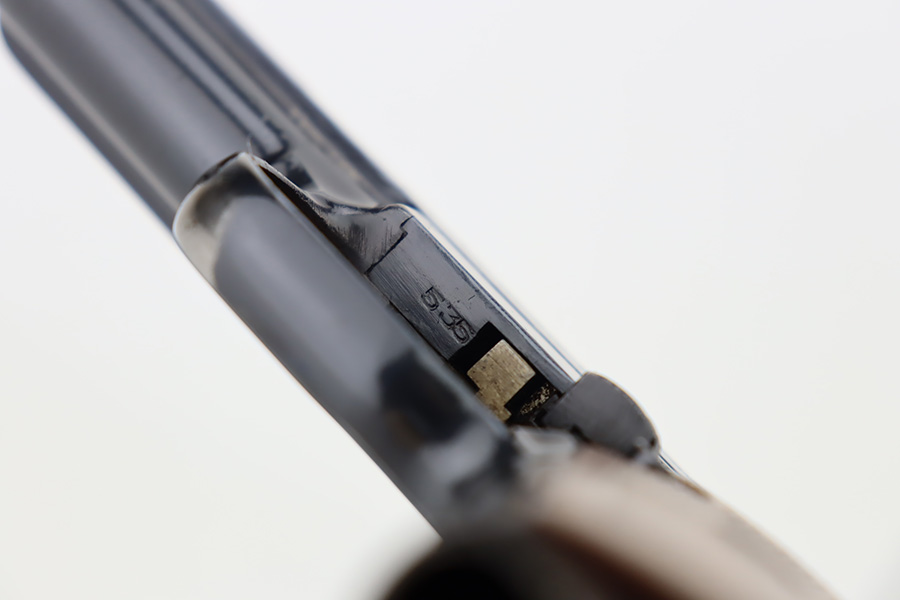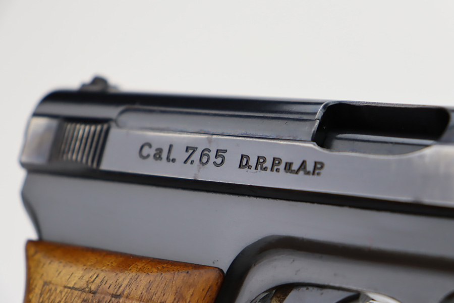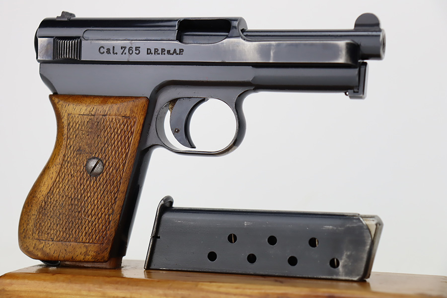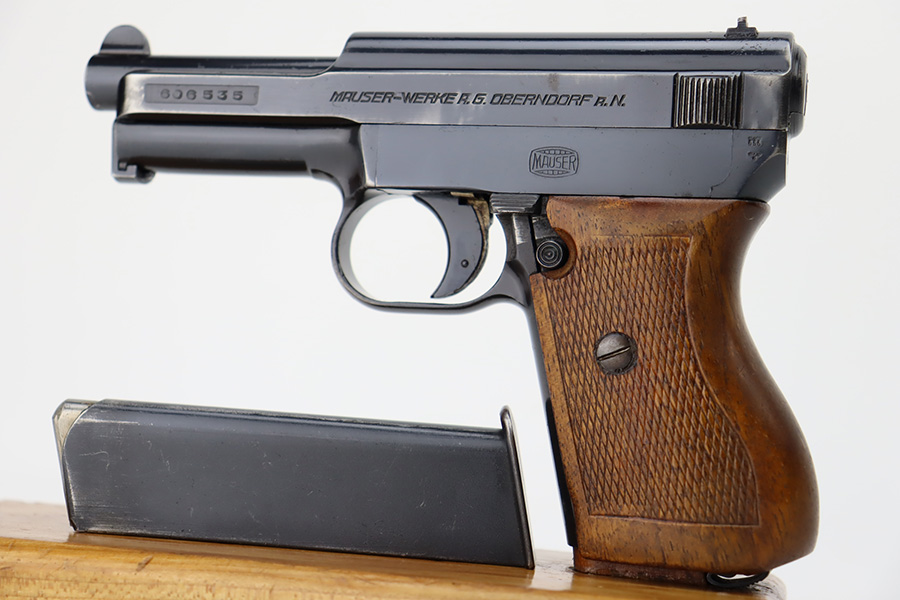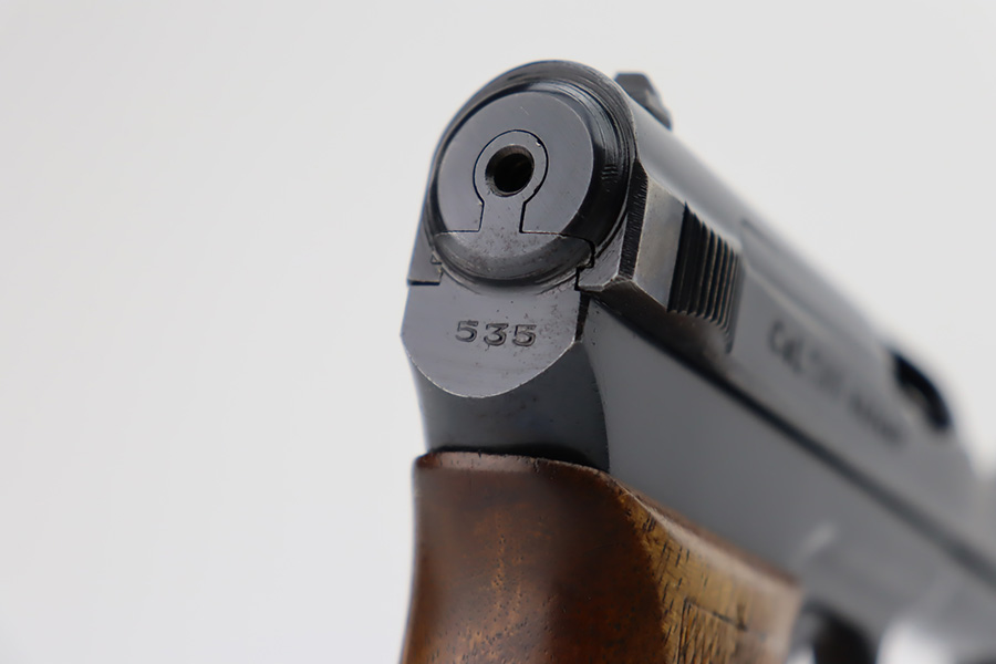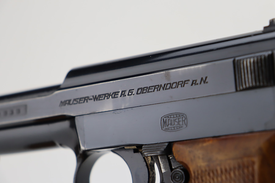 10/9/23 – This is a very nice example of a scarce Mauser Model 1934 issued to the Nazi military in 1940-41. This gun would have been produced just before the factory switched over to HSC production, around 1940-1941. It is proofed on the back left side of the frame with Eagle/655 and a test-fire eagle stamp. There were only about 8,000 of these pistols issued in this way. The original high polish finish rates about 93% with areas of wear around the muzzle, along both sides of the slide, on the underside of the trigger guard, and a couple of small dots on the front strap. Fitted with an excellent wood grip. Comes with one proper magazine. Excellent bore with strong rifling.