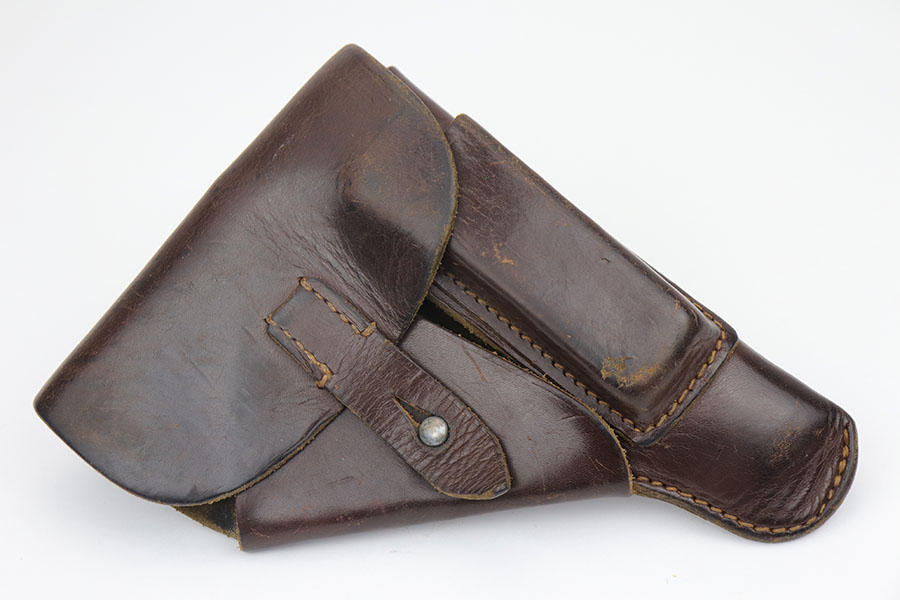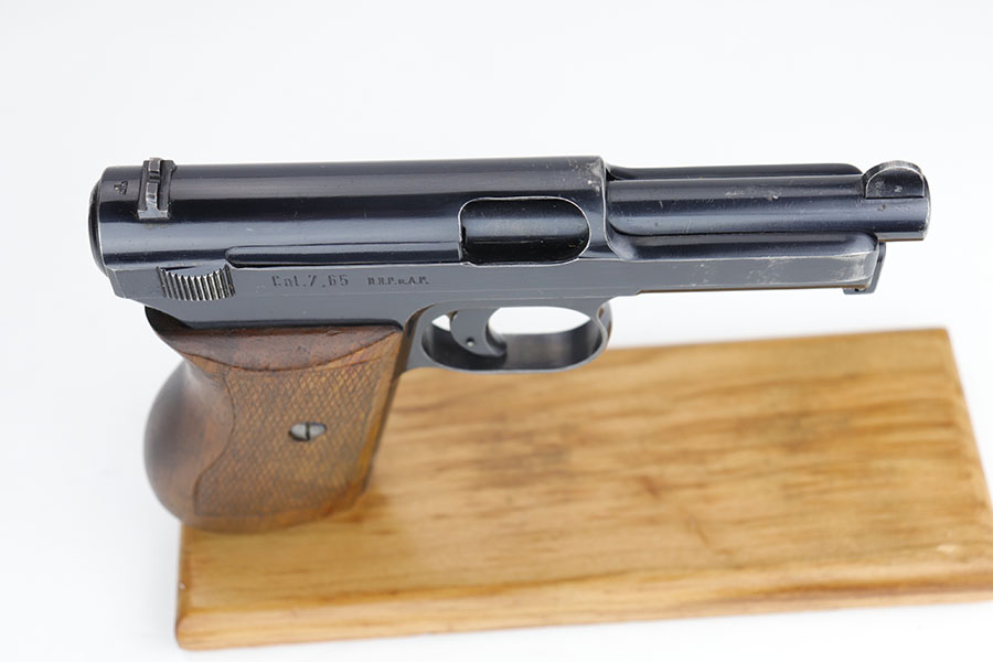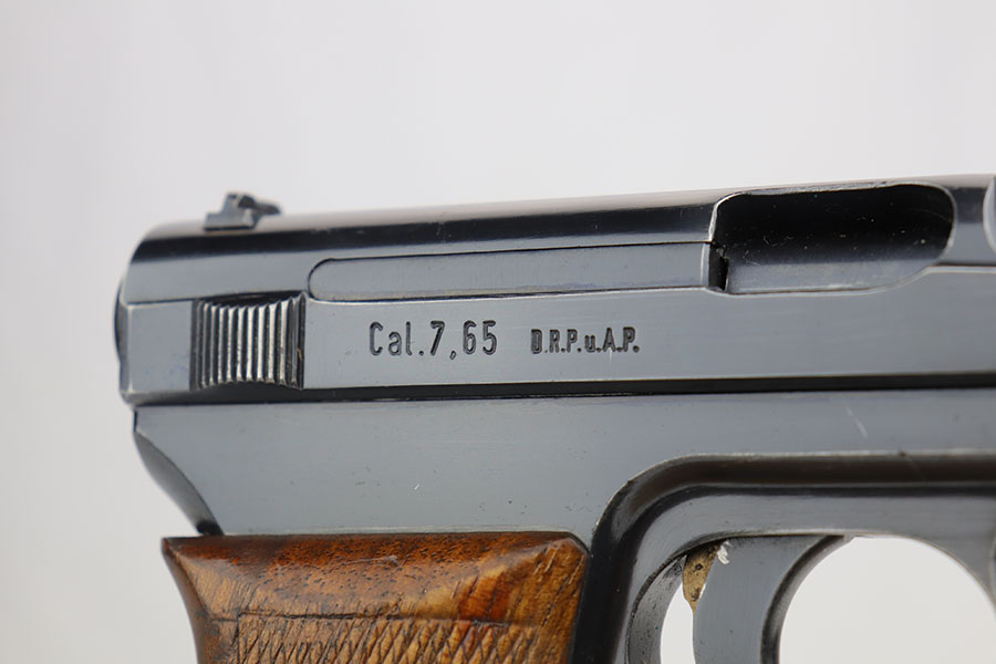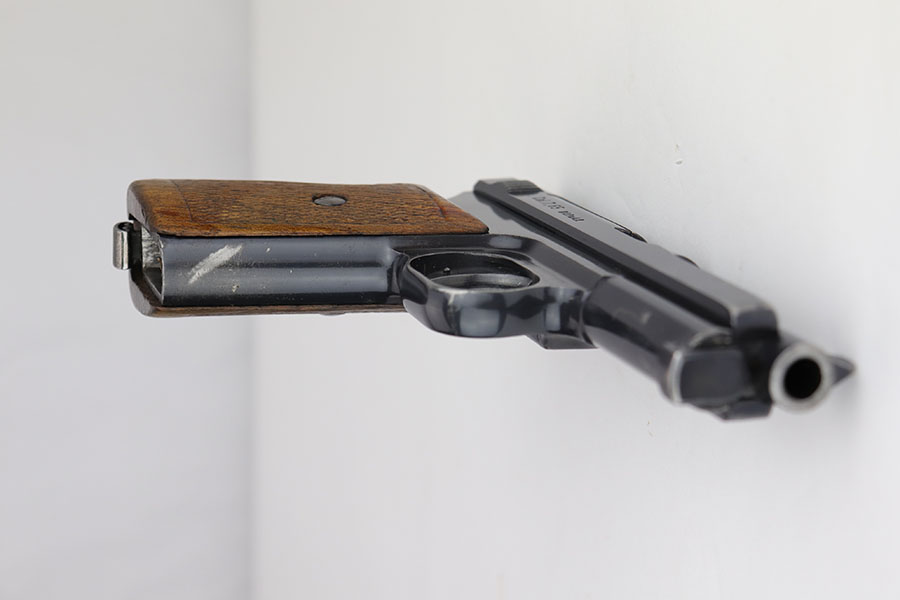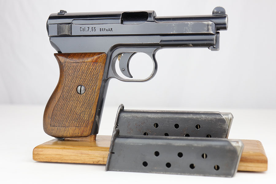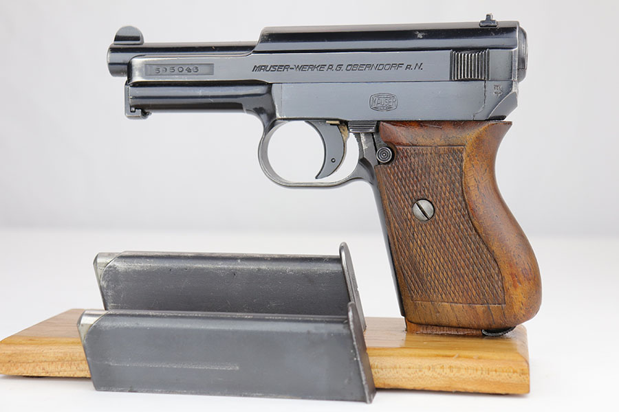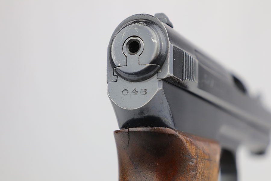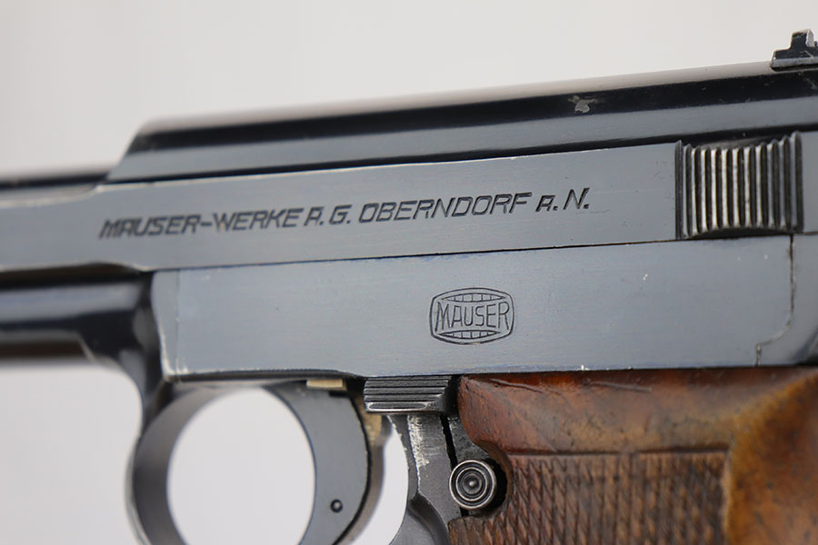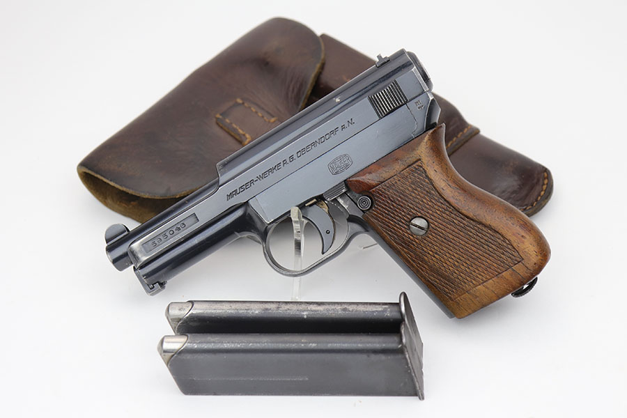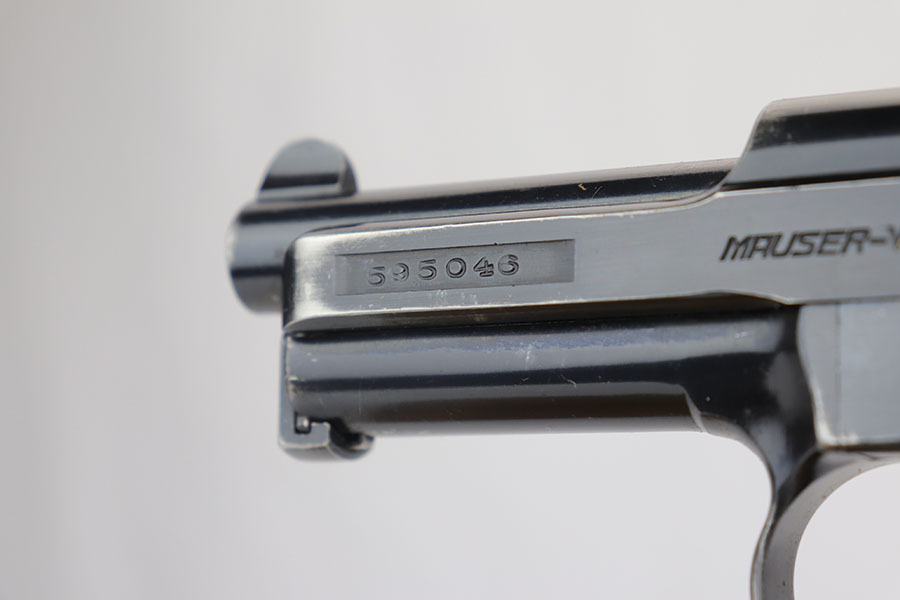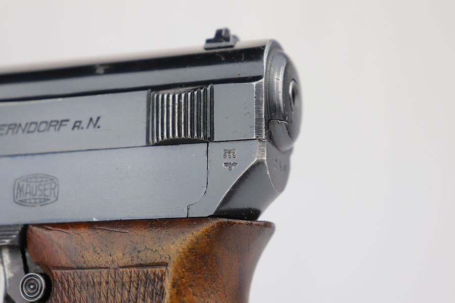 10/10/19 – This is a scarce variation nazi army issued Mauser model 1934. This gun would have been produced just before the factory switched over to HSC production, around 1940-1941. The pistol is proofed on the back left side of the frame with Eagle/655 and a test-fire eagle stamp. There were only about 8,000 of these pistols issued in this way. This pistol comes with a period correct (unmarked) holster and spare magazine as well. Both magazines are Mauser banner stamped on the base. The gun rates at about 92-94% with some front strap finish loss along with finish loss on the top of the slide, muzzle, and slide edges. The bore is minty condition 9.5/10 overall.