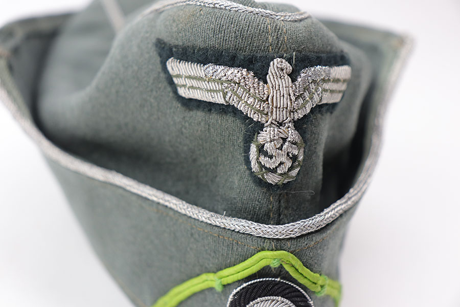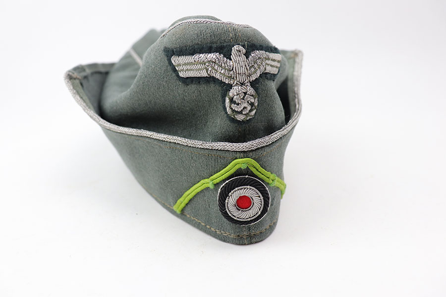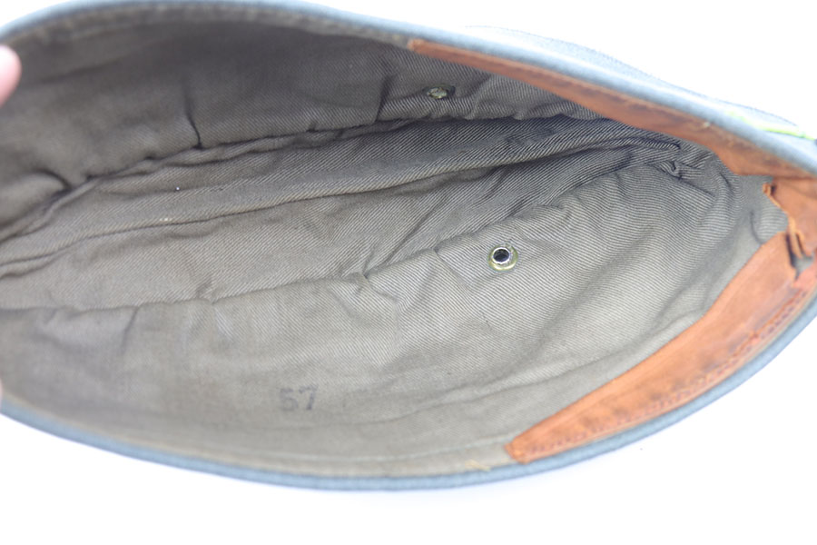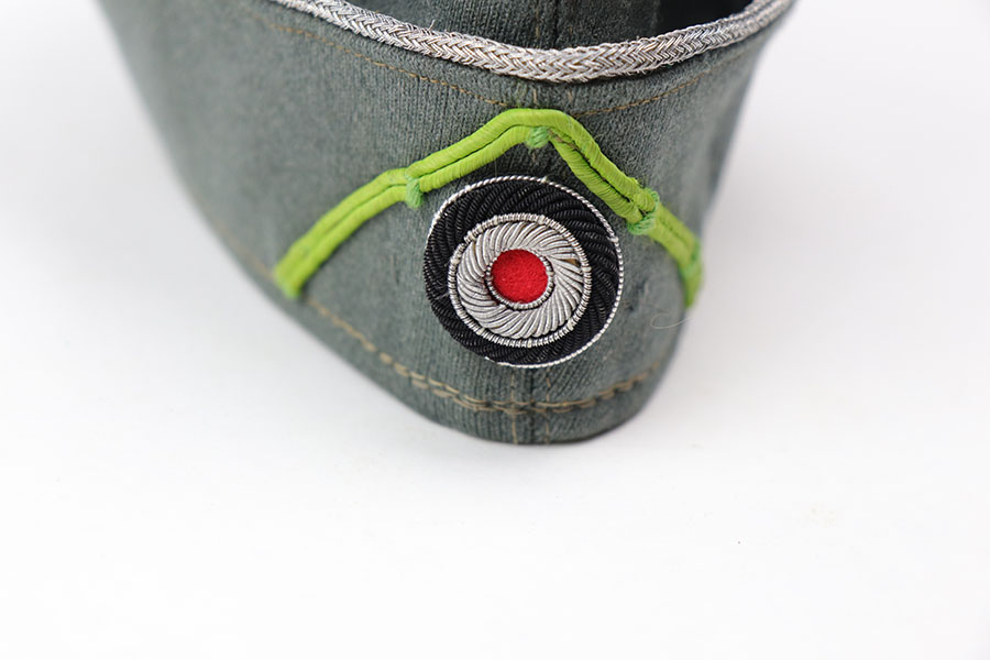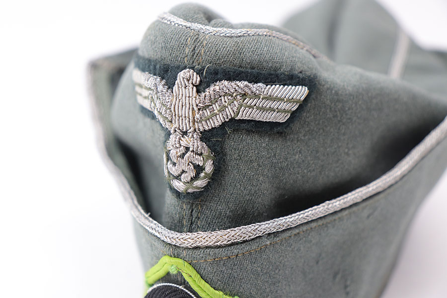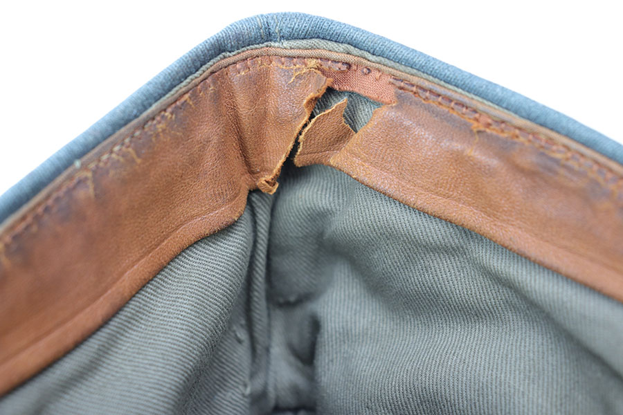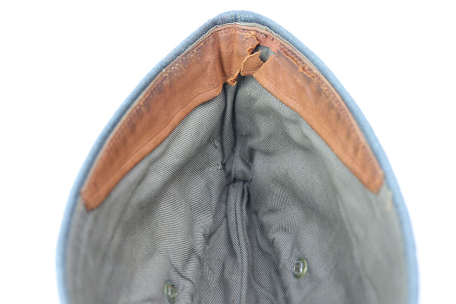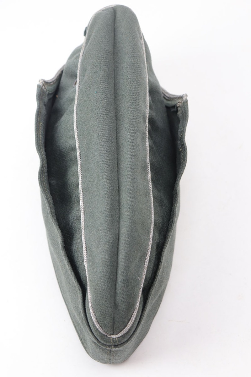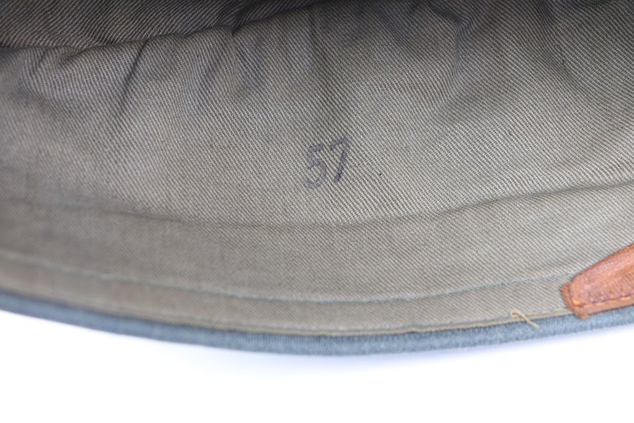 9/9/20 – This is an original nazi Officer’s Overseas cap. The wool cap is in great overall condition with an excellent, clean interior. The interior is ink stamped “57” for size. Some of the leather lining near the front / brim of the interior. The exterior is clean as well with minimal wear. The front eagle has all of the silvering in tact. No holes or stitching issues.