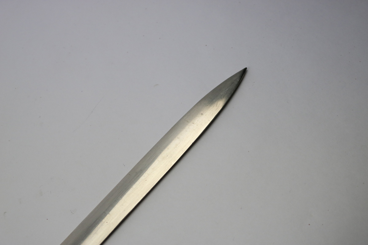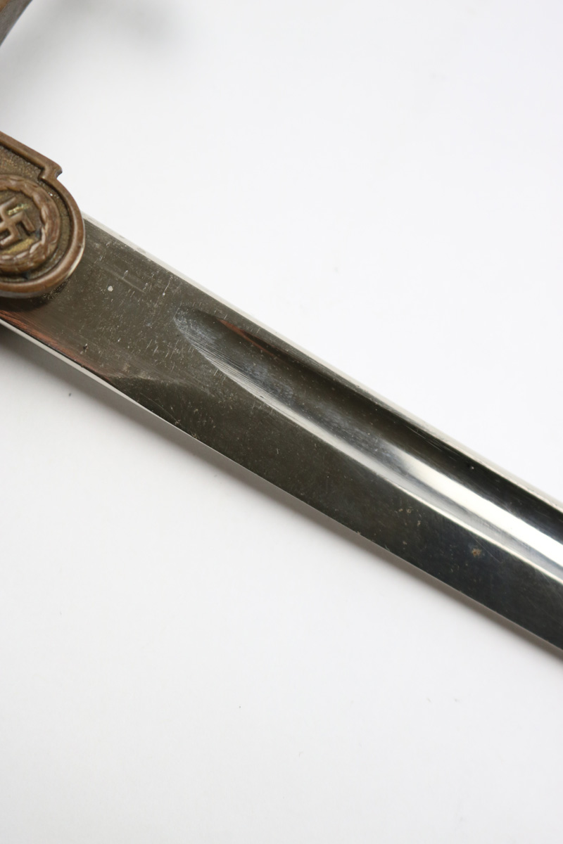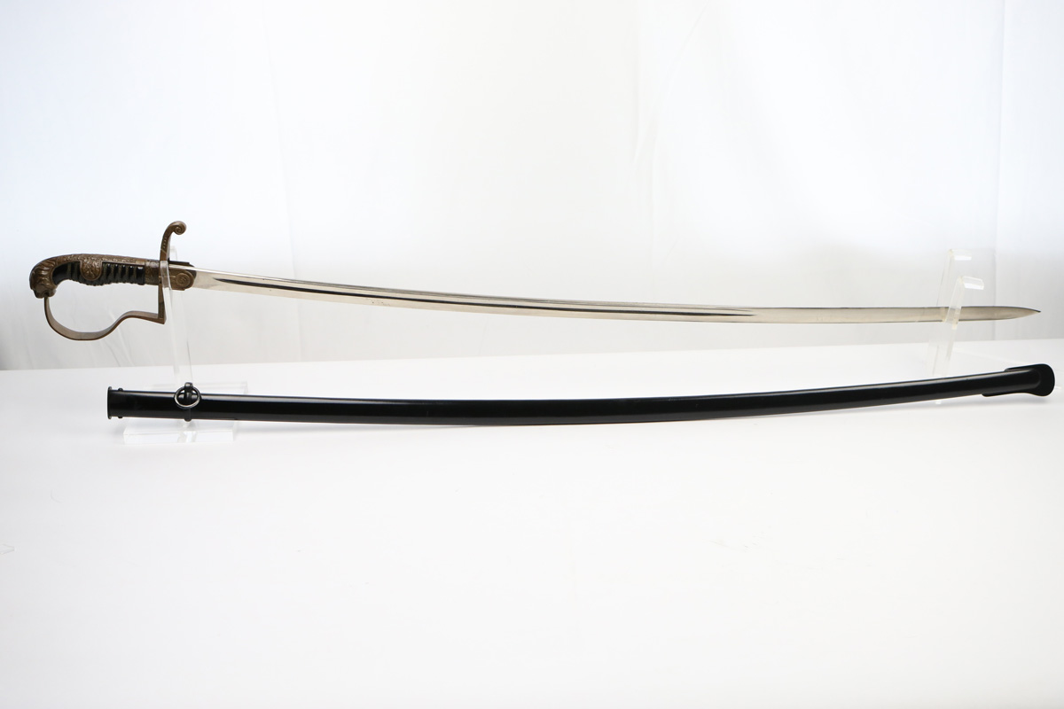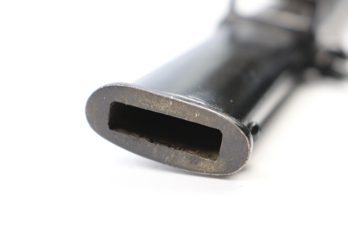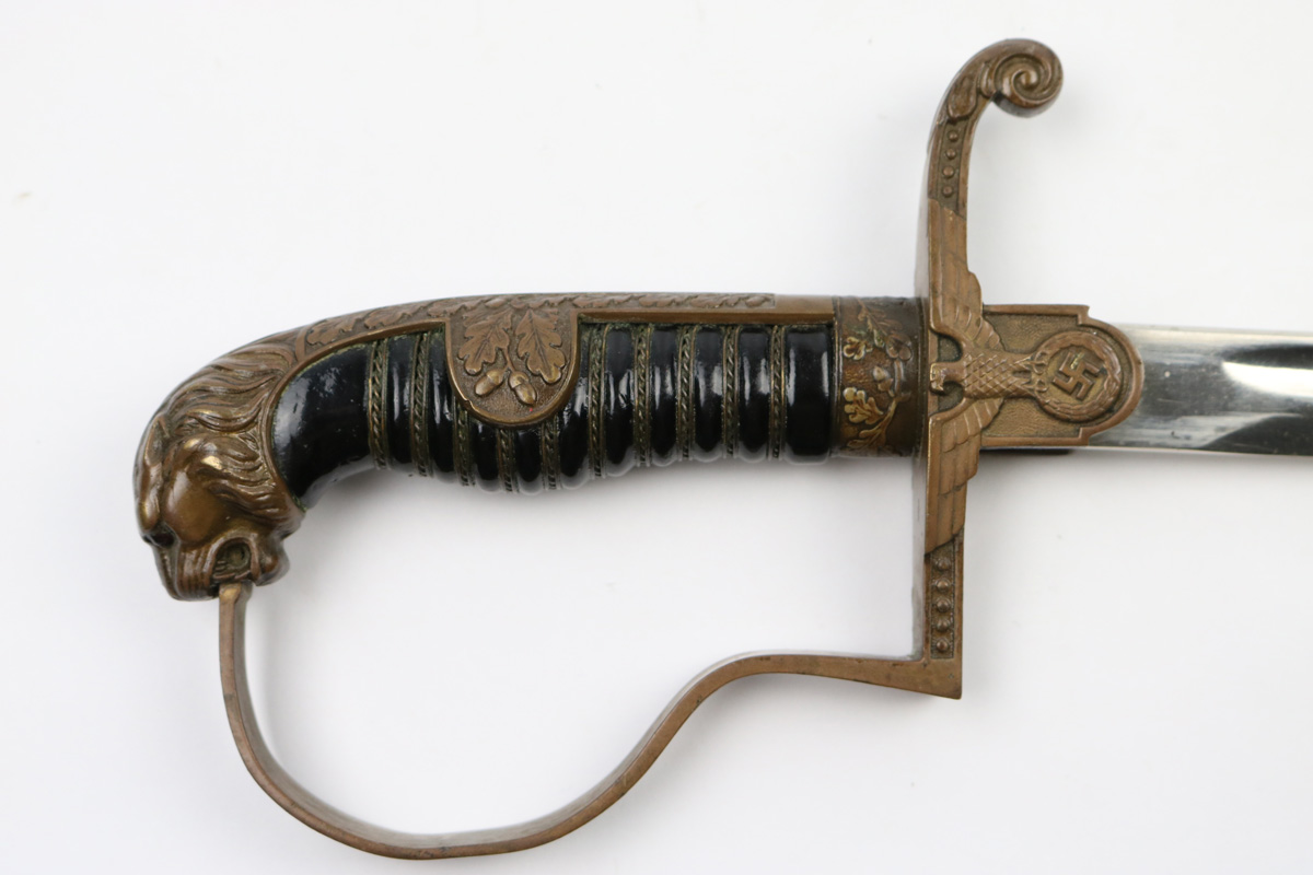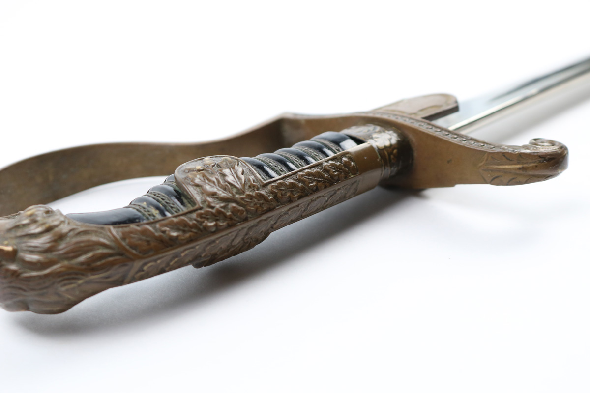 6/15/18 – Deluxe ‘Lion Head’ with red glass eyes. “Anton Wingen” manufacturer. Extra high quality with the ‘Lion Head’ handle was issued to army officers during WW2. Handle is heavily chiseled (engraved) and in excellent condition. Blade is mint bright with no defects except for some normal scabbard wear. Scabbard is black enamel feeling, but could possibly be repainted. Our guess is it has been since it’s so minty. Guaranteed original and authentic.