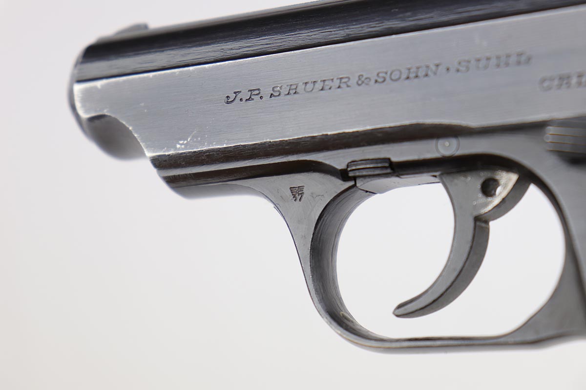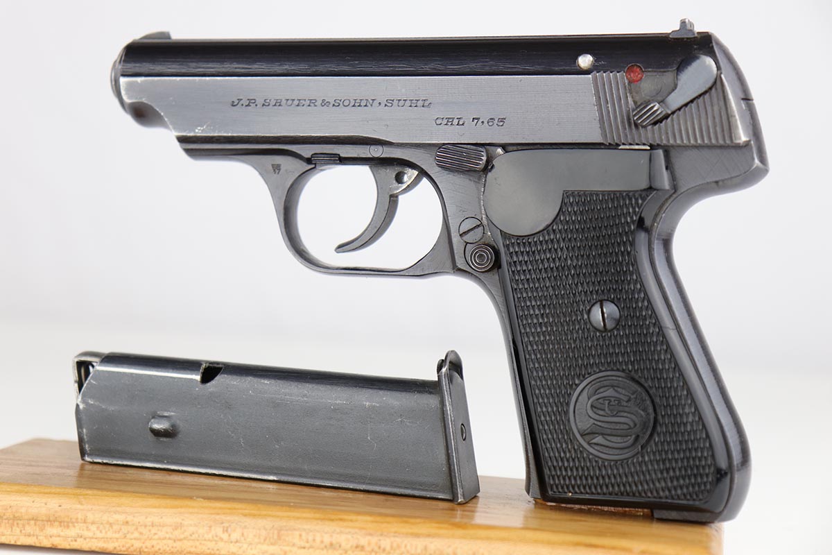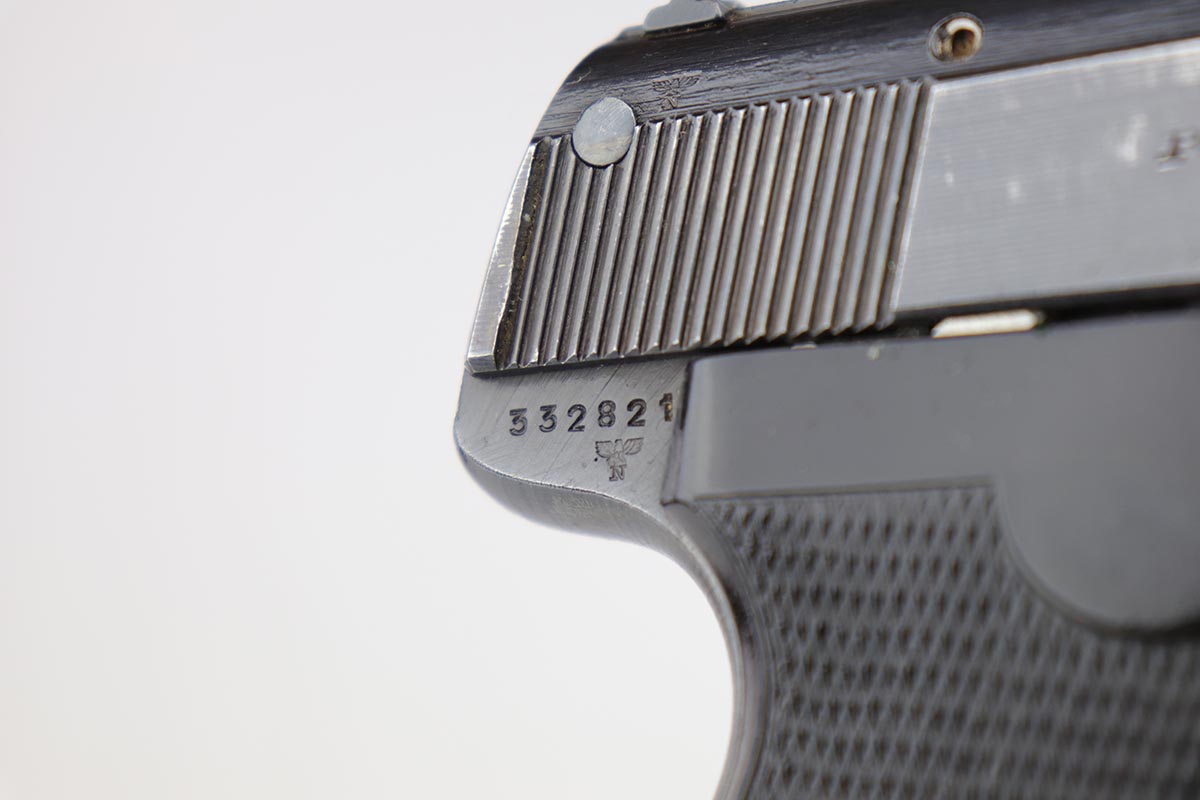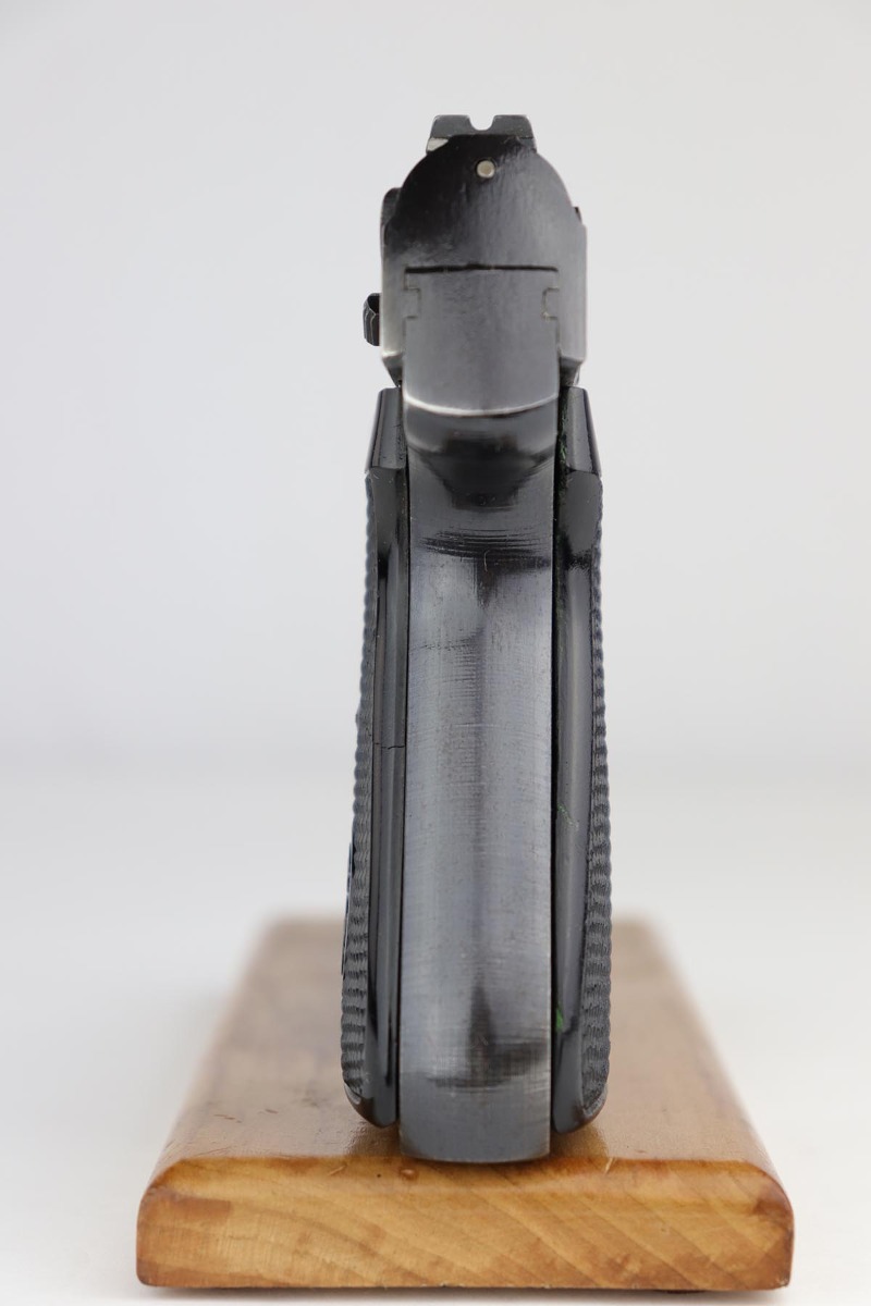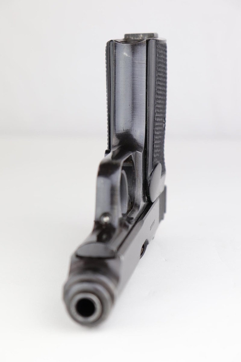 6/21/19 – This is a very nice example of an original and matching Sauer 38h that was issued to the German Army. The military style blue rates at 96-97% with the largest area of finish loss on the trigger guard. There’s also very minor wear on both sides of the slide. Nice grips, though the left panel has a small chip in the corner. Half-moon magazine. Minty bore.