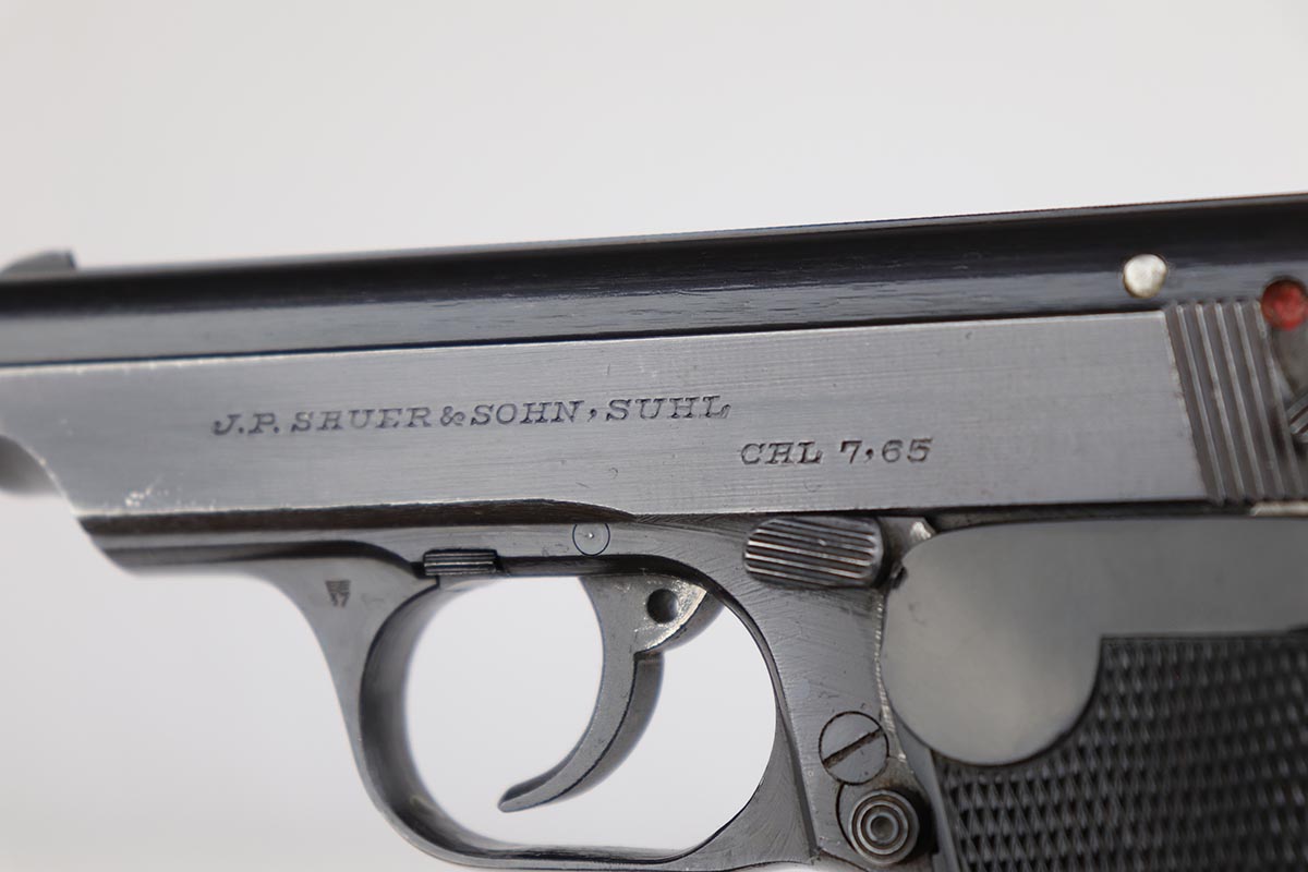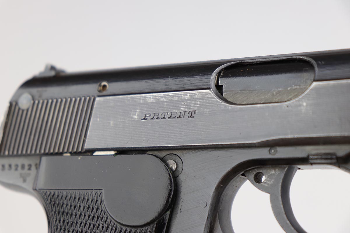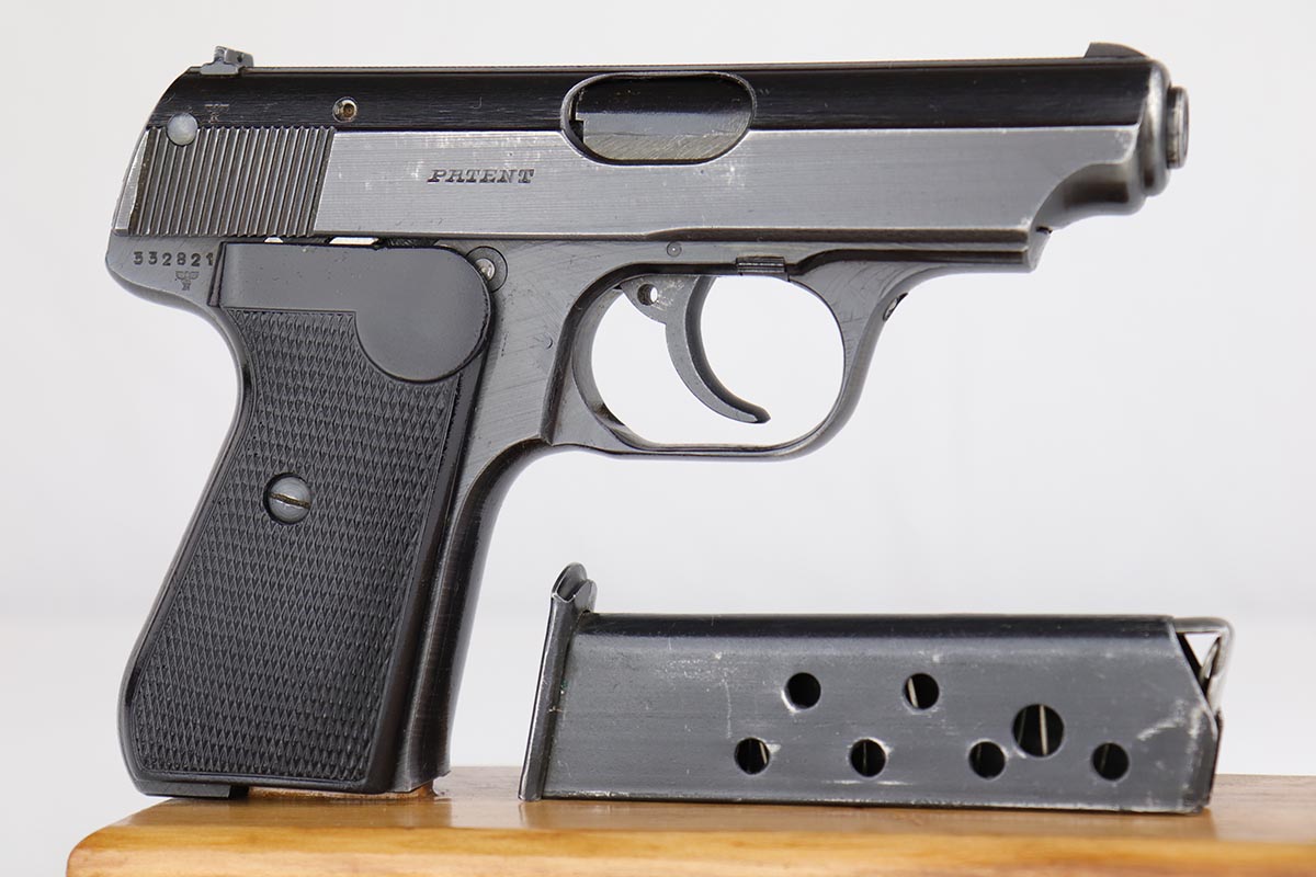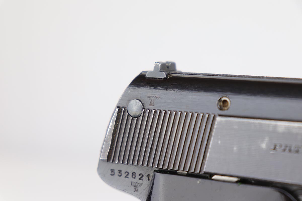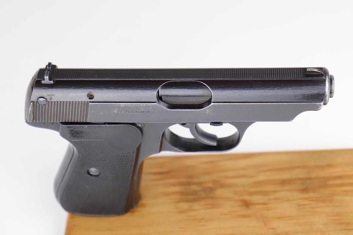 6/21/19 – This is a very nice example of an original and matching Sauer 38h that was issued to the German Army. The military style blue rates at 96-97% with the largest area of finish loss on the trigger guard. There’s also very minor wear on both sides of the slide. Nice grips, though the left panel has a small chip in the corner. Half-moon magazine. Minty bore.