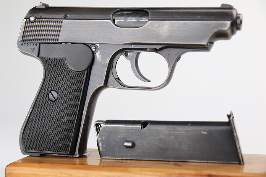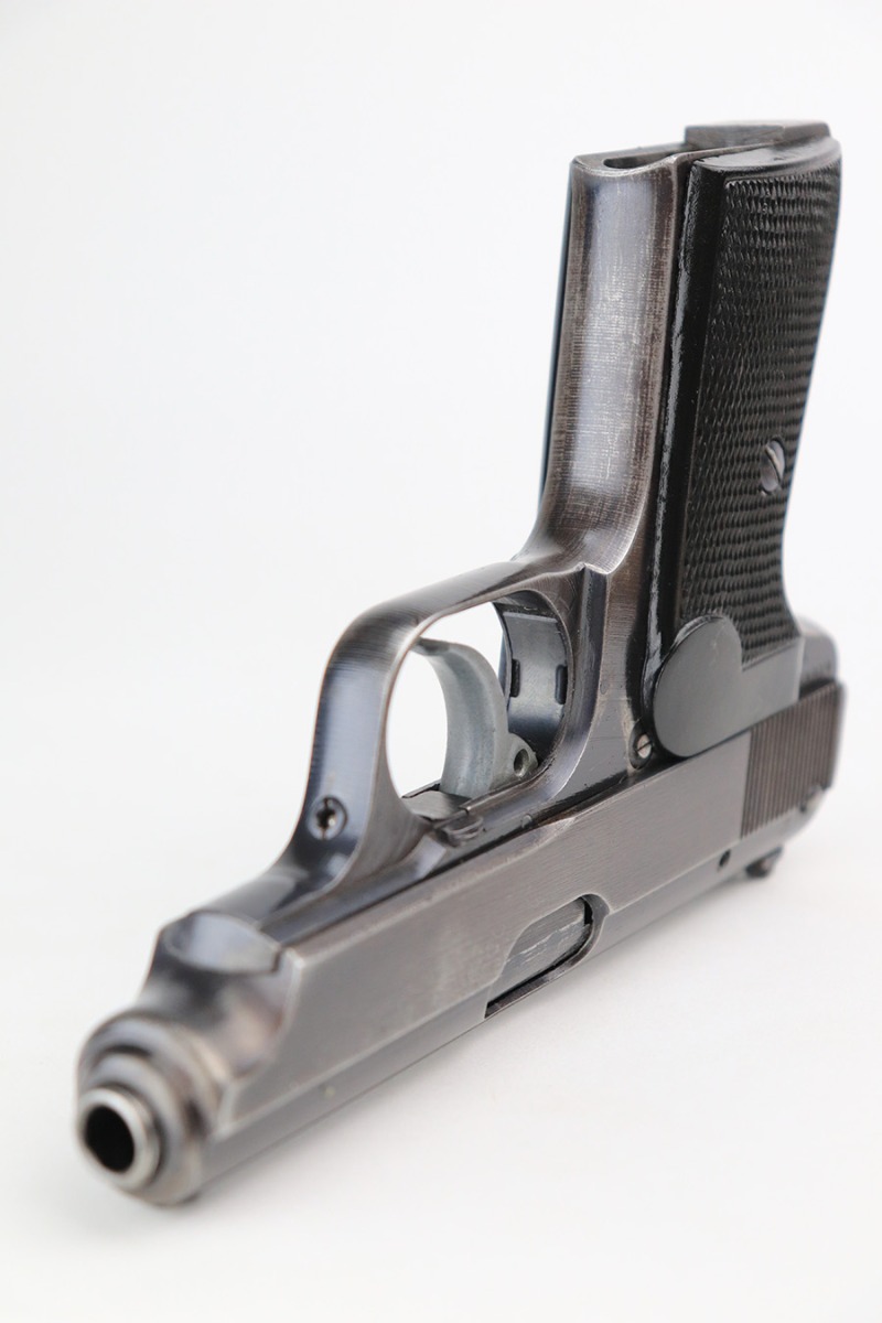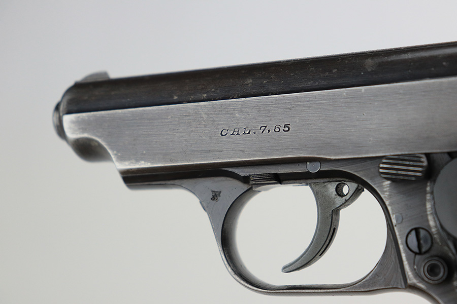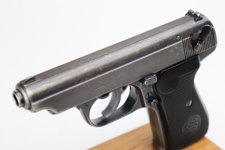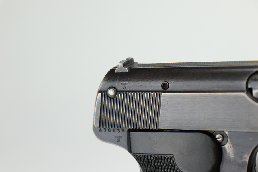 6/7/22 – This is a nice example of a Sauer 38h issued to the Nazi military during WW2. It is all matching and has the proper “Eagle 37” military acceptance proof on the left side of the trigger guard. This one is a little difficult to rate, because it has an inherently thin wartime finish. In any case, we estimate that it has retained about 80% of its bluing. Most of the wear is on the grip straps, but there is also muzzle wear, minor wear around the high edges of the slide, a series of dots of discoloration along the left side of the slide, and one area of wear on the right side. Comes with excellent black bakelite grips and one proper magazine. Mint bore.