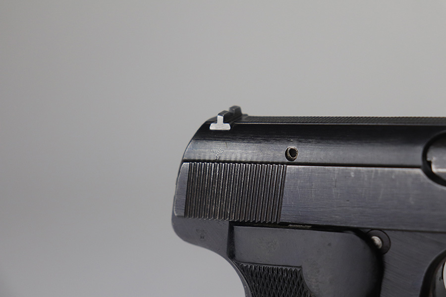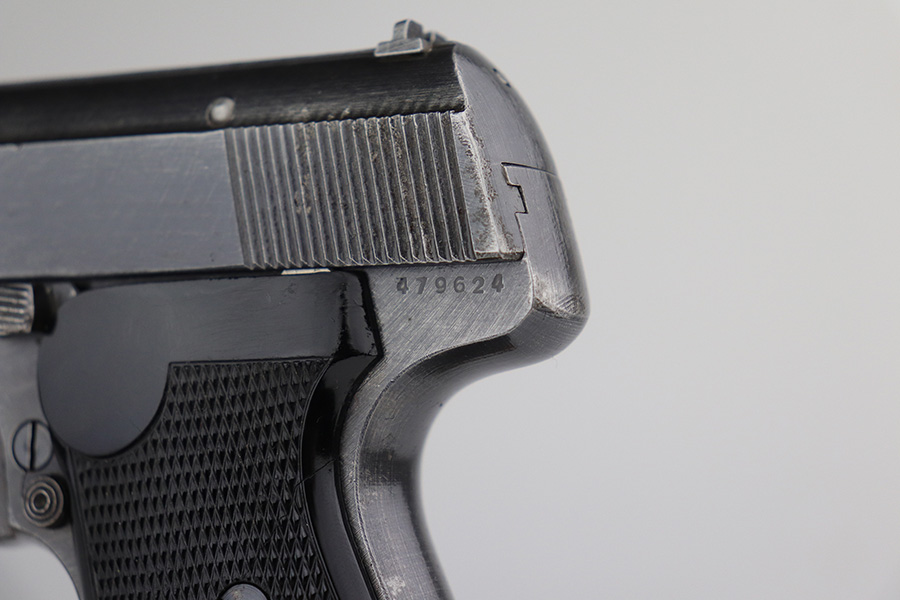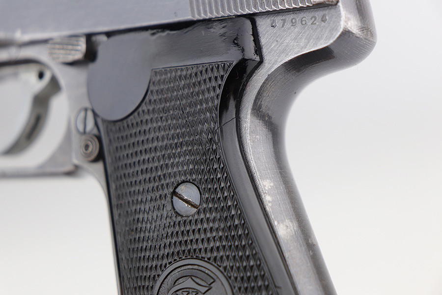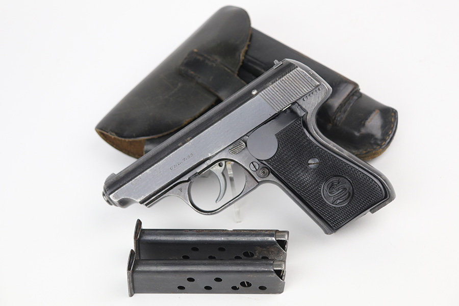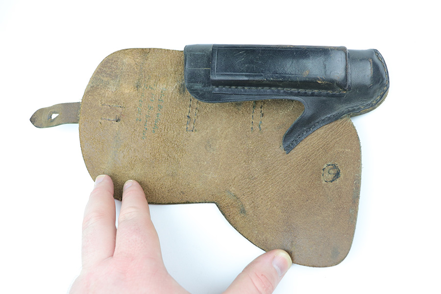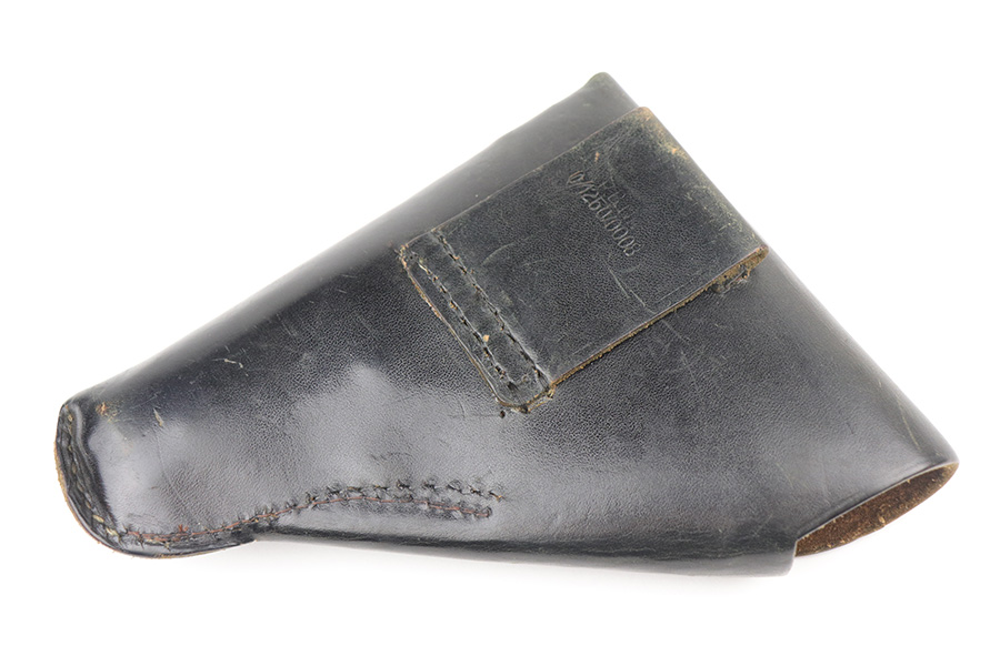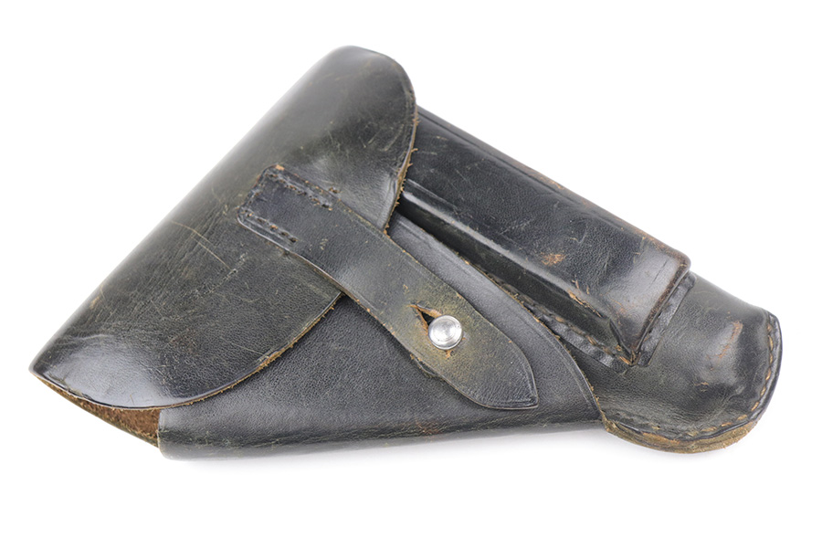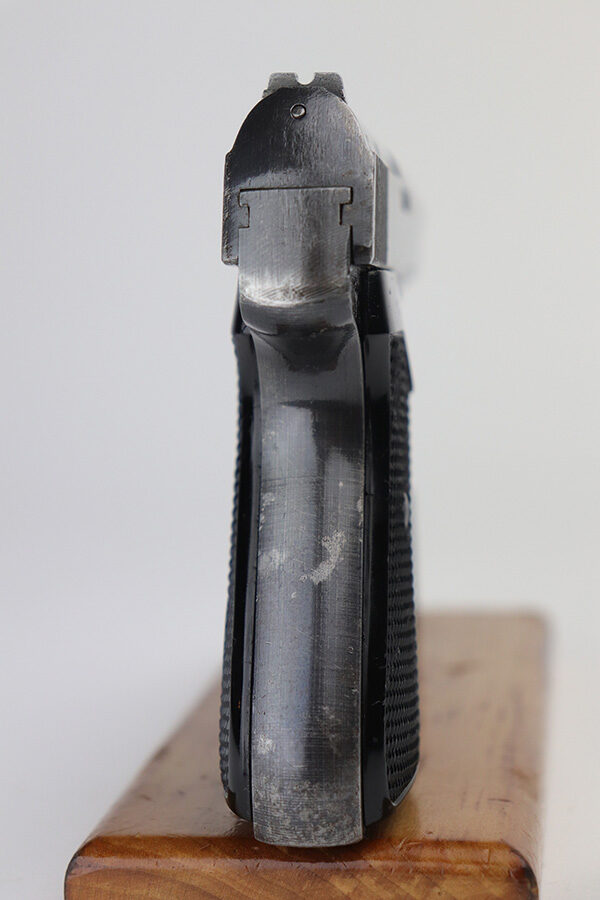 11/17/21 – This is a nice example of a Sauer 38h issued to the Nazi military during WW2. It is all matching and has the proper “Eagle 37” Nazi military acceptance proof on the left side of the trigger guard. It comes as a rig with two period-correct magazines and a post-war black leather holster. The gun has retained about 91-92% of its original military finish. There is some minor thinning on the slide, but the most obvious signs of finish loss are areas of splotchy discoloration on both grip straps and both sides of the slide (more noticeable on the left side). There are some small areas of minor pitting on the left side of the slide, around the muzzle, and on the front strap. Areas of light scratching on both sides of the slide. Some freckling on the bottom of the frame. Comes with very nice period-correct grips – hairline crack in the left panel. The bore is mint.
