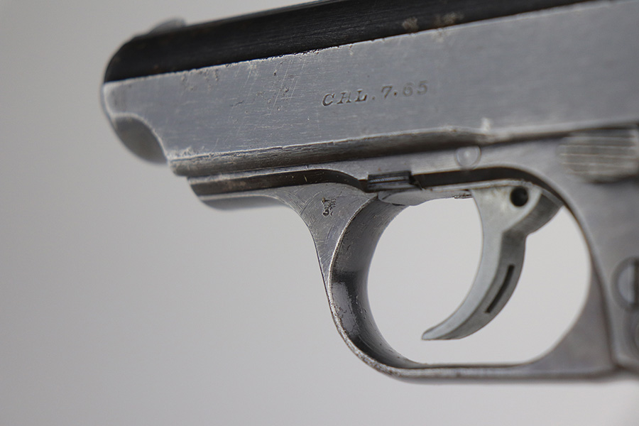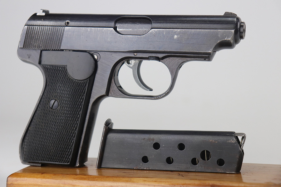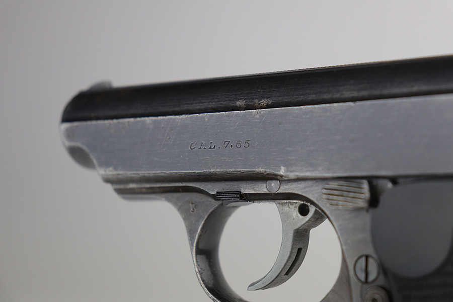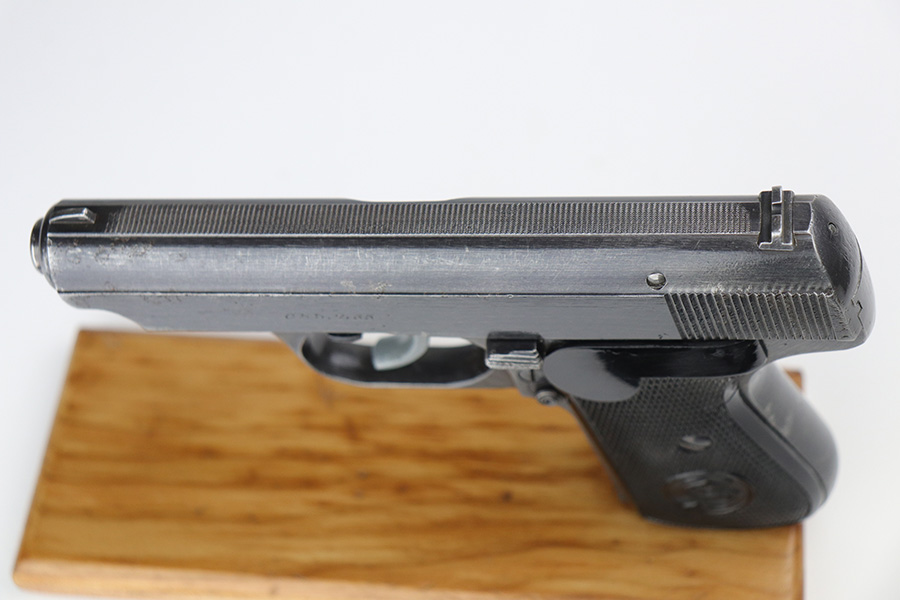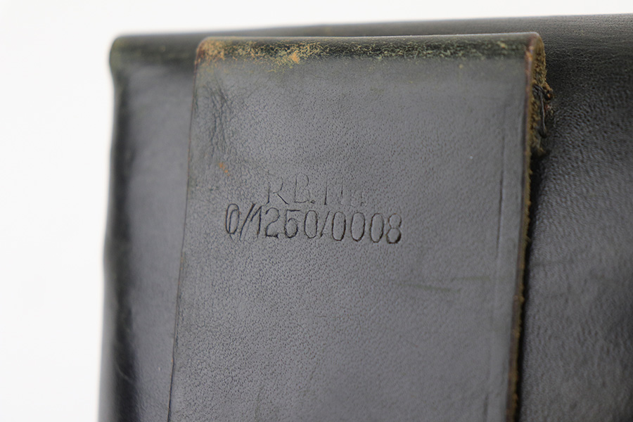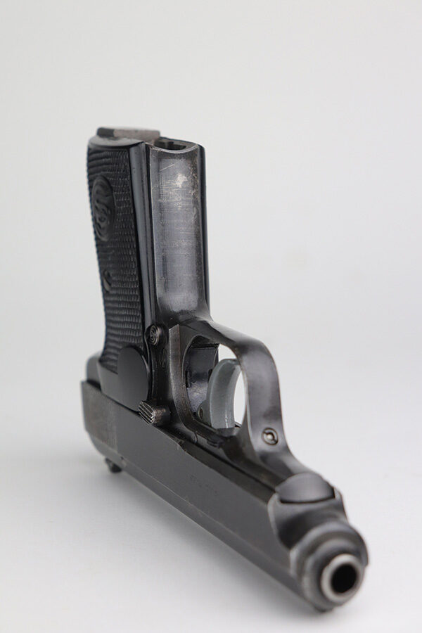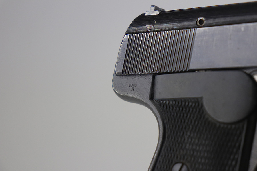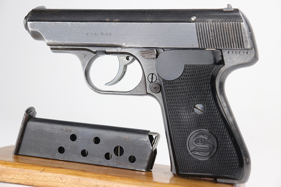 11/17/21 – This is a nice example of a Sauer 38h issued to the Nazi military during WW2. It is all matching and has the proper “Eagle 37” Nazi military acceptance proof on the left side of the trigger guard. It comes as a rig with two period-correct magazines and a post-war black leather holster. The gun has retained about 91-92% of its original military finish. There is some minor thinning on the slide, but the most obvious signs of finish loss are areas of splotchy discoloration on both grip straps and both sides of the slide (more noticeable on the left side). There are some small areas of minor pitting on the left side of the slide, around the muzzle, and on the front strap. Areas of light scratching on both sides of the slide. Some freckling on the bottom of the frame. Comes with very nice period-correct grips – hairline crack in the left panel. The bore is mint.