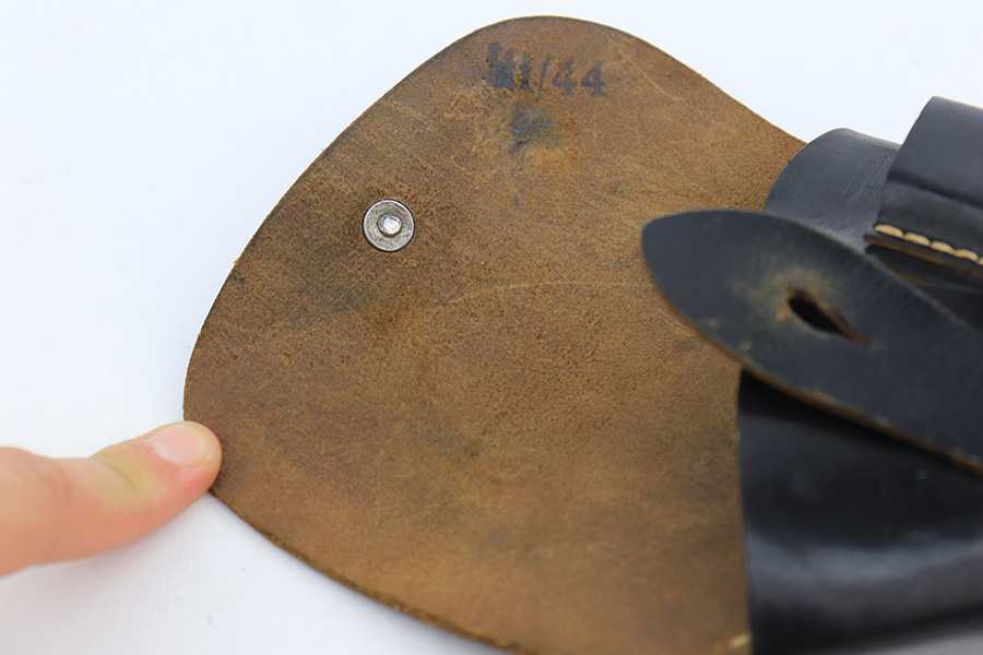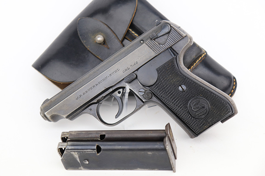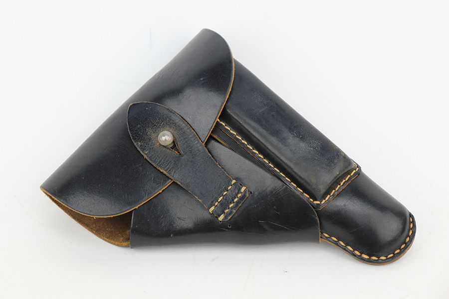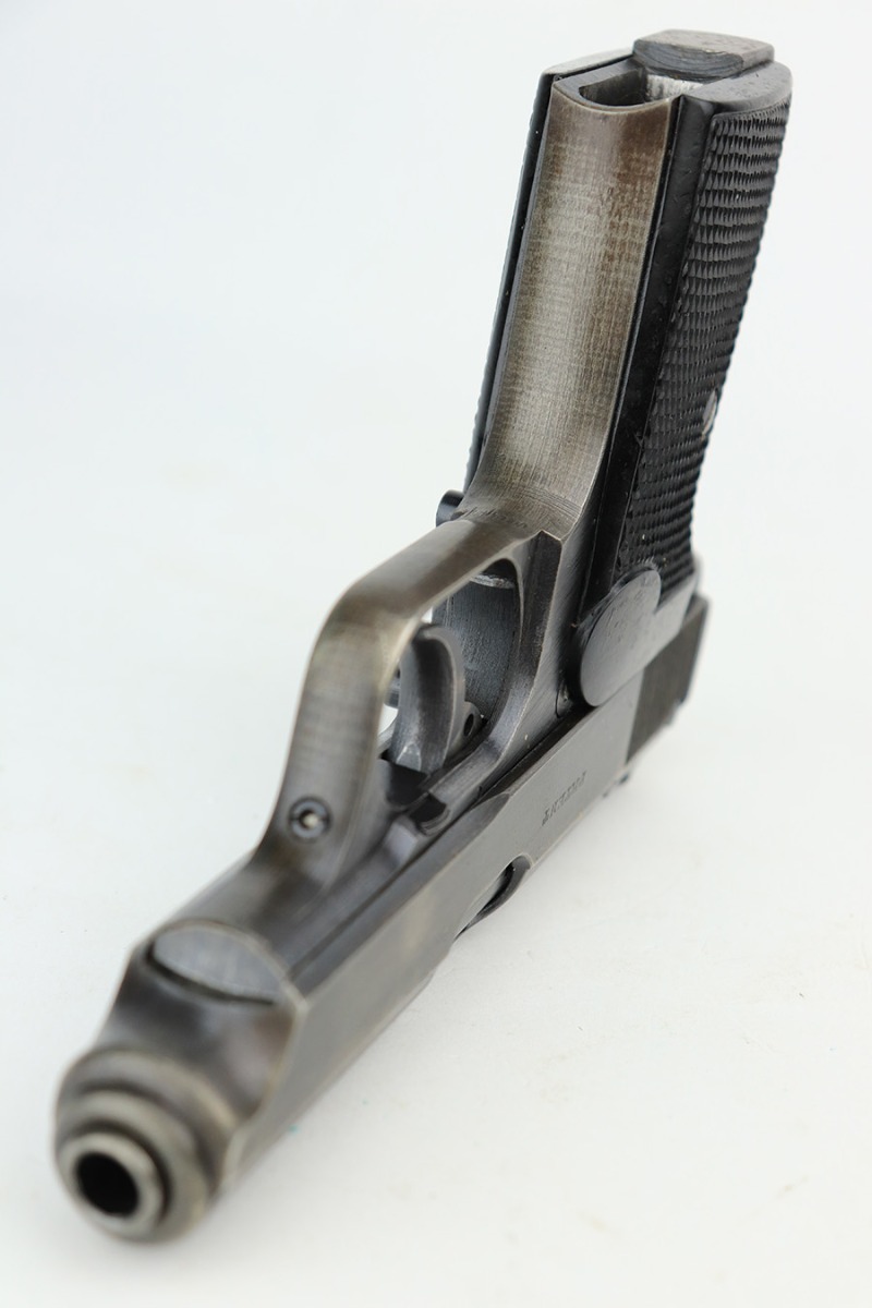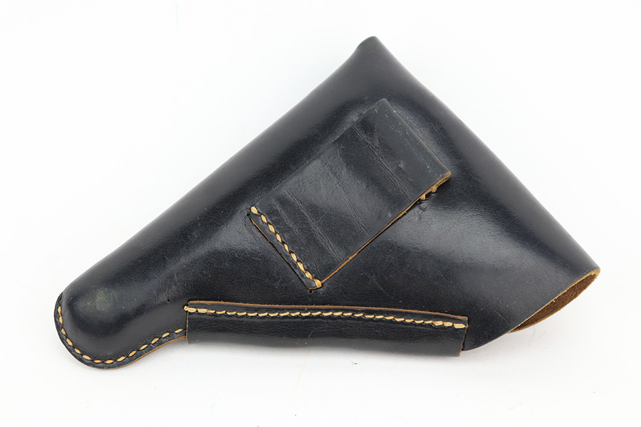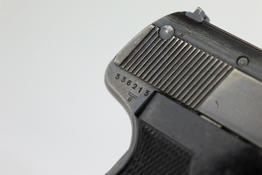 4/13/23 – This is a very nice example of a Sauer 38h issued to the Nazi Army during WW2. All matching with the proper “Eagle 37” military acceptance proof on the left side of the trigger guard. This is likely a mid-war example, as evidenced by the full slide logo and early style magazines. It comes as a complete rig with a minty 1944-dated black leather holster and two correct “double S” marked magazines. The gun has retained about 93% of its finish with minor thinning on the grip straps, minor wear around the high edges in general, and a couple of small spots of wear on the right side of the slide. Excellent period-correct black bakelite grips. Mint bore.