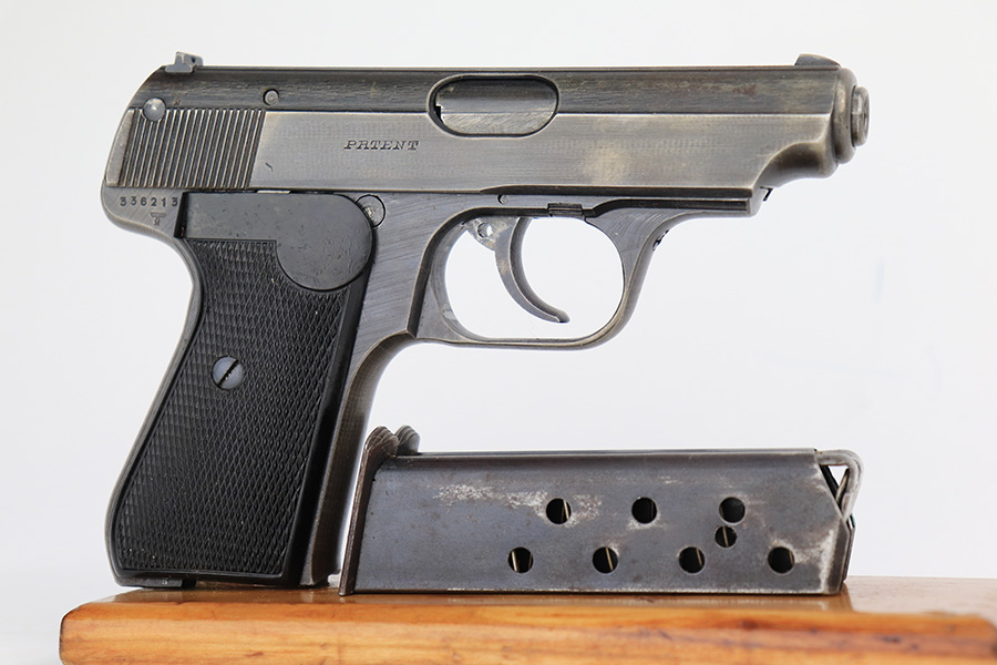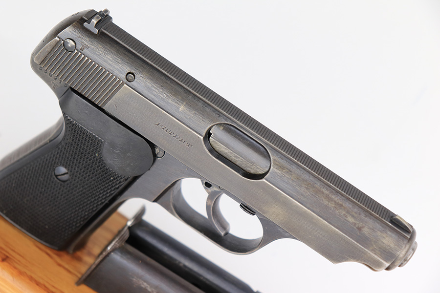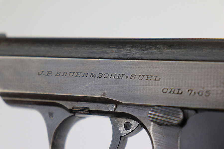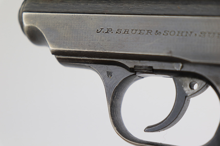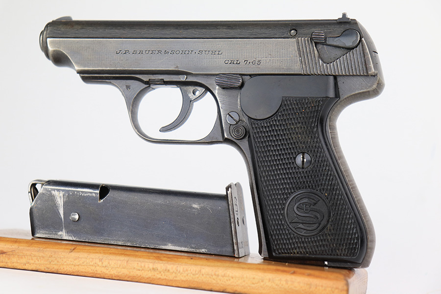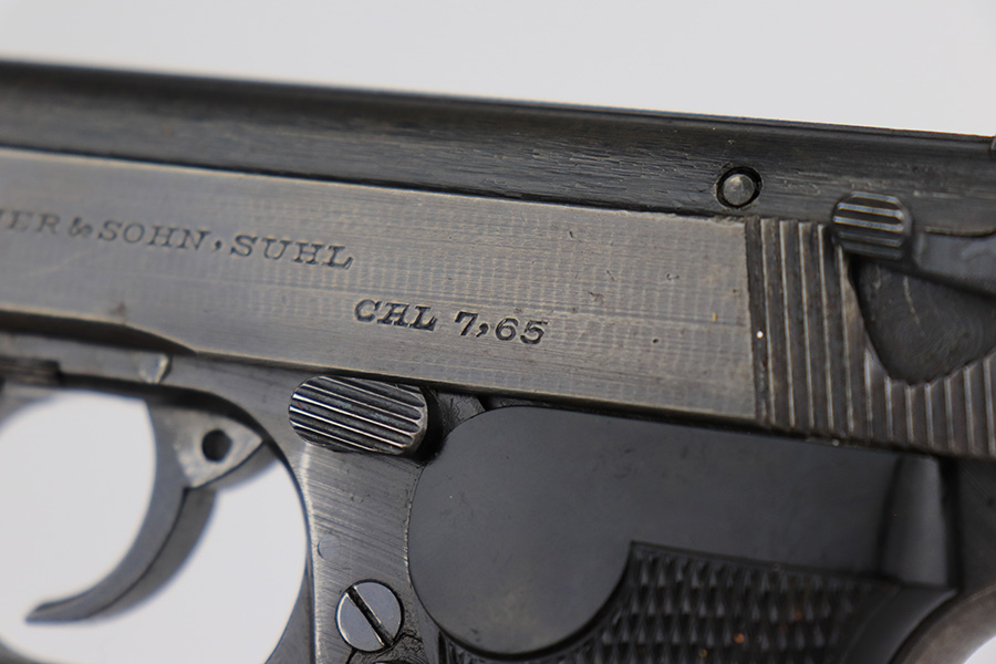 4/13/23 – This is a very nice example of a Sauer 38h issued to the Nazi Army during WW2. All matching with the proper “Eagle 37” military acceptance proof on the left side of the trigger guard. This is likely a mid-war example, as evidenced by the full slide logo and early style magazines. It comes as a complete rig with a minty 1944-dated black leather holster and two correct “double S” marked magazines. The gun has retained about 93% of its finish with minor thinning on the grip straps, minor wear around the high edges in general, and a couple of small spots of wear on the right side of the slide. Excellent period-correct black bakelite grips. Mint bore.