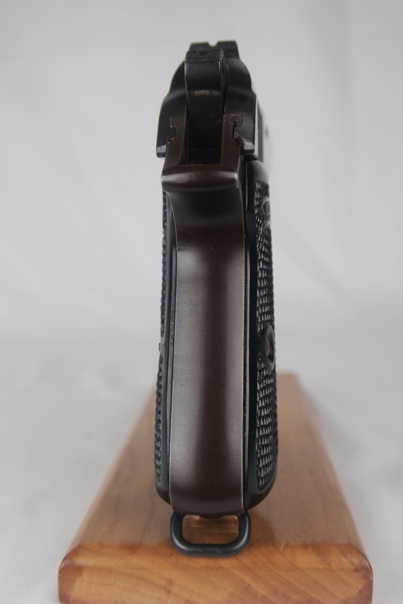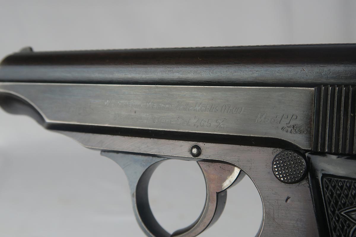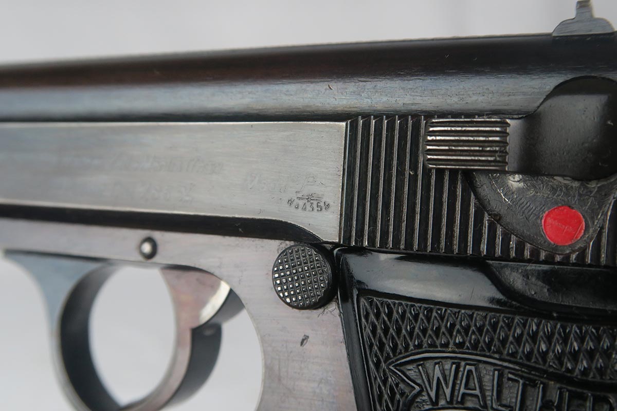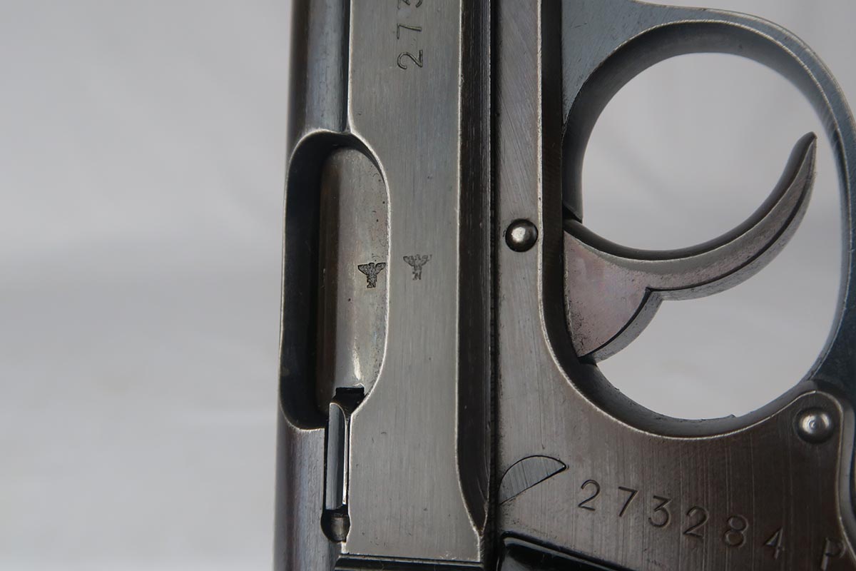 7/28/17 – This is an army-issued Walther PP from 1942-43. It is all matching and original, aside from the lanyard which would’ve been added later. The finish is tough to rate as there is very little actual wear but the entire pistol has visible browning coming through. Slide and frame are waffen proofed. Eagle/N proofs and 60 degree safety. Excellent grips. Bore is decently frosted but no major pitting or corrosion.