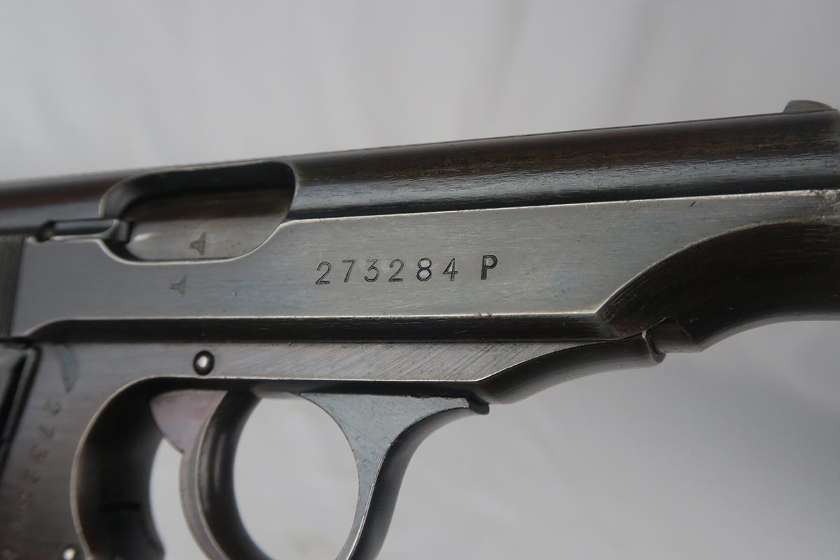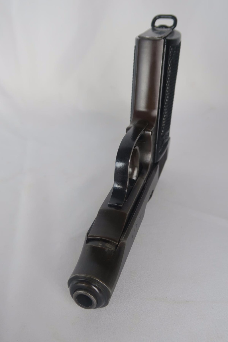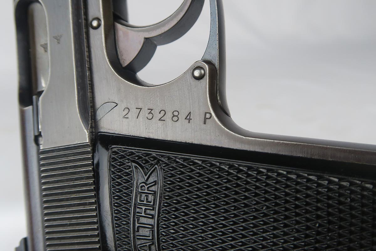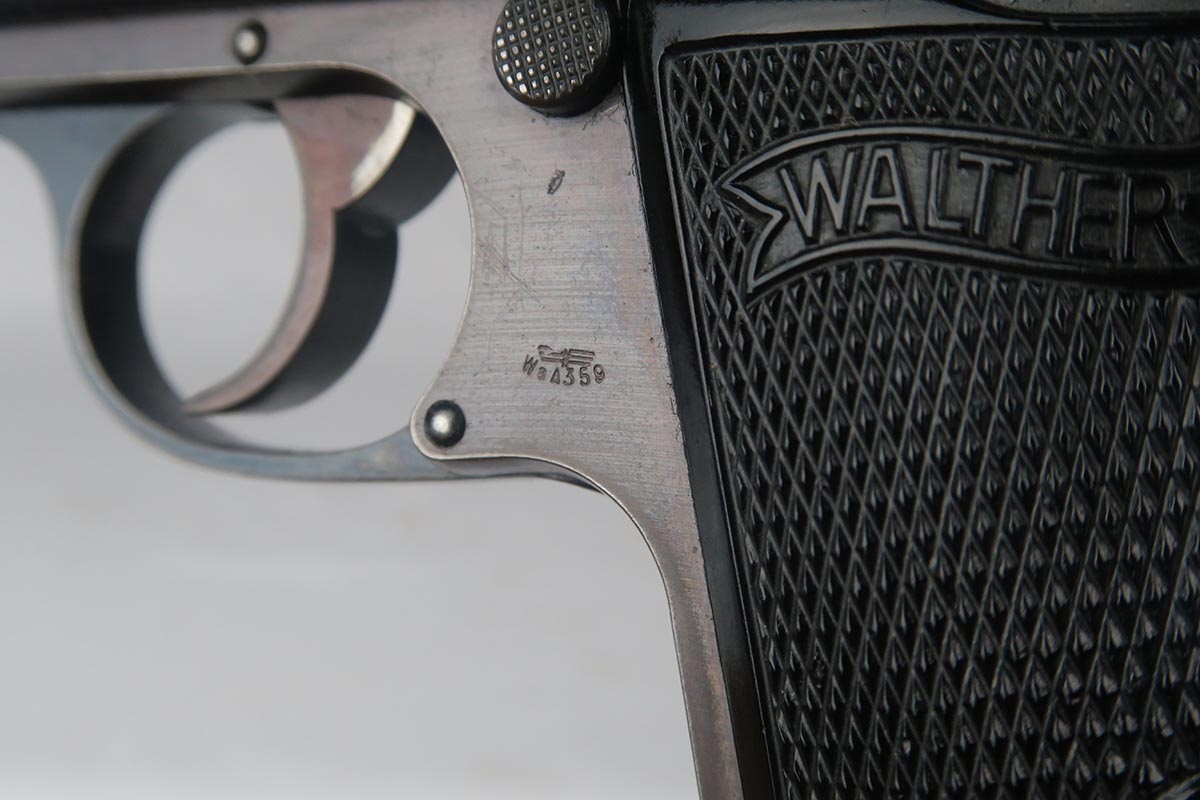 7/28/17 – This is an army-issued Walther PP from 1942-43. It is all matching and original, aside from the lanyard which would’ve been added later. The finish is tough to rate as there is very little actual wear but the entire pistol has visible browning coming through. Slide and frame are waffen proofed. Eagle/N proofs and 60 degree safety. Excellent grips. Bore is decently frosted but no major pitting or corrosion.