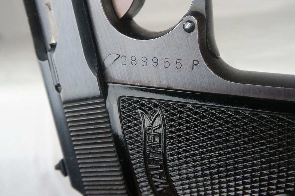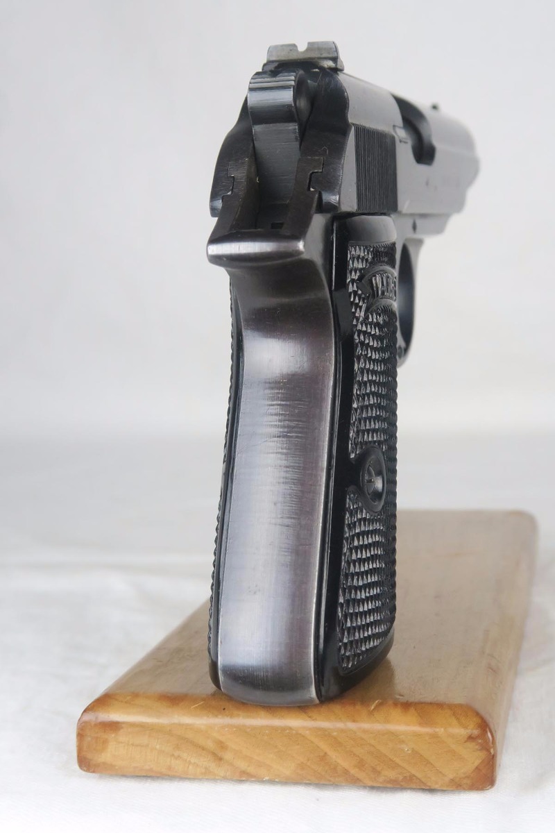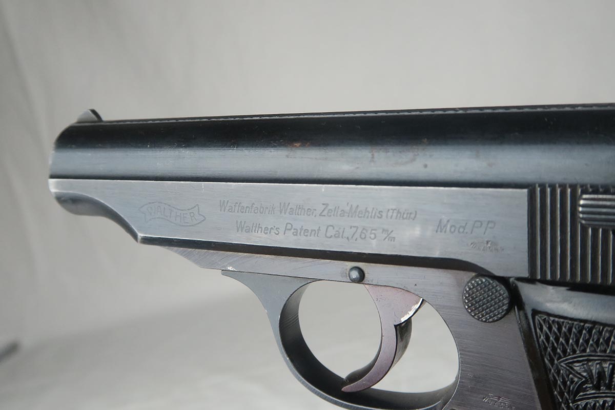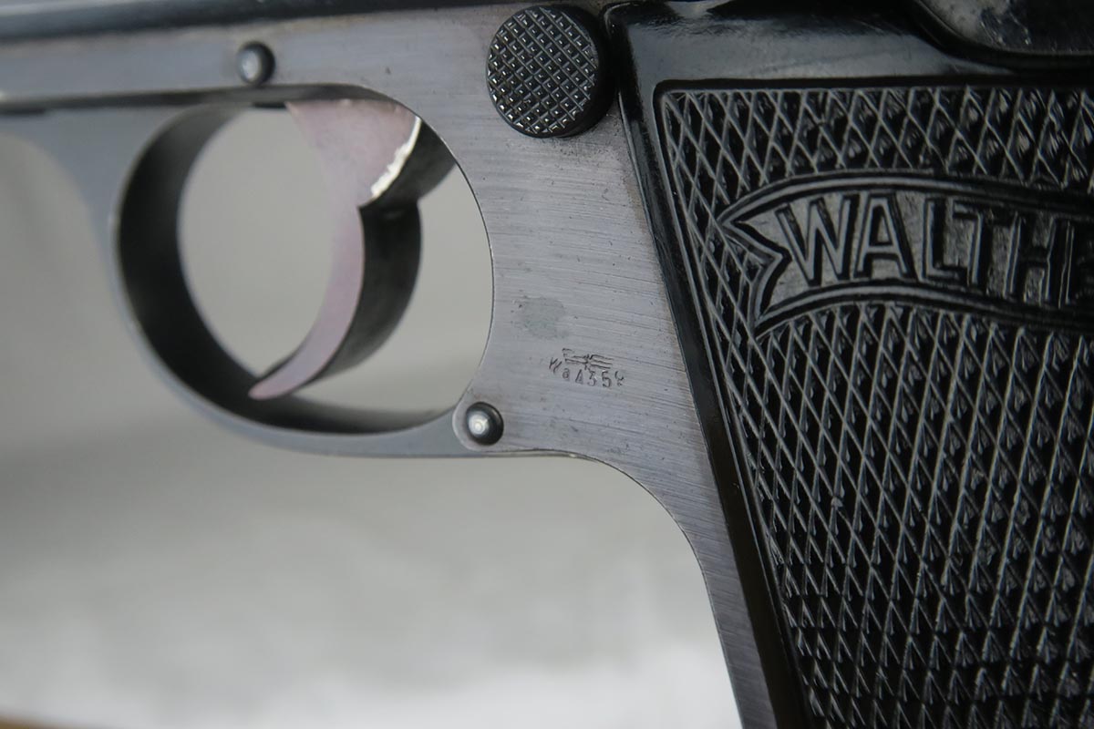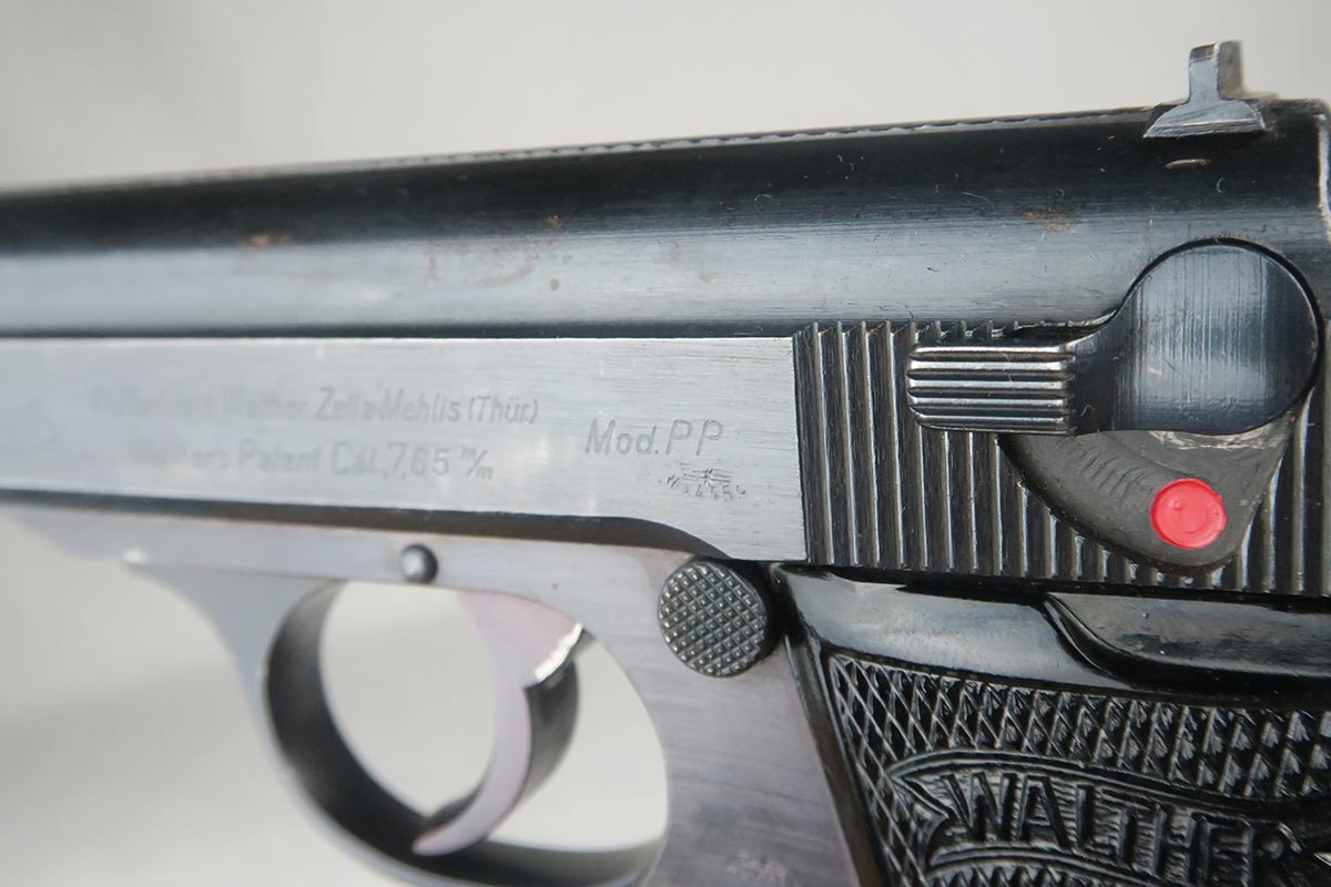 12/12/17 – This is a very nice and original Walther PP that was issued to the German Army during the war.  It is WaA359 proofed on slide and frame, and the finish rates at about 95-96%.  There’s some finish loss on high edges and the trigger guard, and the straps have a thinner blue color to them.  Excellent black plastic grips with no chips or cracks.  Minty bore.