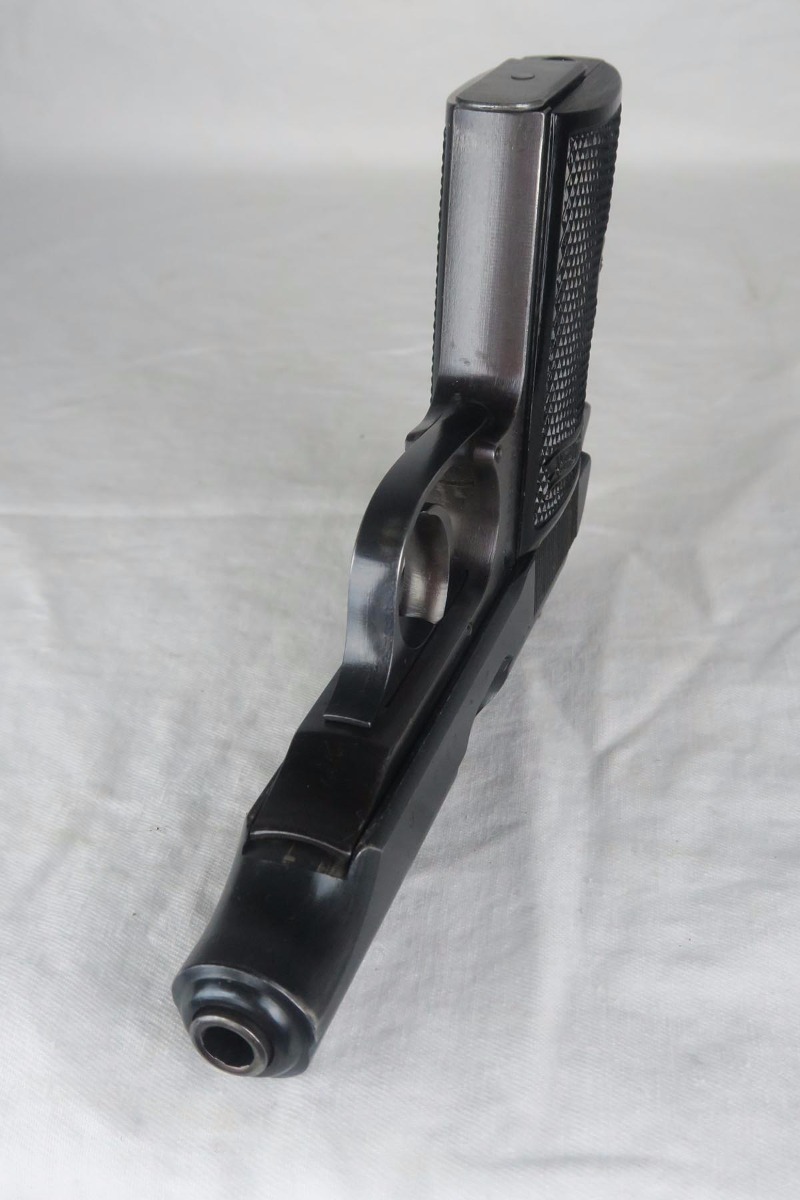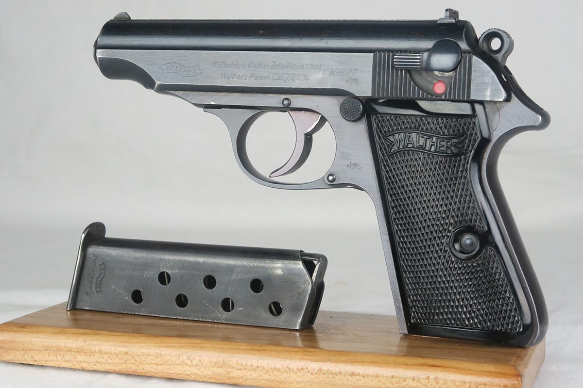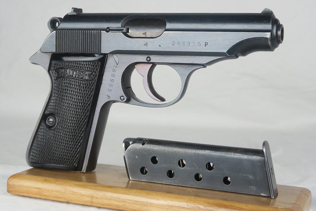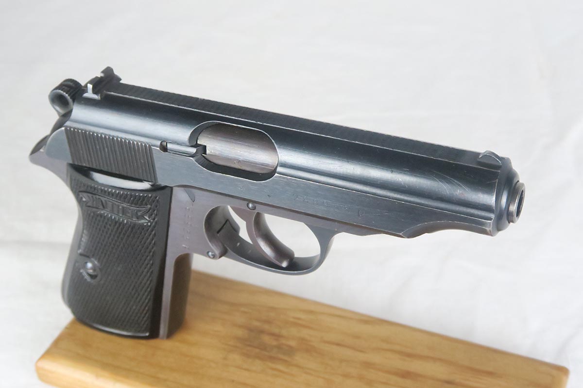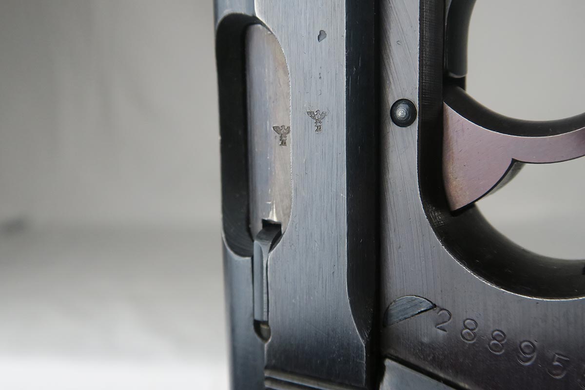 12/12/17 – This is a very nice and original Walther PP that was issued to the German Army during the war.  It is WaA359 proofed on slide and frame, and the finish rates at about 95-96%.  There’s some finish loss on high edges and the trigger guard, and the straps have a thinner blue color to them.  Excellent black plastic grips with no chips or cracks.  Minty bore.