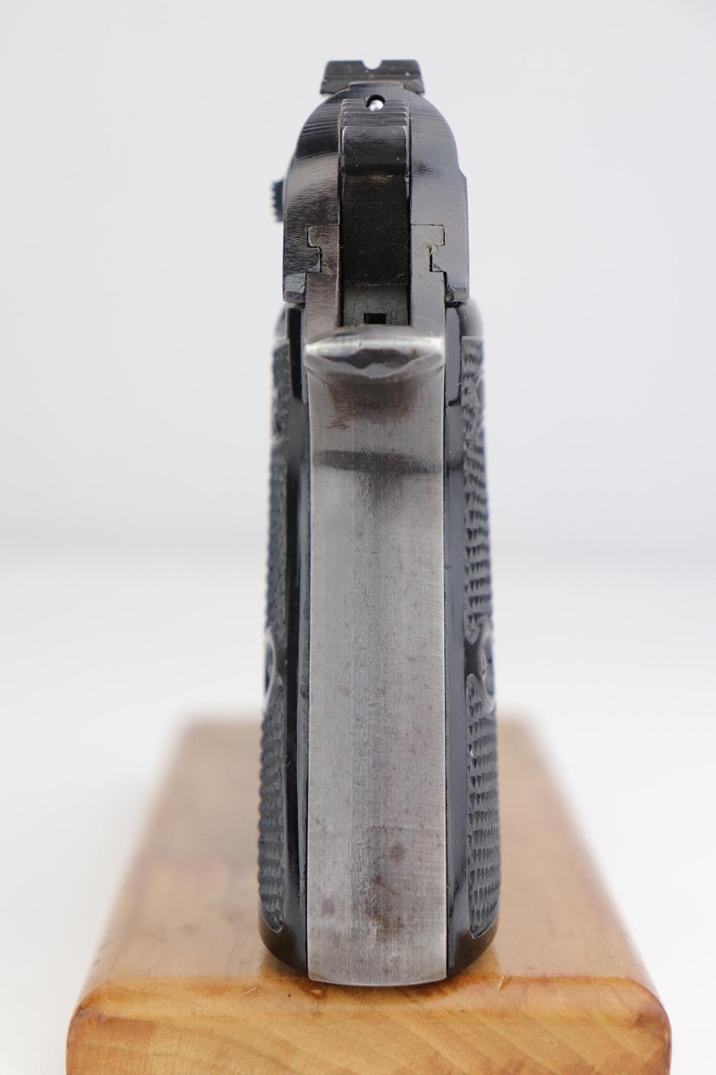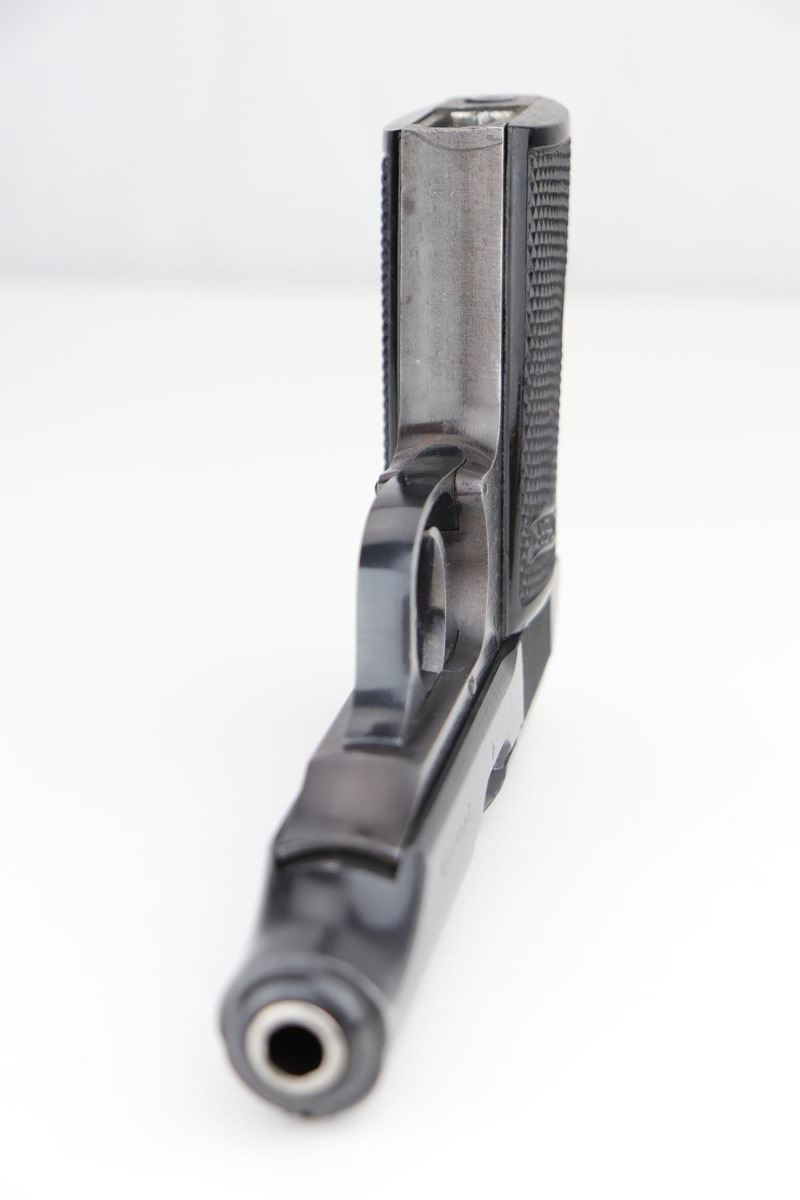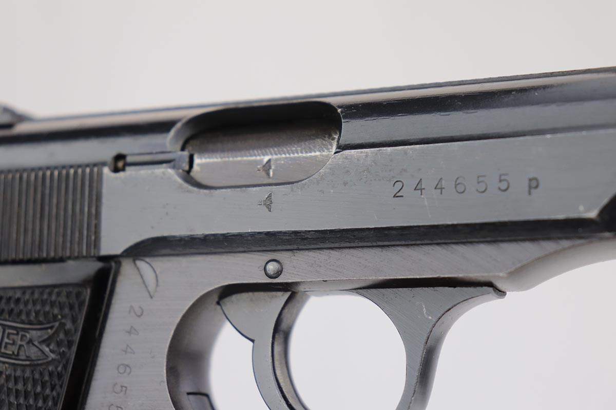 It is chambered for 7.65mm. The frame and slide have the proper “Eagle 359” waffen proofs. The barrel and frame are also “Eagle N” proofed. Overall, the gun is in excellent condition. The best aspect of the gun is the profile view, which is outstanding. We rate the bluing around 92-95%. These wartime guns are notoriously difficult to grade. There are machine marks throughout, especially on the round edges of the slide which we would not characterize as “wear”. Most of the finish loss comes in the form of thinning on the straps and very minor high-edge wear. The grips are original and excellent. The gun also comes with a correct wartime Walther magazine. The bore is stunning – shiny with strong rifling. The gun is fully functional. All serial numbers are matching. No import marks. C&R eligible.