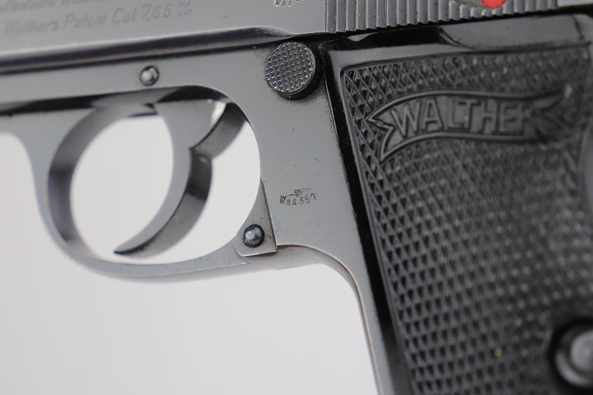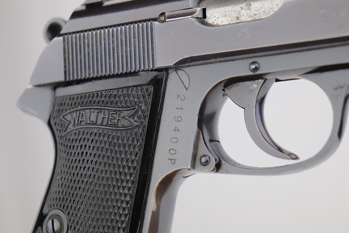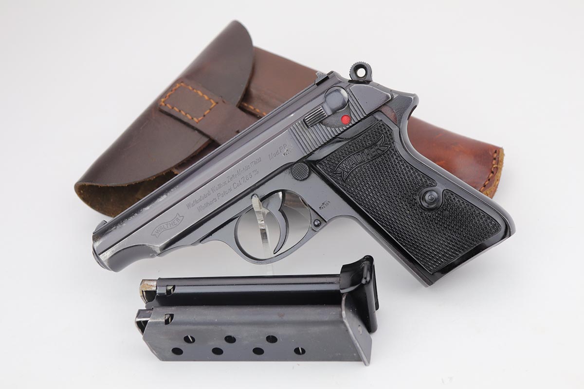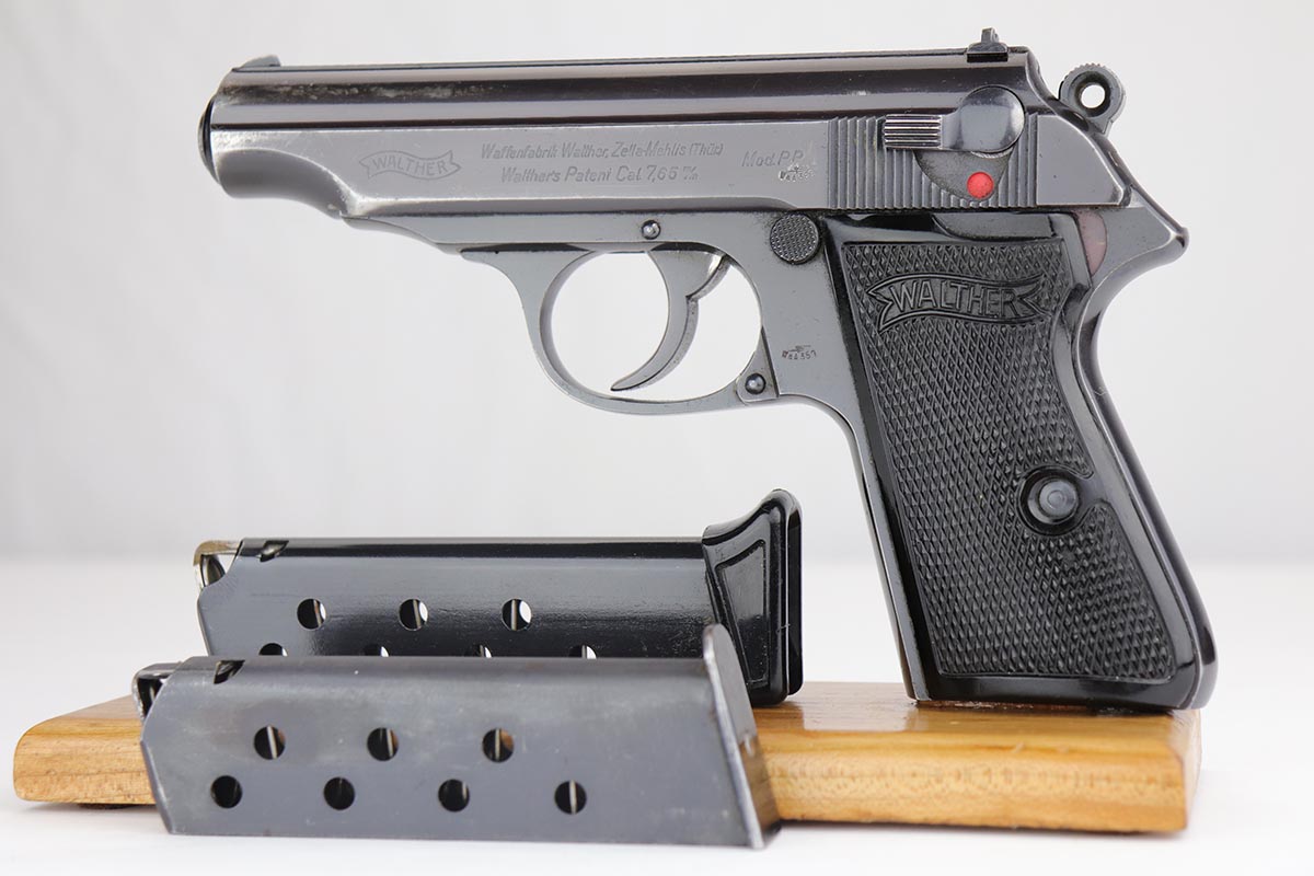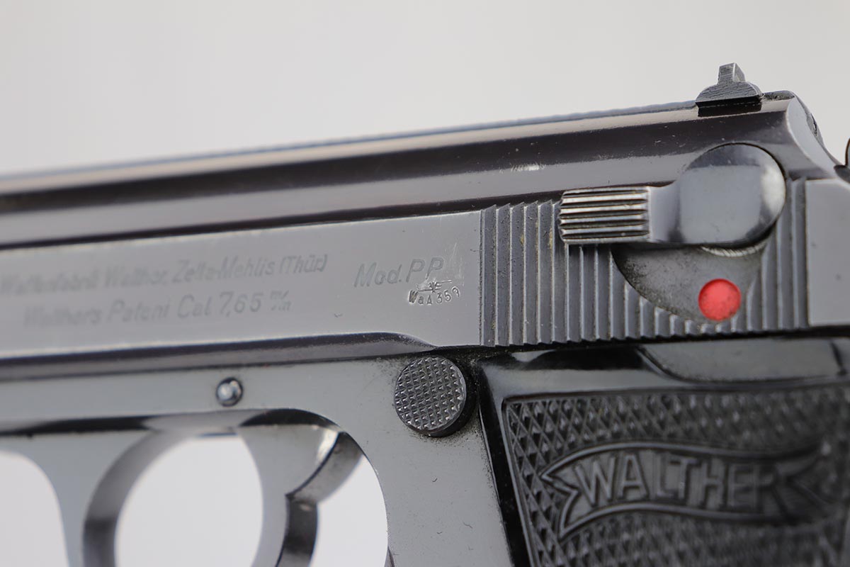 10/18/19 – This is an original Walther PP rig from 1941 that was issued to the Nazi Army, as indicated by the waffenamts on frame and slide. The gun has about 90% of the original, high-polish blue. Majority of the finish loss is on the left side of the slide and the rear strap. The rig includes an original flat-bottom magazine, and a postwar finger extension magazine. Minty bore and excellent grips. Excellent holster with Nazi eagle proof on the front.