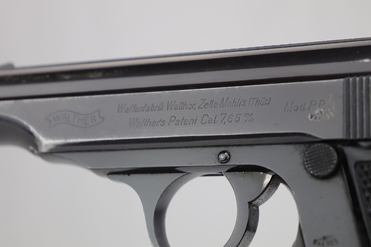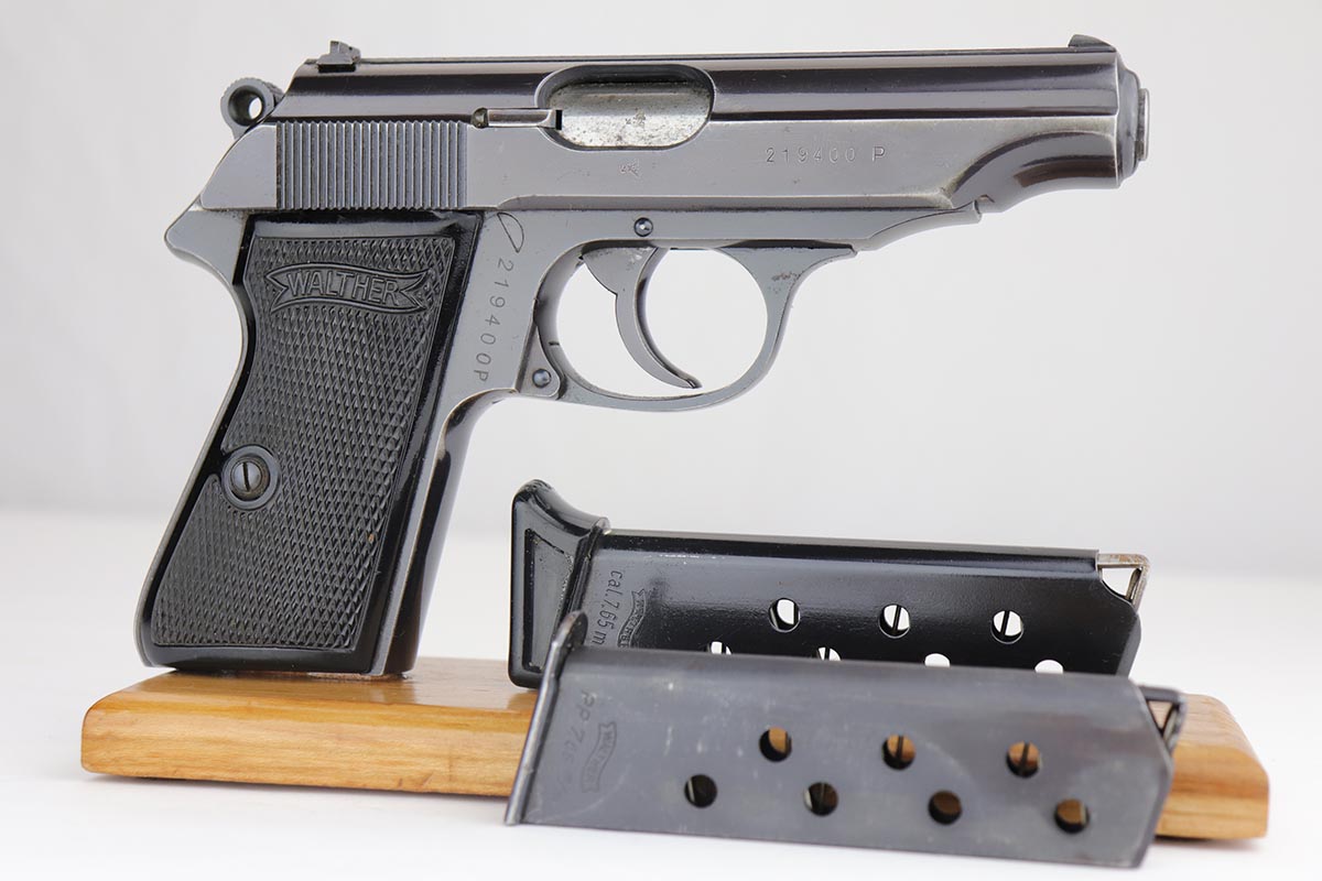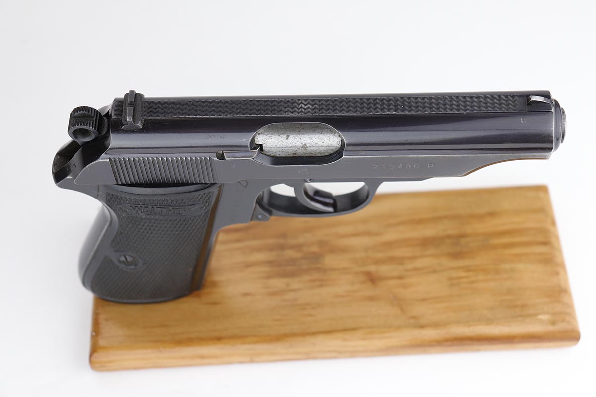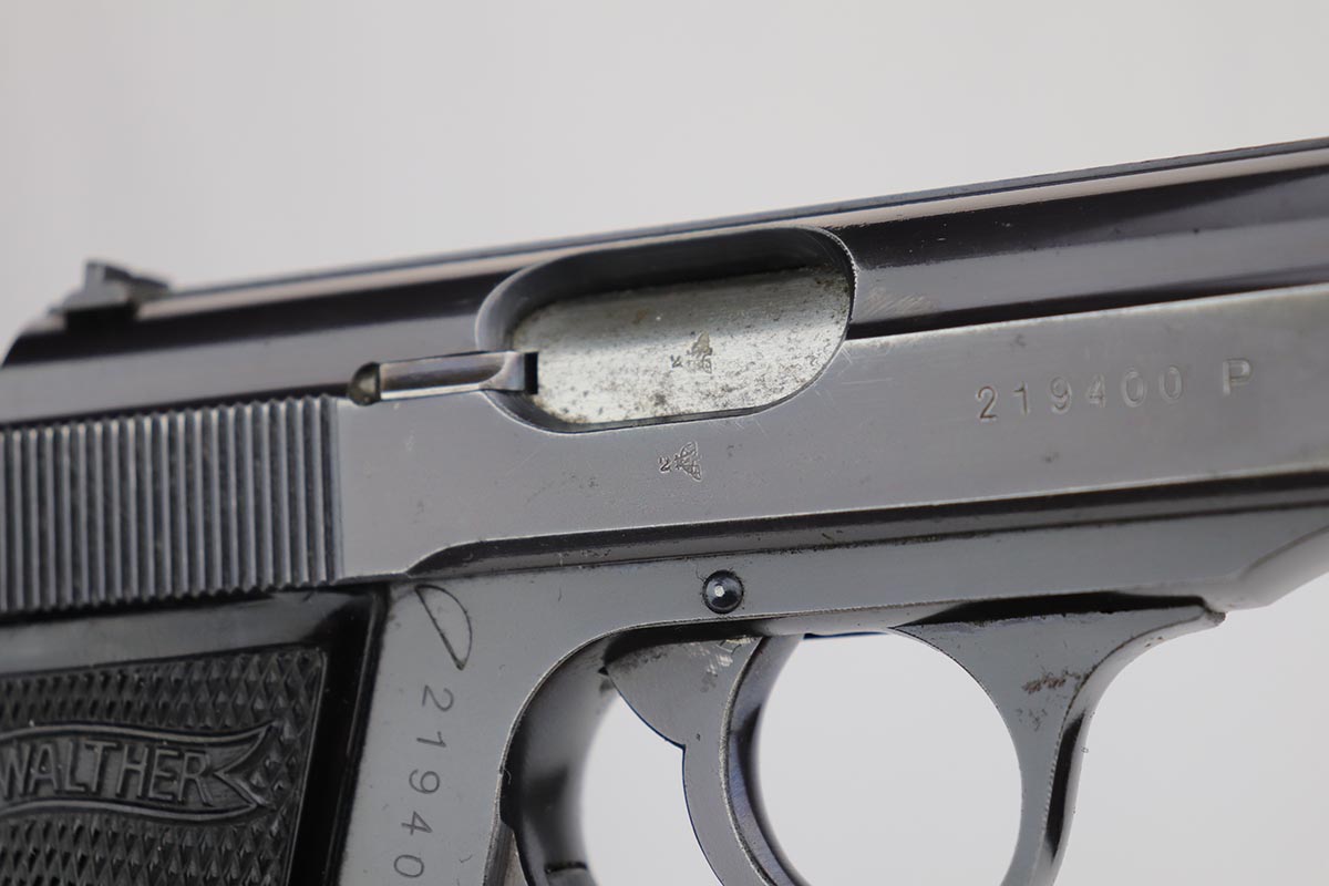 10/18/19 – This is an original Walther PP rig from 1941 that was issued to the Nazi Army, as indicated by the waffenamts on frame and slide. The gun has about 90% of the original, high-polish blue. Majority of the finish loss is on the left side of the slide and the rear strap. The rig includes an original flat-bottom magazine, and a postwar finger extension magazine. Minty bore and excellent grips. Excellent holster with Nazi eagle proof on the front.