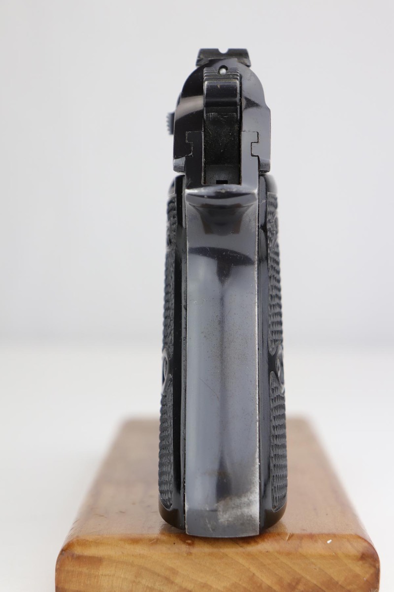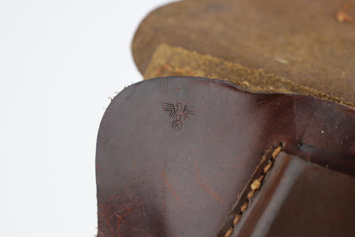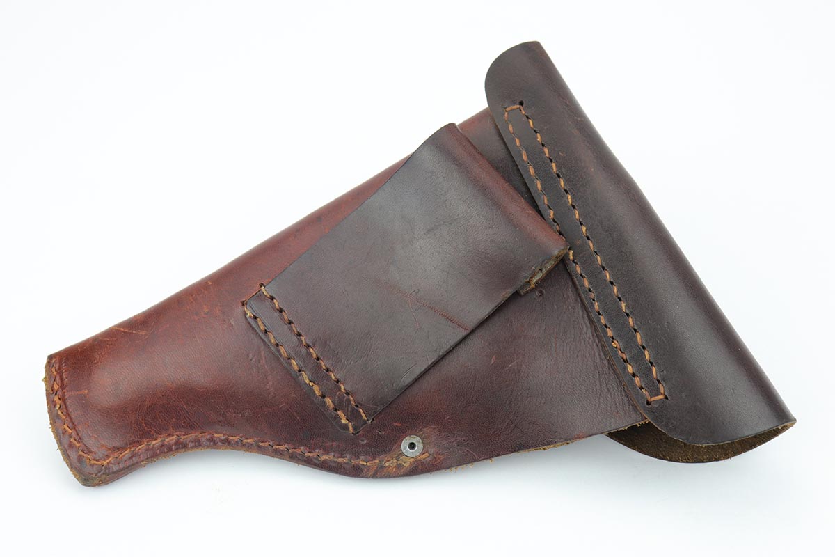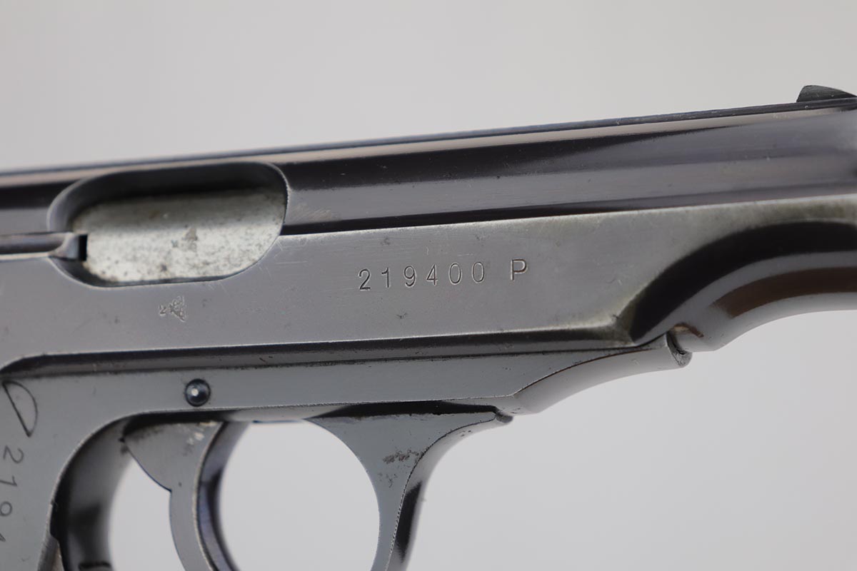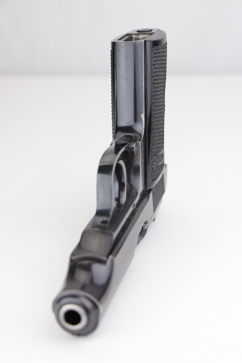 10/18/19 – This is an original Walther PP rig from 1941 that was issued to the Nazi Army, as indicated by the waffenamts on frame and slide. The gun has about 90% of the original, high-polish blue. Majority of the finish loss is on the left side of the slide and the rear strap. The rig includes an original flat-bottom magazine, and a postwar finger extension magazine. Minty bore and excellent grips. Excellent holster with Nazi eagle proof on the front.