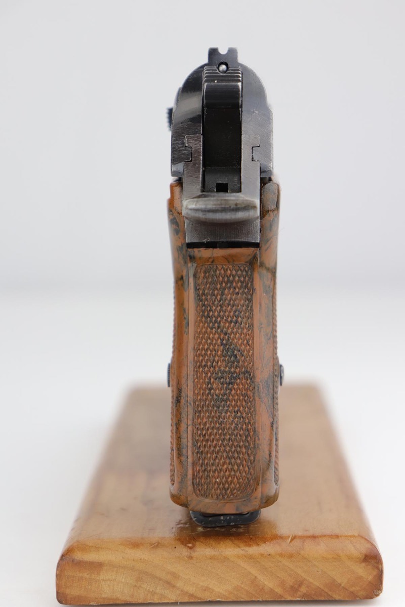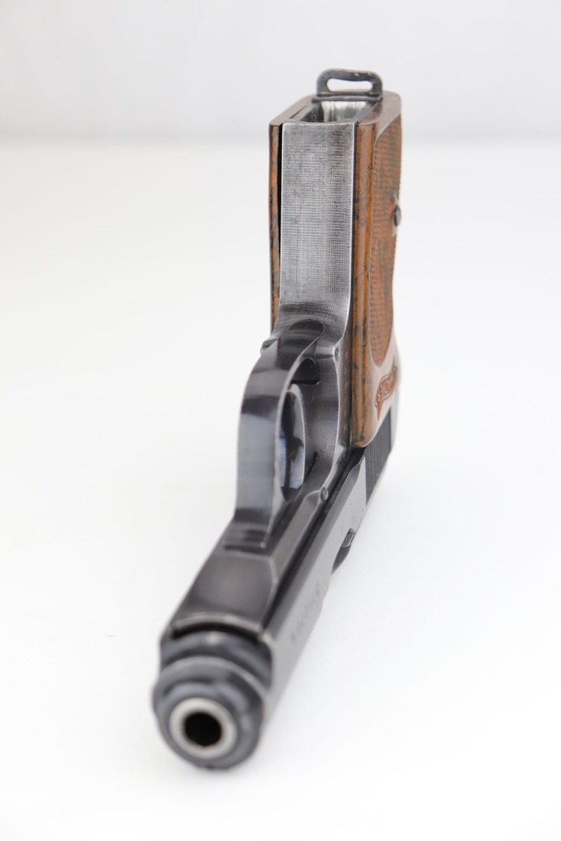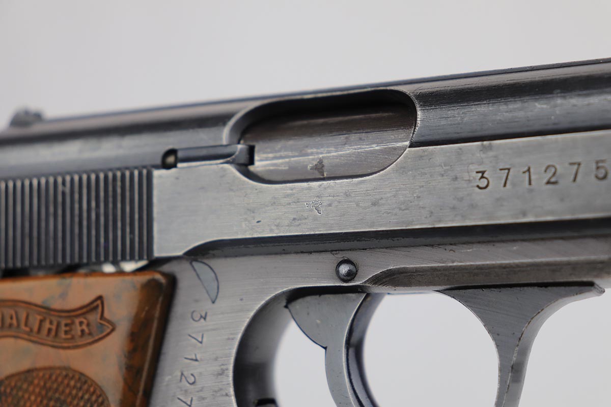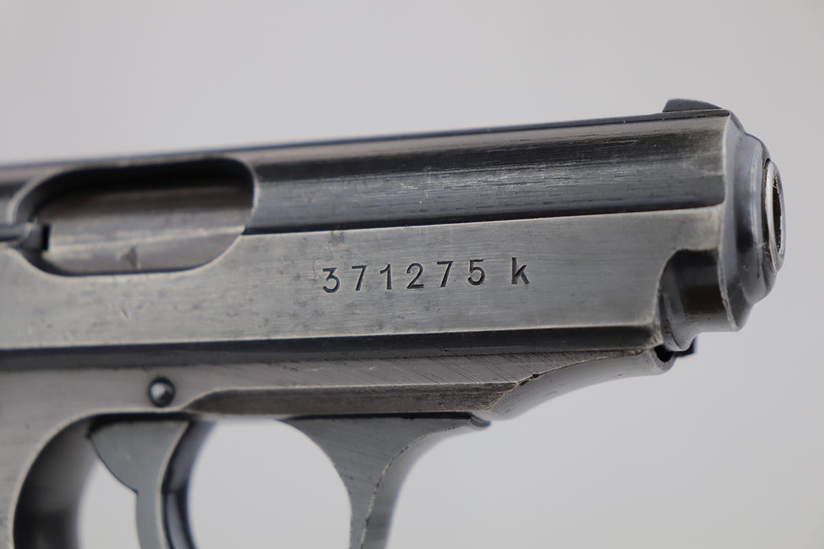 It is chambered for 7.65mm. The frame and slide have the proper “Eagle 359” waffen proofs. The barrel and frame are also “Eagle N” proofed. Overall, the gun is in very nice condition. We rate the bluing around 90%. These wartime guns are notoriously difficult to grade. They are characterized by duller finishes and machine marks, as is true for this piece. There are visible machine marks throughout, which we would not characterize as “wear”. There is minor thinning in the finish throughout, especially on the front strap. There is also some minor freckling on the slide. The brown grip is original and excellent – it is characterized by excellent black and brown color marbling. There is, however, one very thin hairline crack on the right side, adjacent to the Walther banner. The gun also comes with a correct wartime Walther magazine. The bore is beautiful – shiny with strong rifling. The gun is fully functional. All serial numbers are matching. No import marks. C&R eligible.