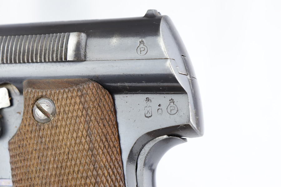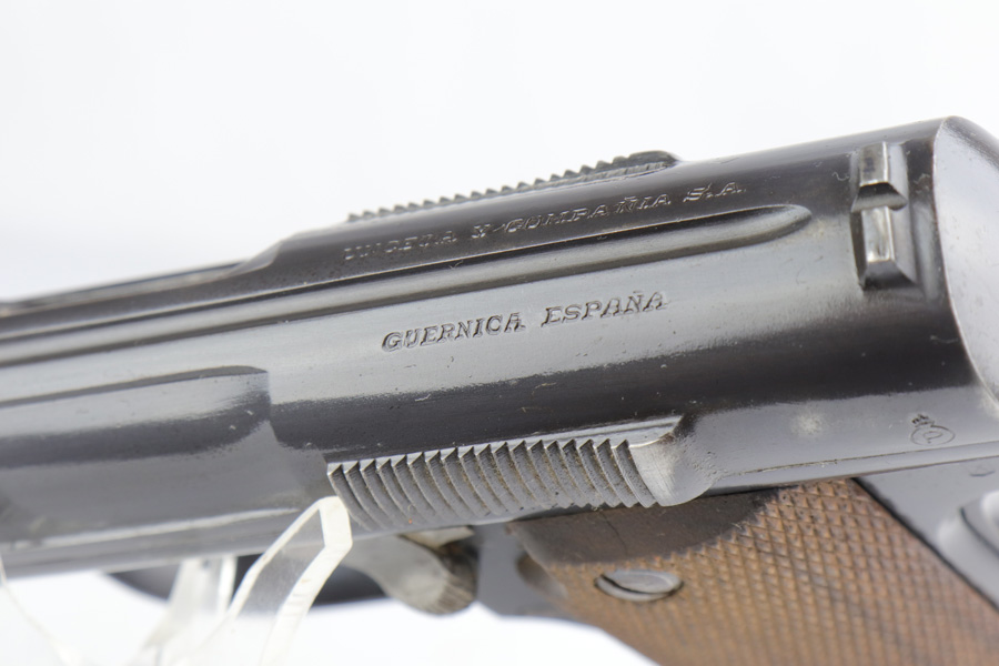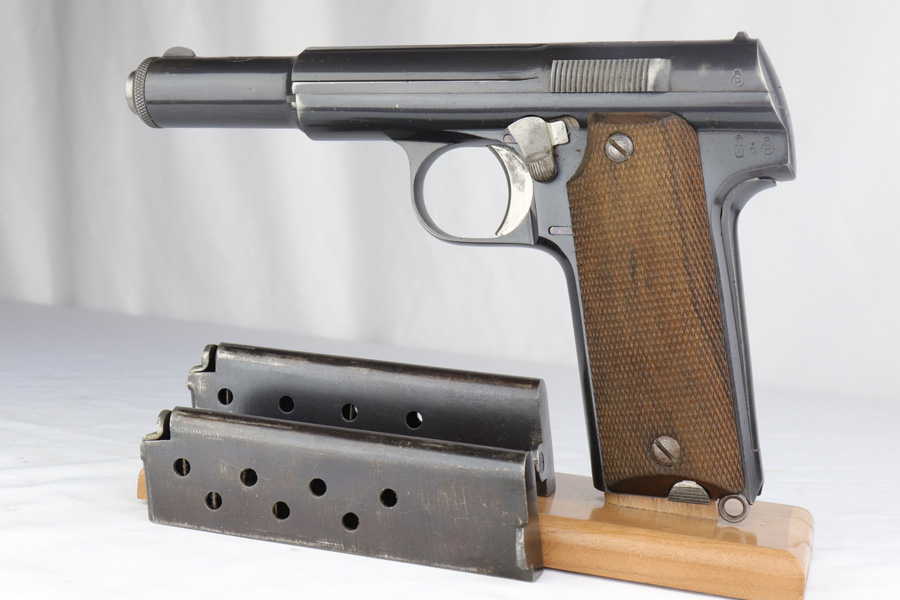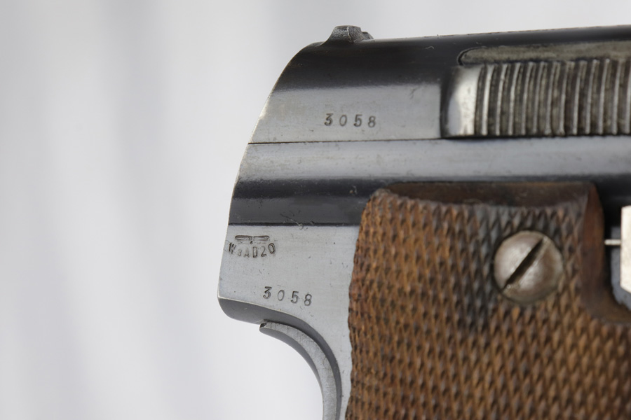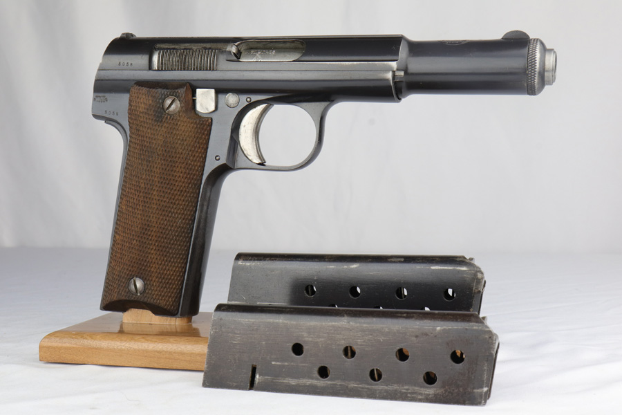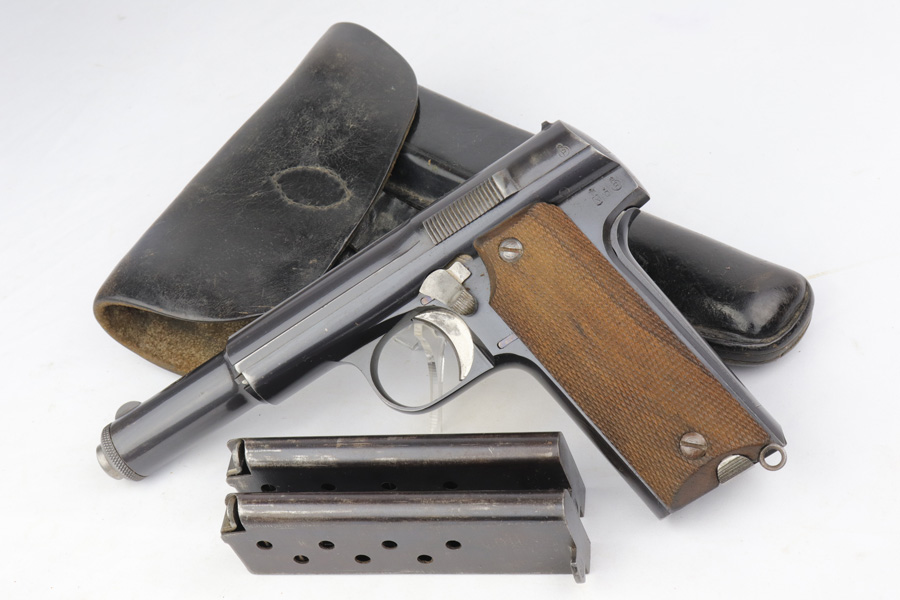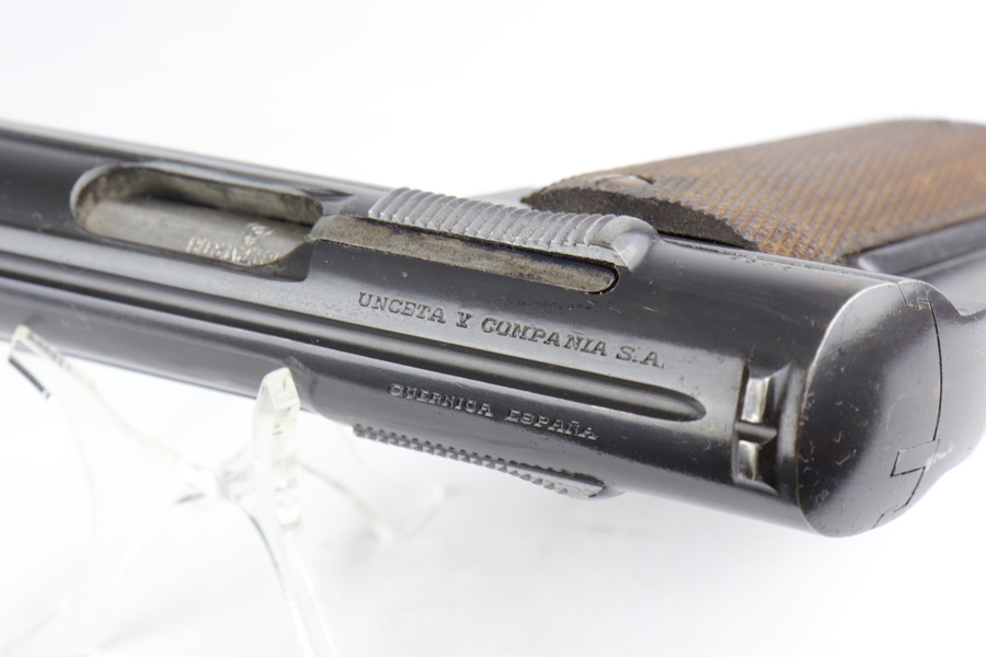3/6/19 – This is a very nice, honest example of a scarce Astra 600 rig that is waffen marked and part of the first Nazi contract for these pistols. This pistol was delivered on June 23rd of 1944. It retains about 95% of the original blue with minor holster wear on the high edges and some thinning on the straps. These pistols were delivered to German Army via the Spanish-French border before it was closed by the Allies. Only about 10,000 waffen marked Astra 600s were delivered before this point. The pistol comes with a postwar holster and two correct magazines. Excellent grips and the bore is nice and shiny.