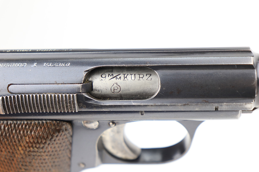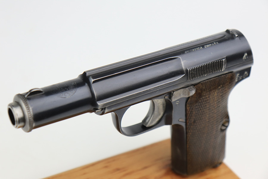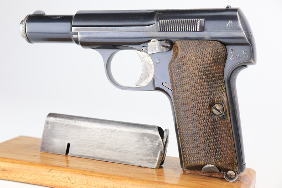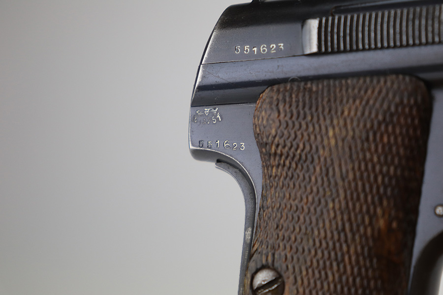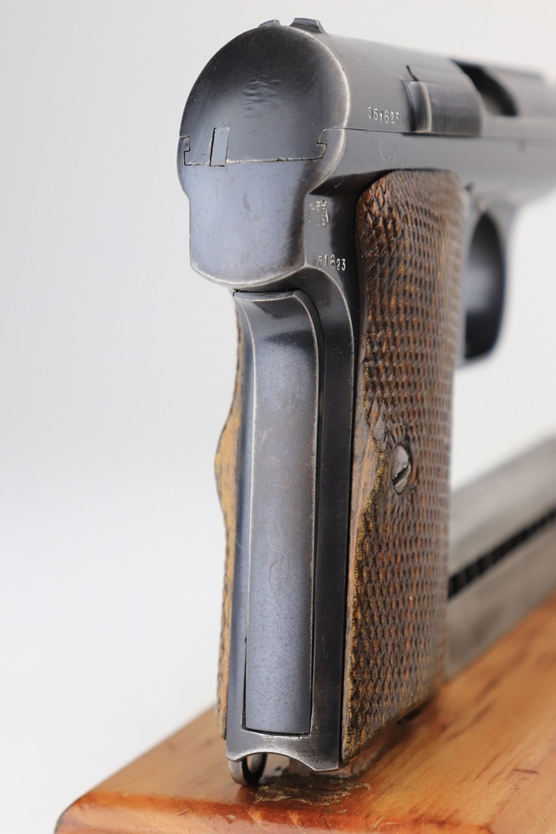 3/29/22 – This is a matching and original Nazi Astra Model 300 that was shipped to the German Army in 1942. It has about 90% of the original blue remaining, with thinning and patina on the front strap and grip safety. There’s also general high edge wear on slide and frame, as it may have been in a holster for many years. The grips have no cracks, and just a small chip on the bottom of the left panel. They do have some lacquer applied to each panel, though. Bore has good rifling but some frost and minor freckling in the grooves. Correct, original magazine.