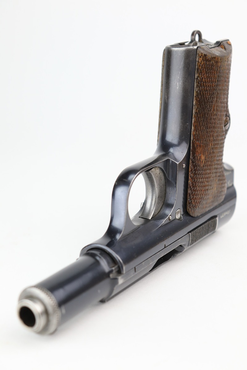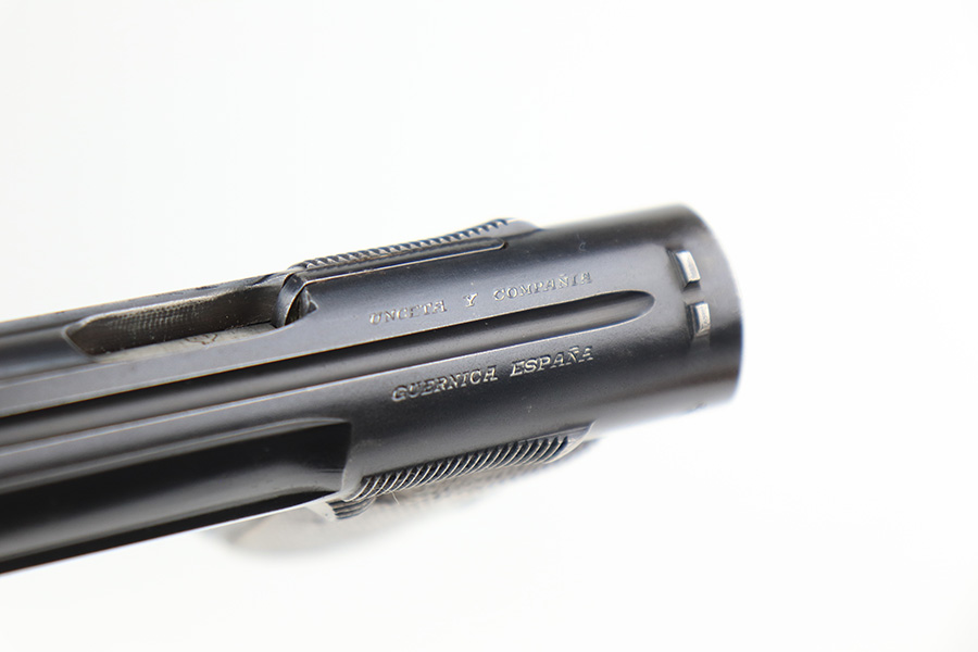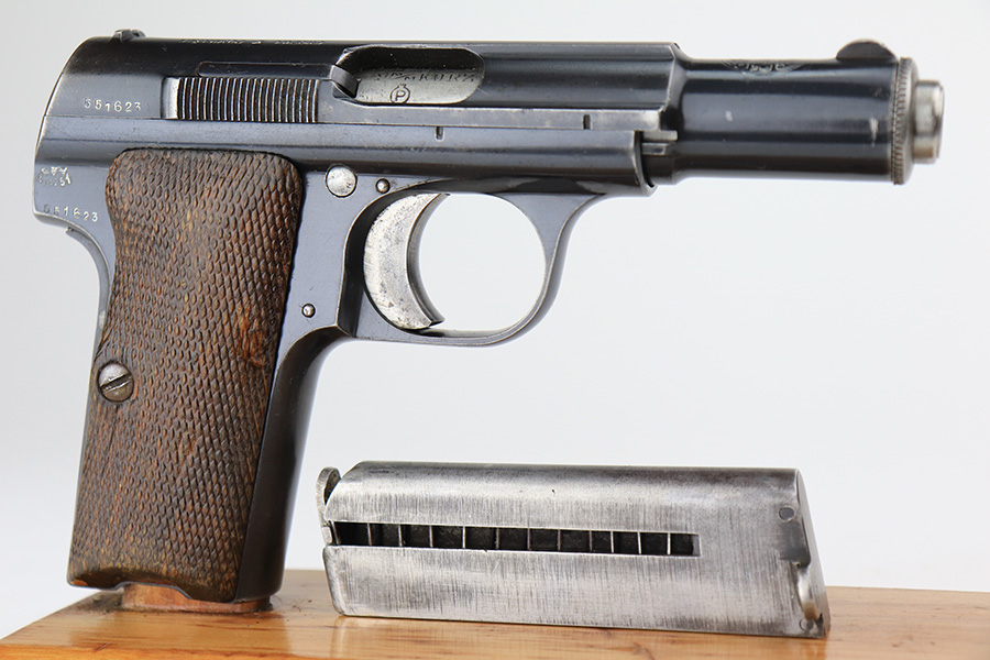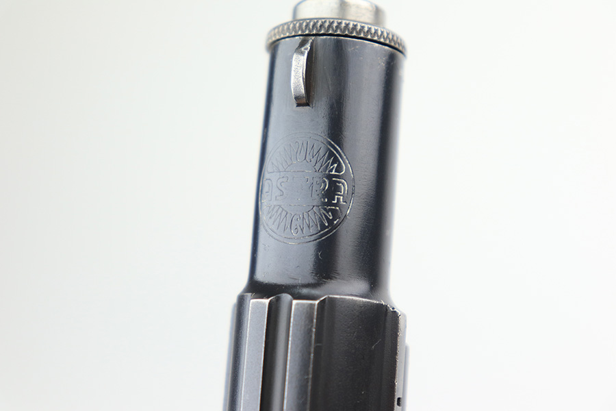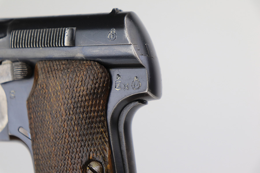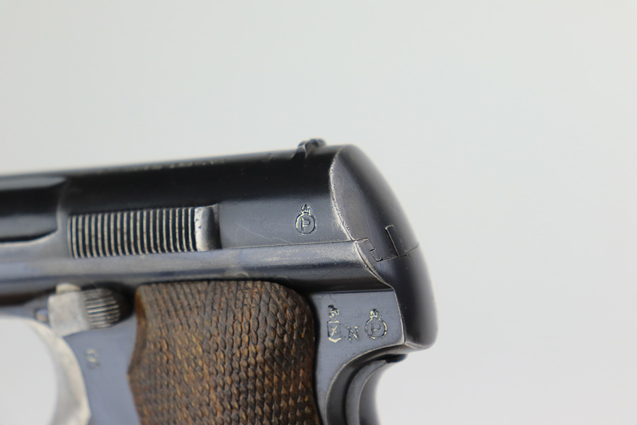 3/29/22 – This is a matching and original Nazi Astra Model 300 that was shipped to the German Army in 1942. It has about 90% of the original blue remaining, with thinning and patina on the front strap and grip safety. There’s also general high edge wear on slide and frame, as it may have been in a holster for many years. The grips have no cracks, and just a small chip on the bottom of the left panel. They do have some lacquer applied to each panel, though. Bore has good rifling but some frost and minor freckling in the grooves. Correct, original magazine.