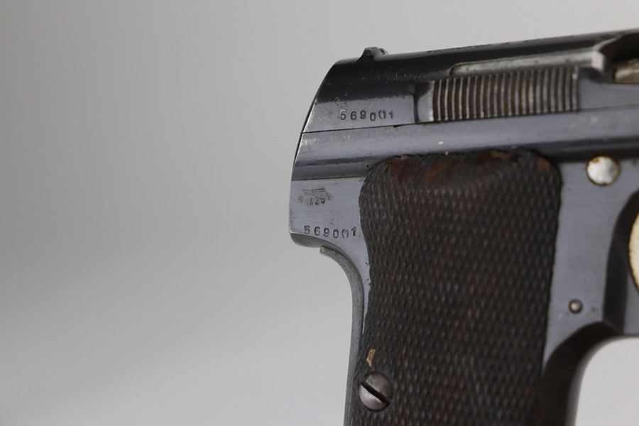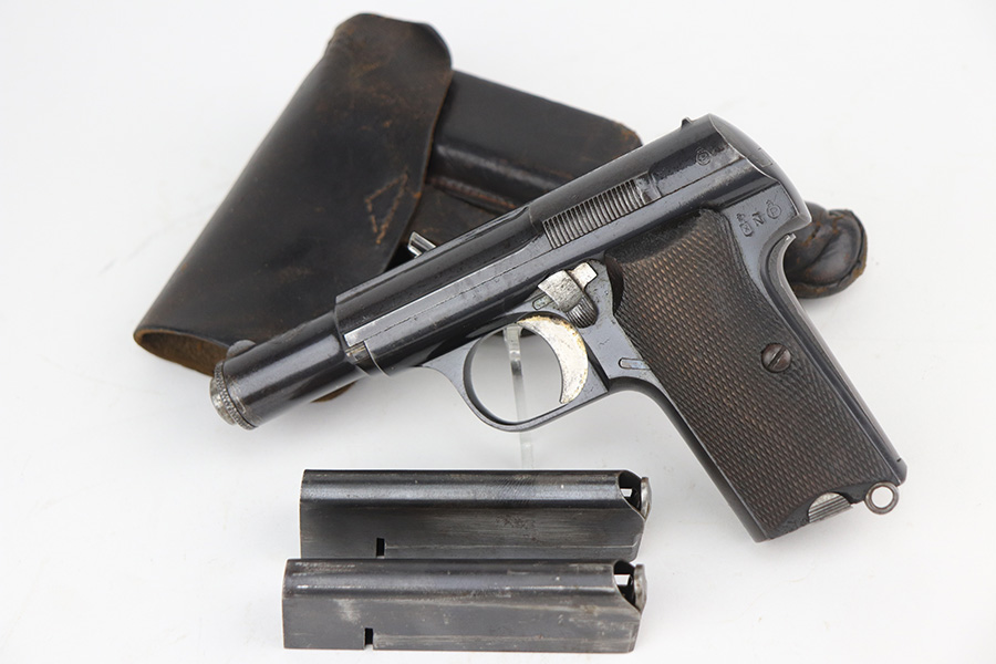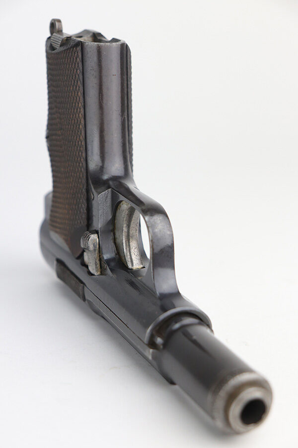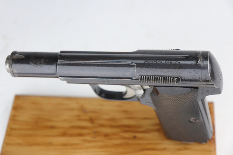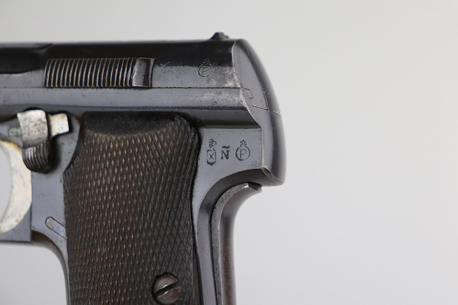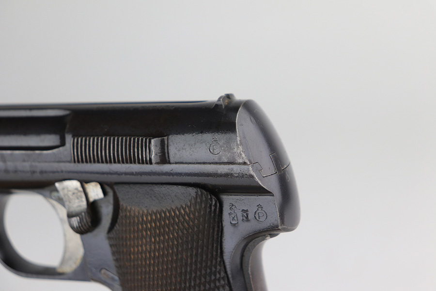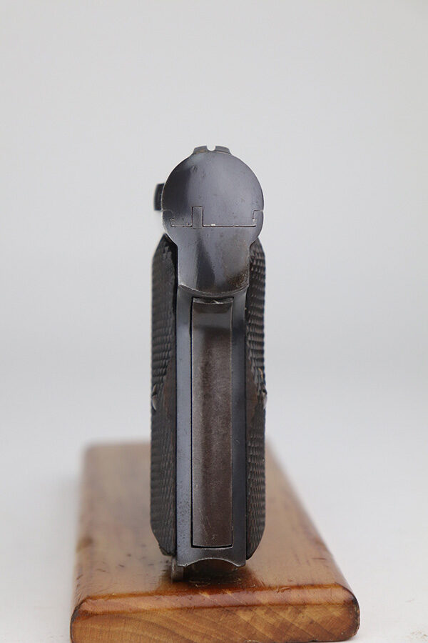 11/4/21 – This is an excellent example of an Astra Model 300 issued to the Nazi military in 1943. It was a part of a delivery on April 9th of 1943 of about 4,000 guns. The gun is all matching, has the proper Spanish proofs on the left side of the gun, and has the proper “Waffen 251” Nazi military acceptance proofs on the right side of the tang. It comes as a rig with two period-correct magazines and a fairly worn un-marked holster. The gun has retained about 95% of its original finish. While there is very little actual finish loss, there is spotty oxidation throughout. There is some scratchy wear around the muzzle, hints of wear on the high edges, and a couple of small areas of minor wear around the tang. Just a hint of thinning on the grip straps. Comes with excellent period-correct wood grips. The bore has decent rifling, but there is noticeable oxidation in all of the grooves.