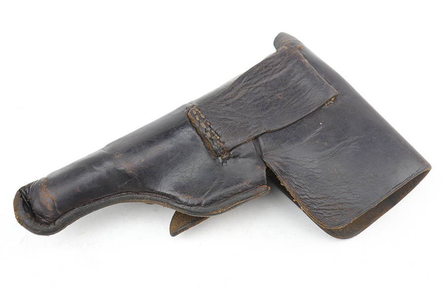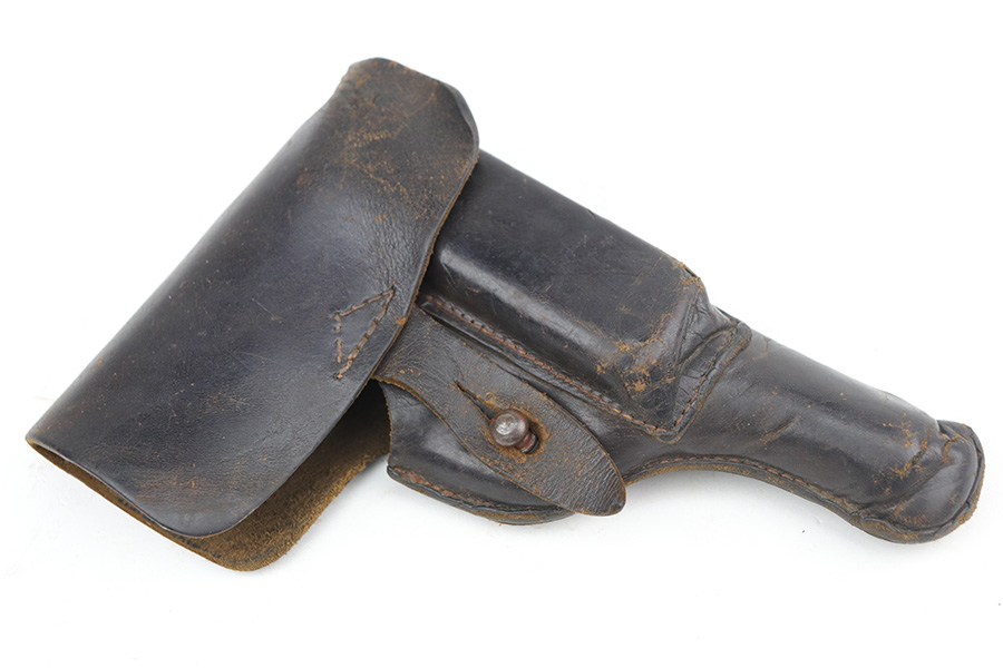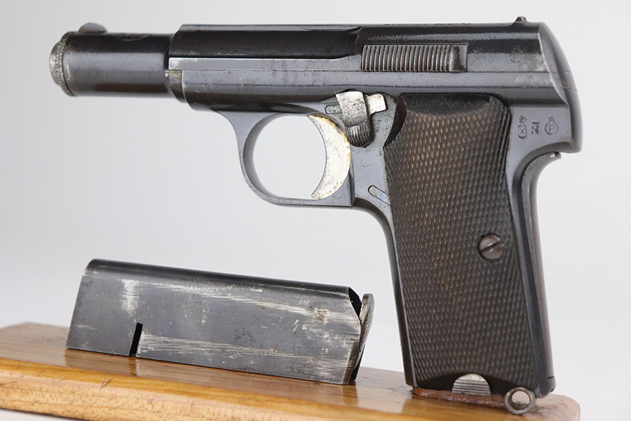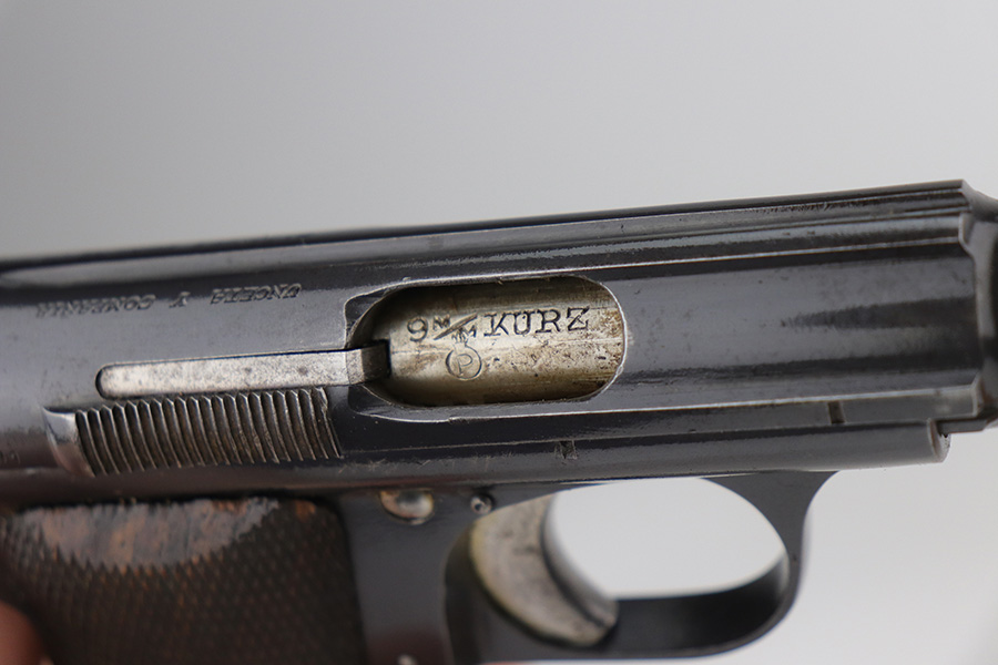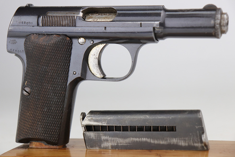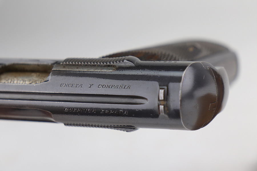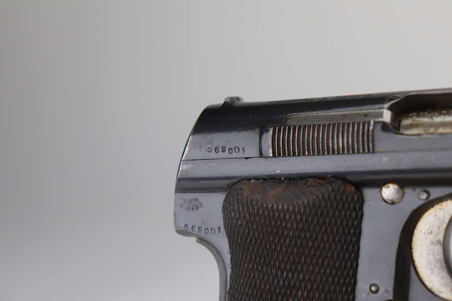 11/4/21 – This is an excellent example of an Astra Model 300 issued to the Nazi military in 1943. It was a part of a delivery on April 9th of 1943 of about 4,000 guns. The gun is all matching, has the proper Spanish proofs on the left side of the gun, and has the proper “Waffen 251” Nazi military acceptance proofs on the right side of the tang. It comes as a rig with two period-correct magazines and a fairly worn un-marked holster. The gun has retained about 95% of its original finish. While there is very little actual finish loss, there is spotty oxidation throughout. There is some scratchy wear around the muzzle, hints of wear on the high edges, and a couple of small areas of minor wear around the tang. Just a hint of thinning on the grip straps. Comes with excellent period-correct wood grips. The bore has decent rifling, but there is noticeable oxidation in all of the grooves.