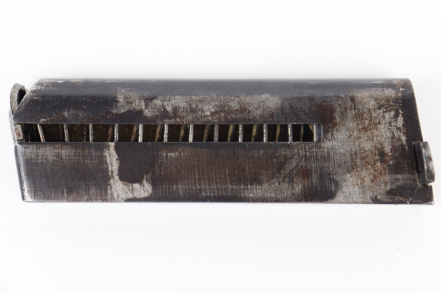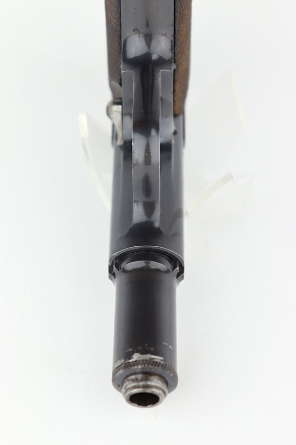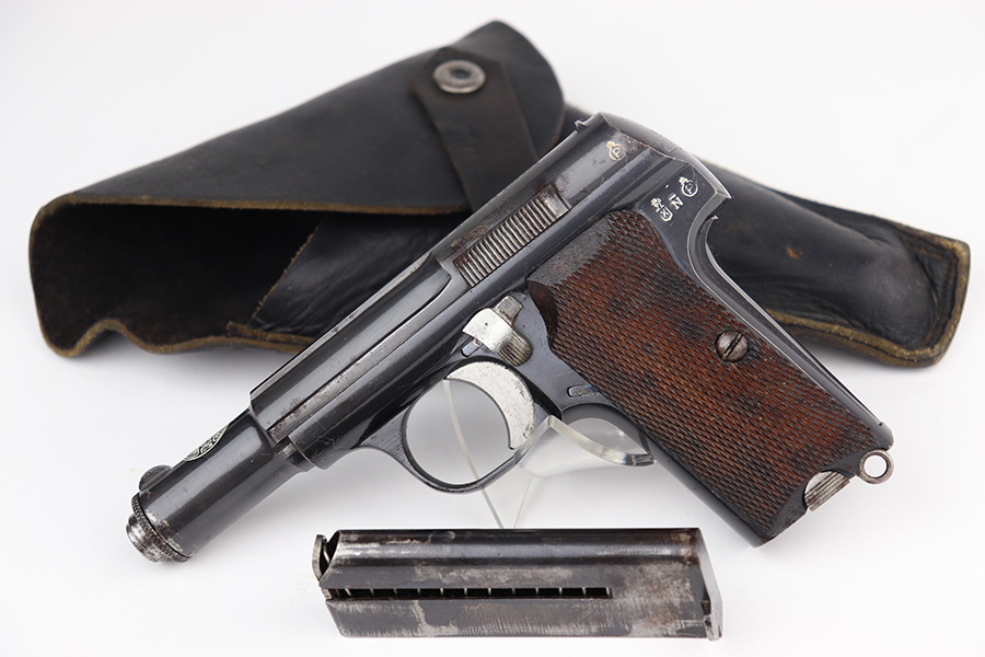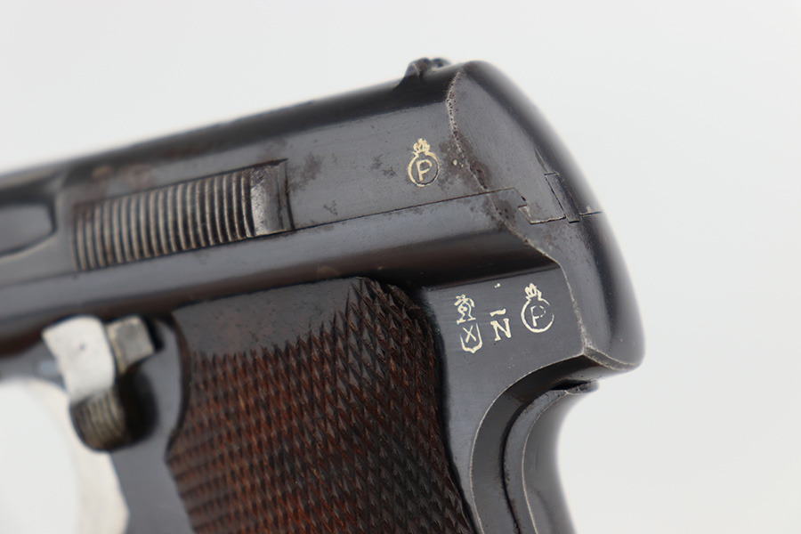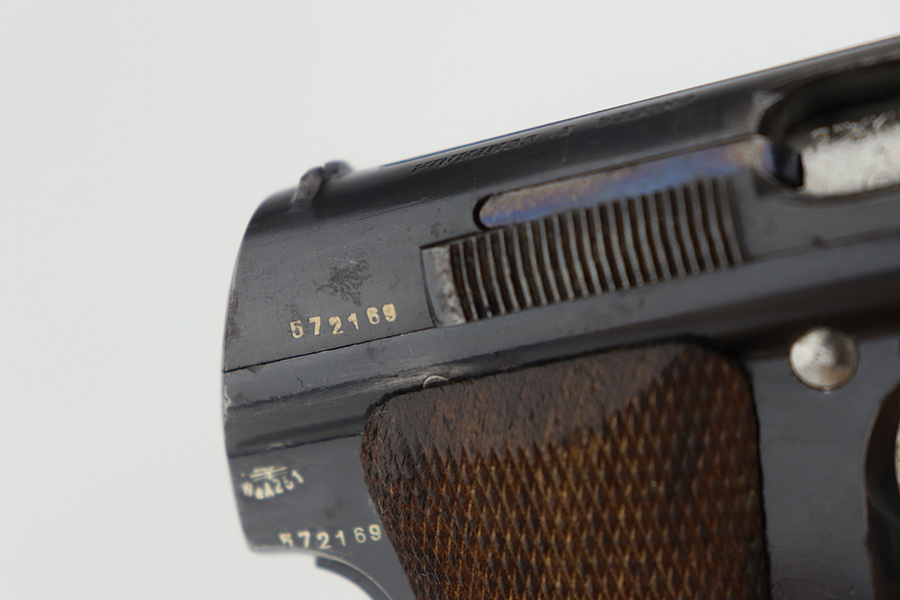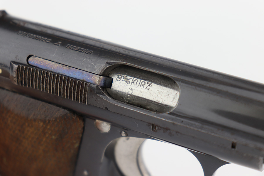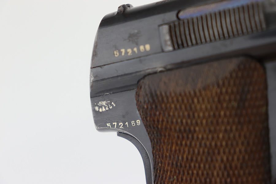 12/1/22 – This is a very nice example of a Spanish Astra Model 300 issued to the Nazi military during WW2. Chambered in 9mm kurz or .380 ACP. It was part of a shipment of 4,000 guns on March 13, 1943. It is all matching and has the proper “Waffen 251″ Nazi military acceptance proof on the right side of the tang. It comes as a rig with a generic black leather holster (fits the gun well” and one period-correct magazine. The gun itself has retained about 96-97% of its original finish with very minor wear around some of the high edges. While there is very little actual finish loss, there are some small areas here and there with very light spotty oxidation and pin-pricking here, most noticeable on the left side of the gun. There are also what appear to be marks from the teeth of a wrench around the barrel bushing. Fitted with excellent wood grips. The bore has good rifling, but there are areas of pin-pricking here and there.
