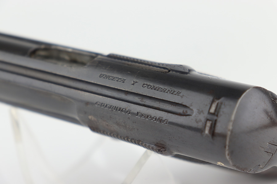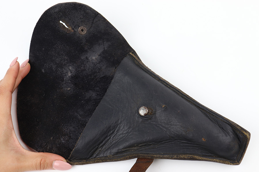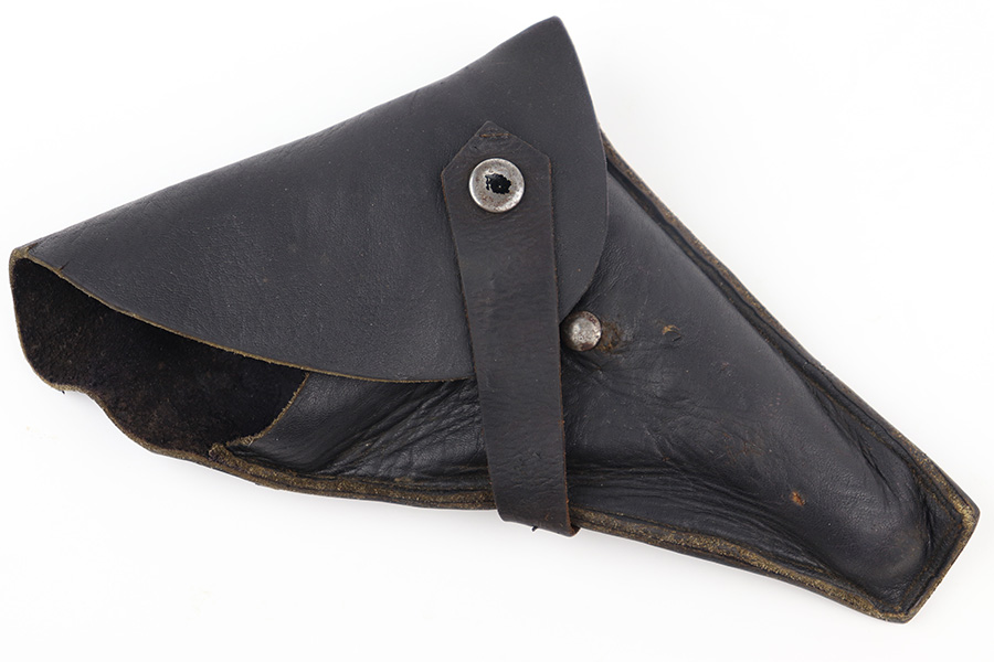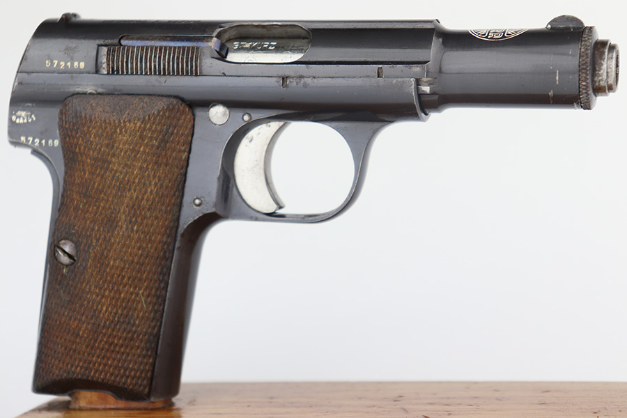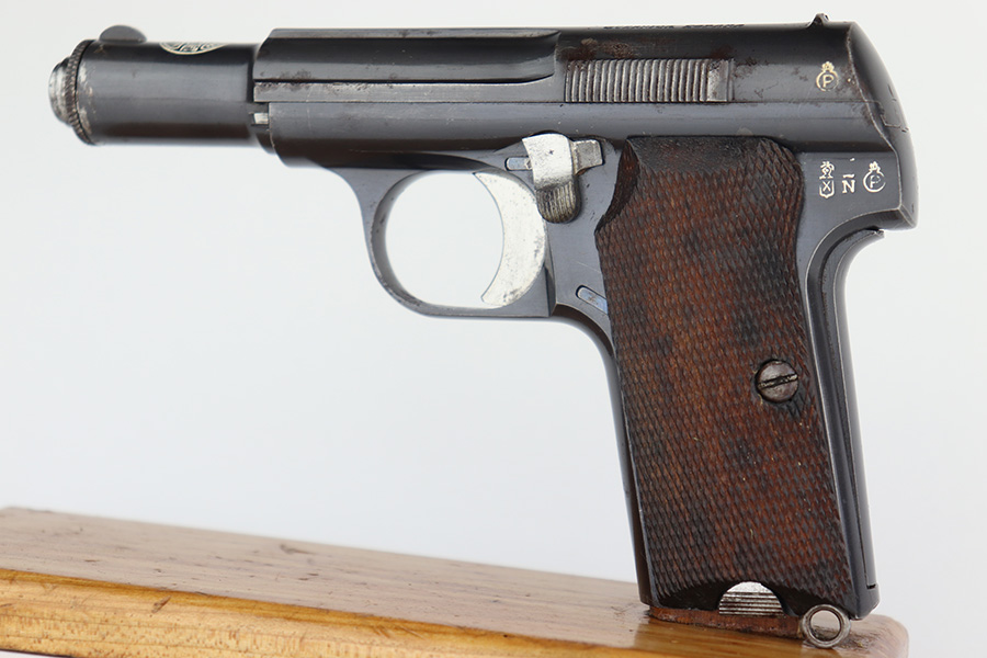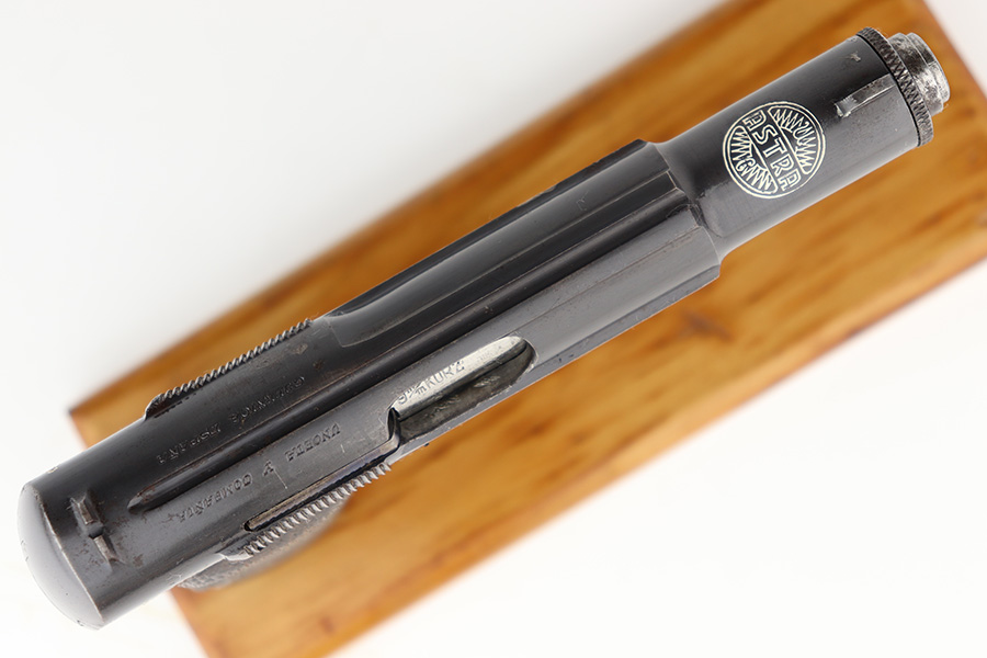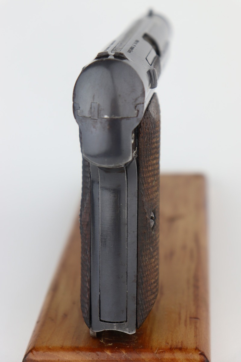 12/1/22 – This is a very nice example of a Spanish Astra Model 300 issued to the Nazi military during WW2. Chambered in 9mm kurz or .380 ACP. It was part of a shipment of 4,000 guns on March 13, 1943. It is all matching and has the proper “Waffen 251″ Nazi military acceptance proof on the right side of the tang. It comes as a rig with a generic black leather holster (fits the gun well” and one period-correct magazine. The gun itself has retained about 96-97% of its original finish with very minor wear around some of the high edges. While there is very little actual finish loss, there are some small areas here and there with very light spotty oxidation and pin-pricking here, most noticeable on the left side of the gun. There are also what appear to be marks from the teeth of a wrench around the barrel bushing. Fitted with excellent wood grips. The bore has good rifling, but there are areas of pin-pricking here and there.