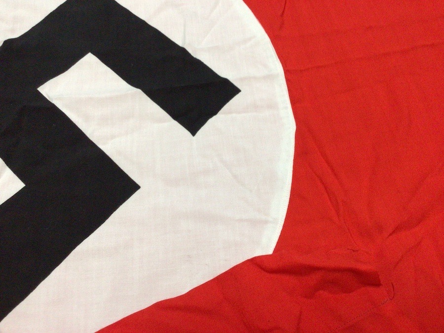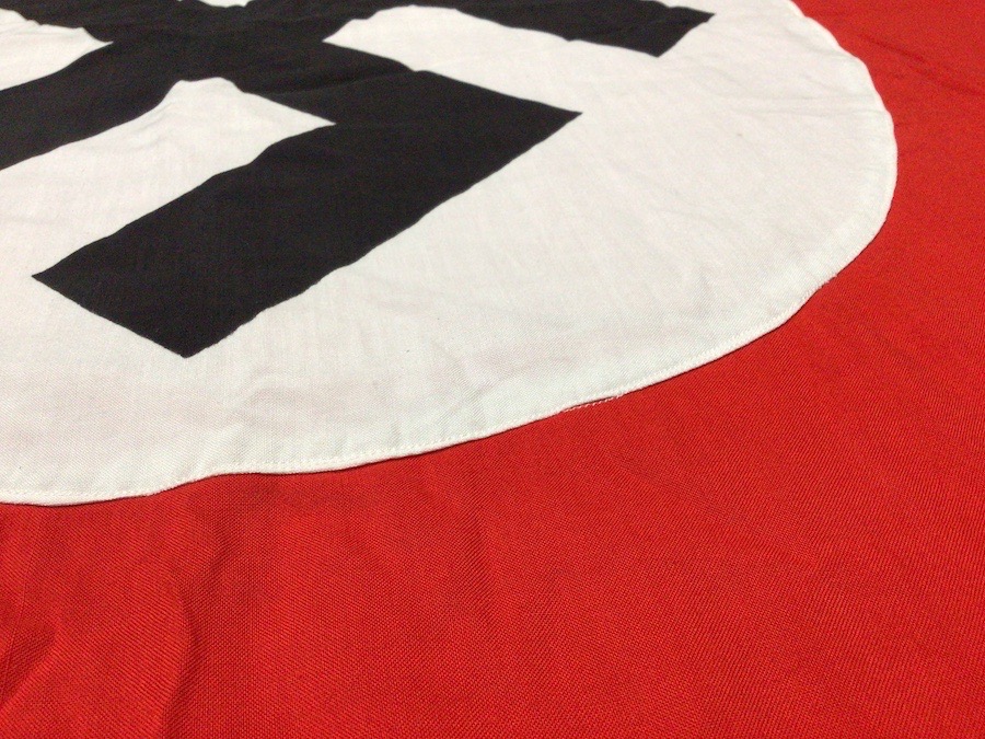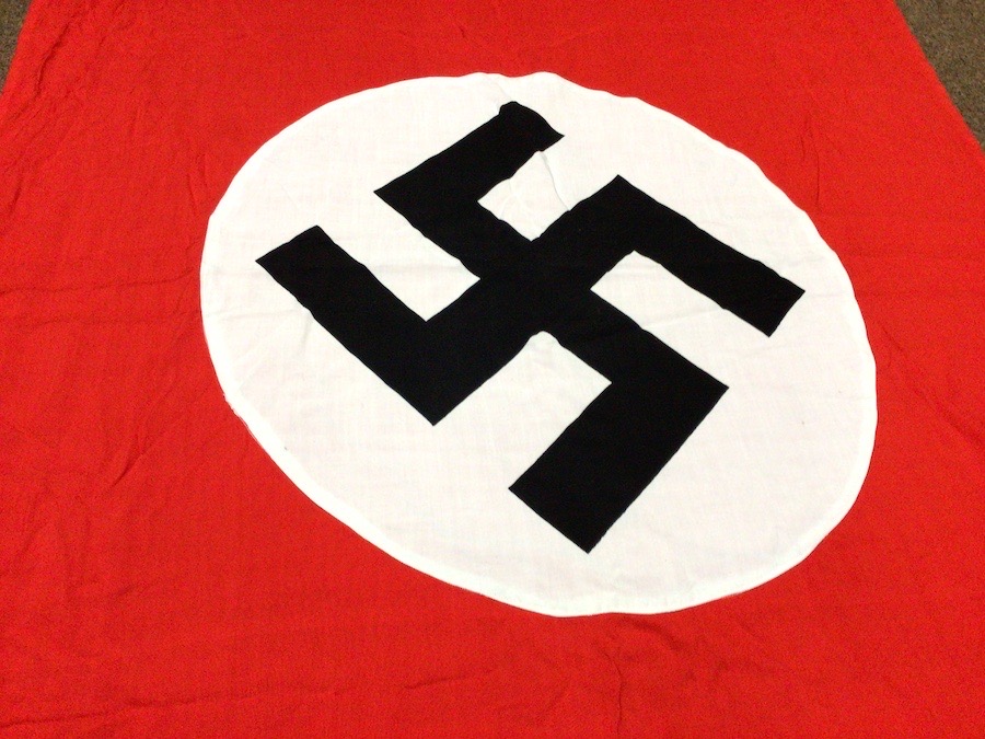 1/26/24 – Located at our Ohio office. Original and excellent condition. The flag is double-sided with a Nazi emblem, sewn into the center of each side. There are no stains, rips or tears and the stitching is intact. The flag measures about 6ft x 3ft with a looped end for hanging verticaly on a pole.