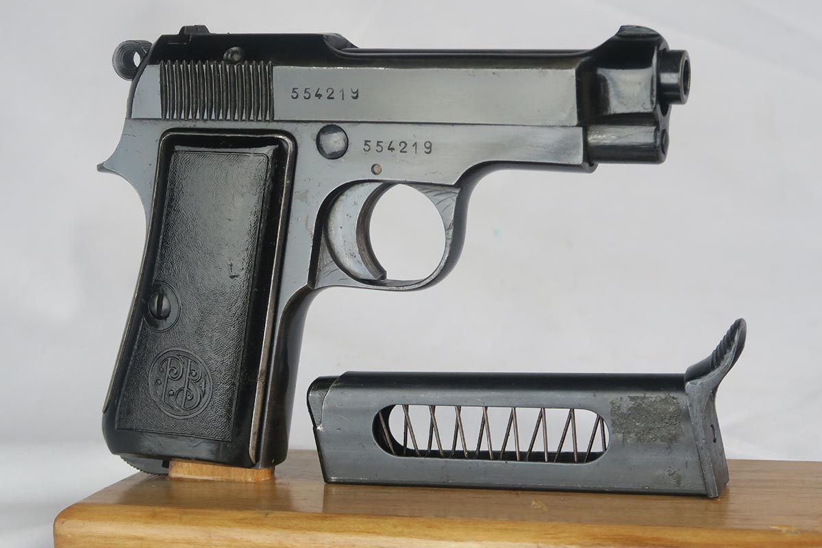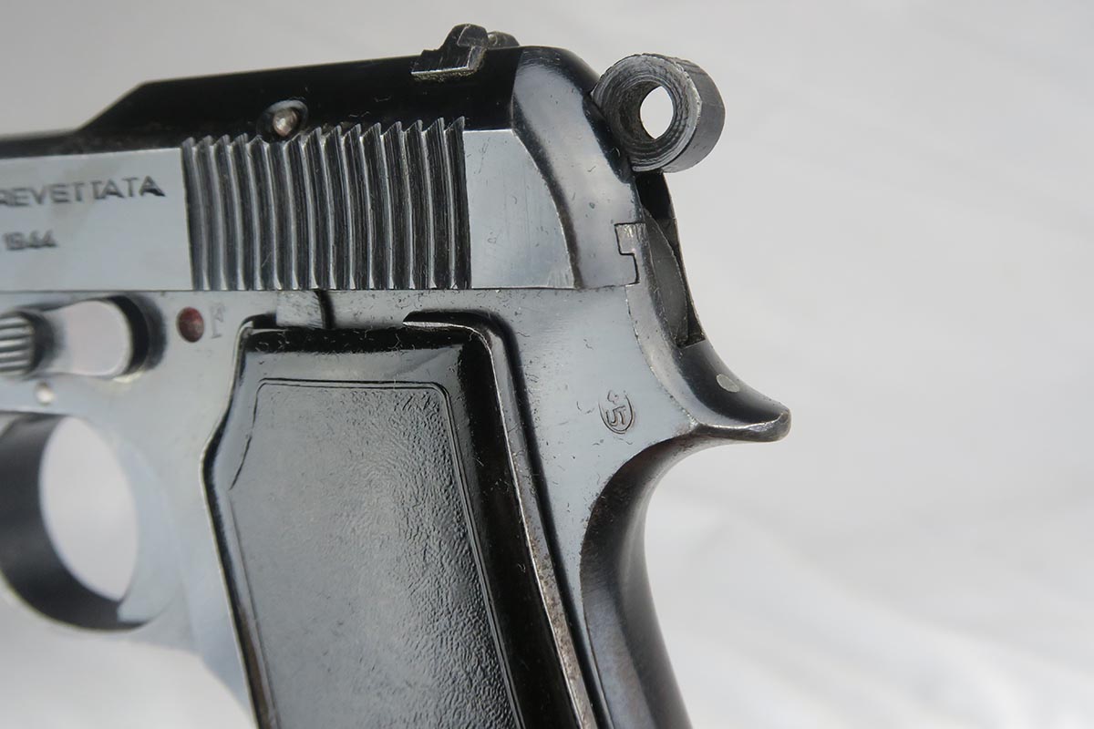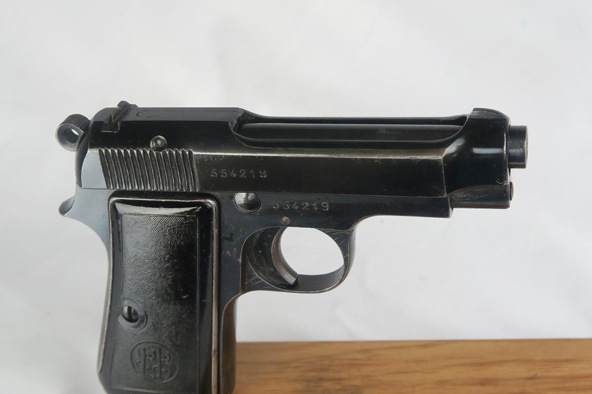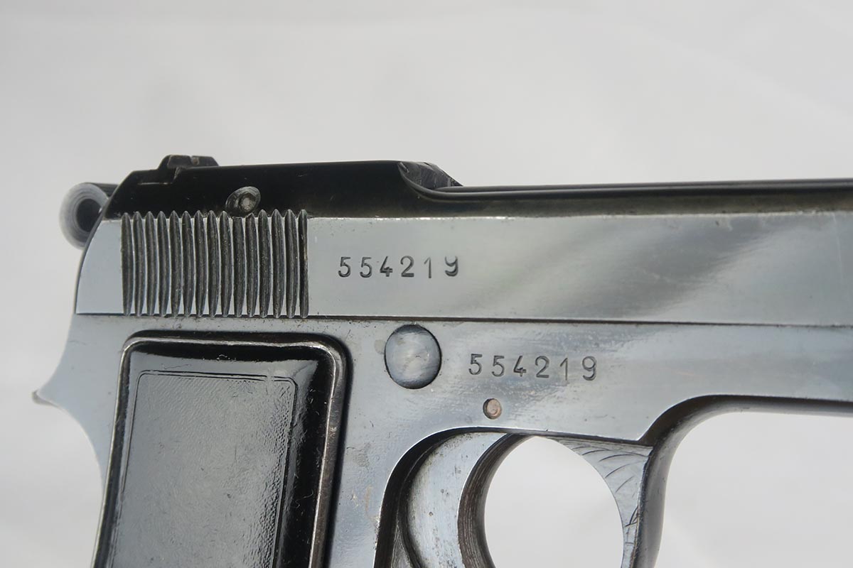 10/16/17 – This is an all original and correct Nazi Beretta M1935 from 1944. It is ‘RE’ marked on the frame and has about 95% original bluing remaining. There is some thinning on the straps and some freckling on the high edges of the right side slide. Very nice grips and magazine with no major flaws. Minty bore.
