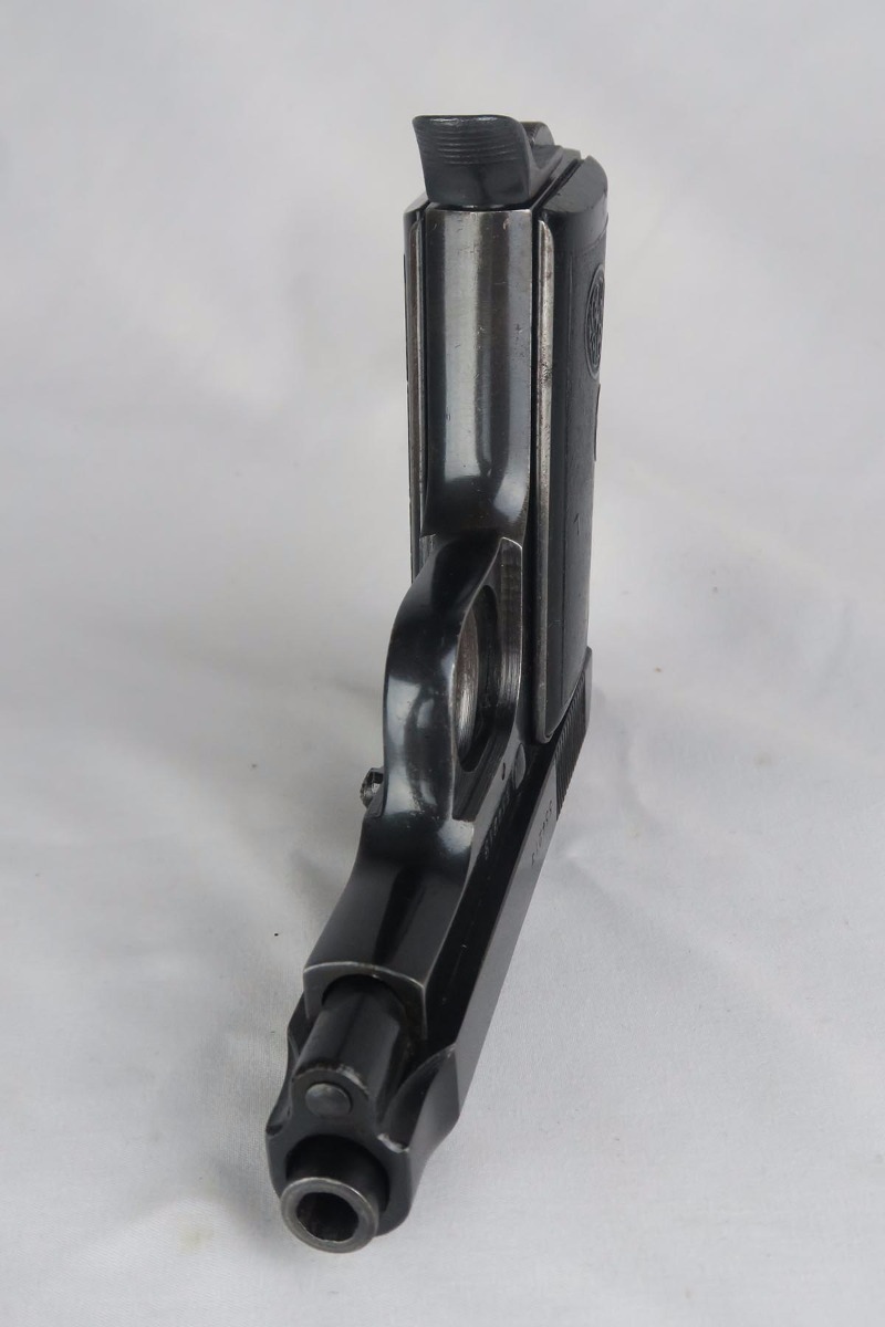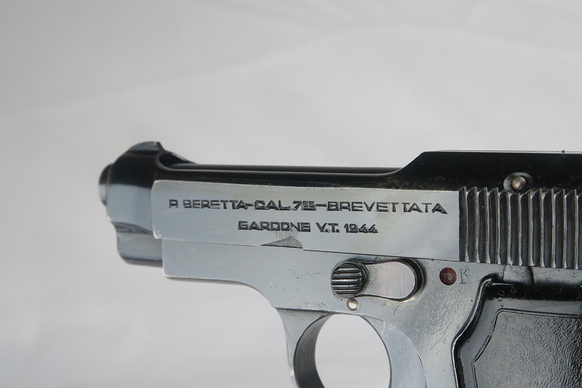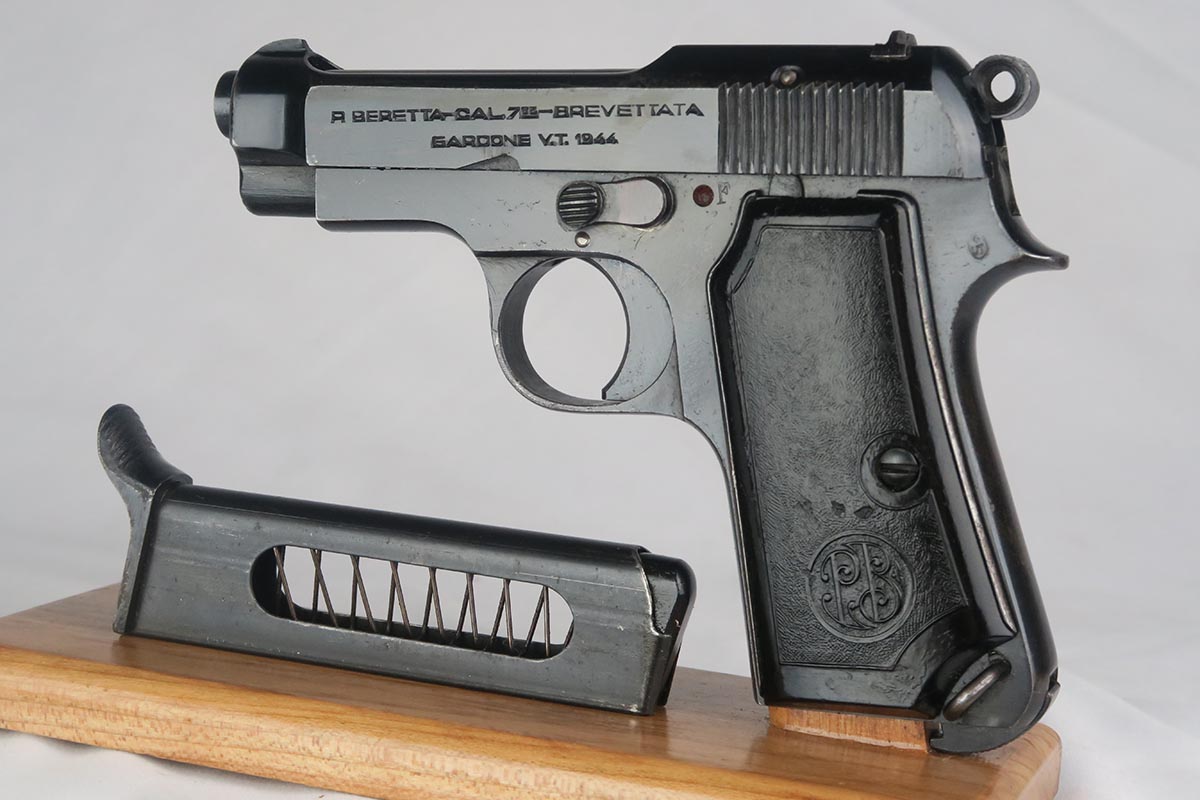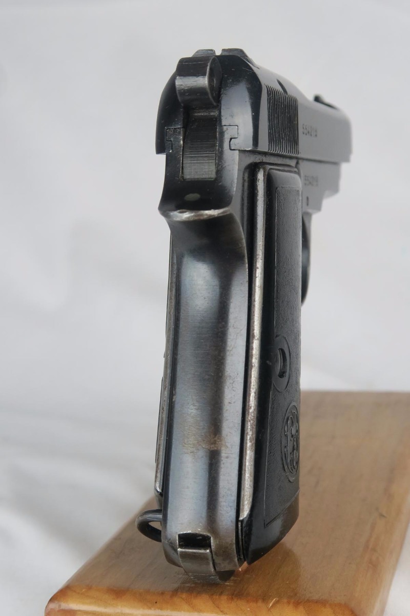 10/16/17 – This is an all original and correct Nazi Beretta M1935 from 1944. It is ‘RE’ marked on the frame and has about 95% original bluing remaining. There is some thinning on the straps and some freckling on the high edges of the right side slide. Very nice grips and magazine with no major flaws. Minty bore.