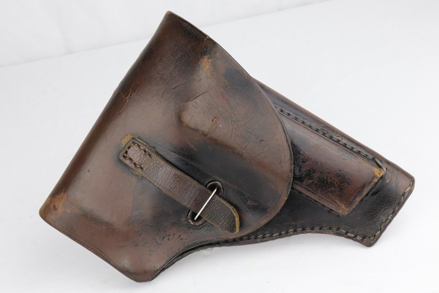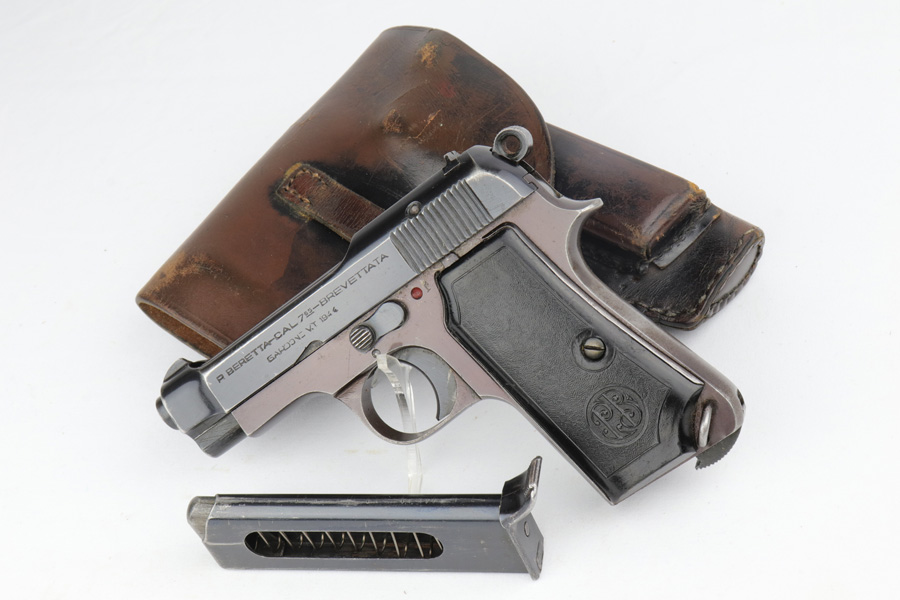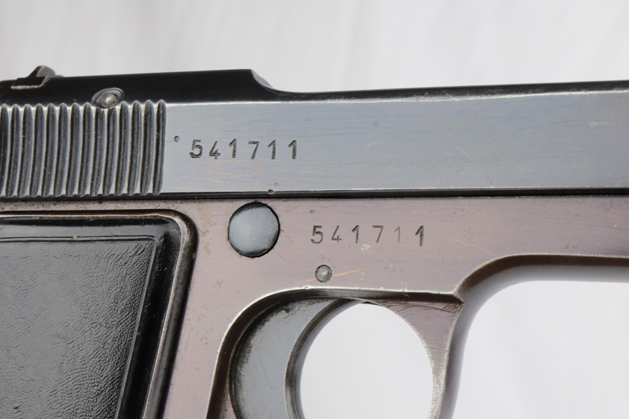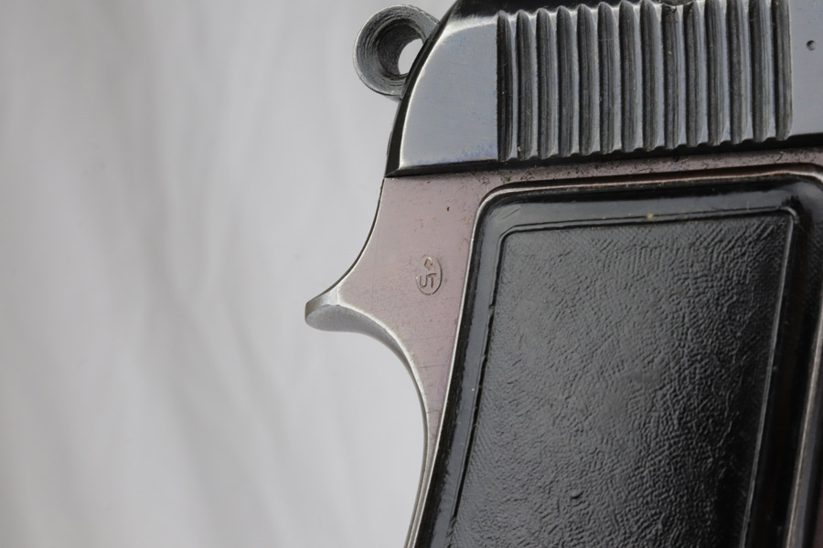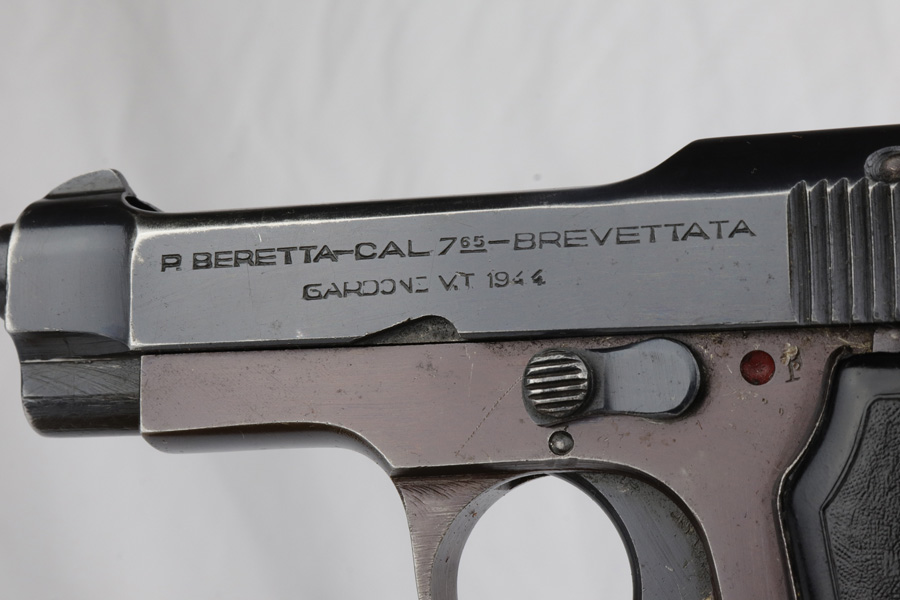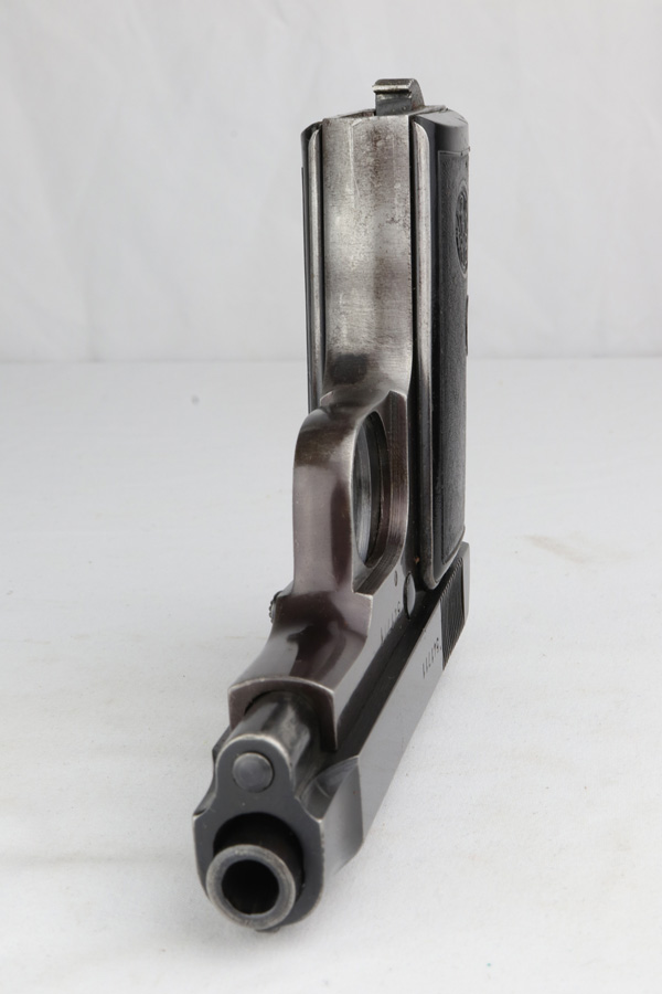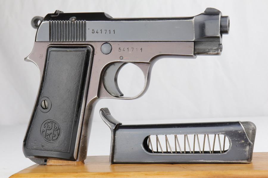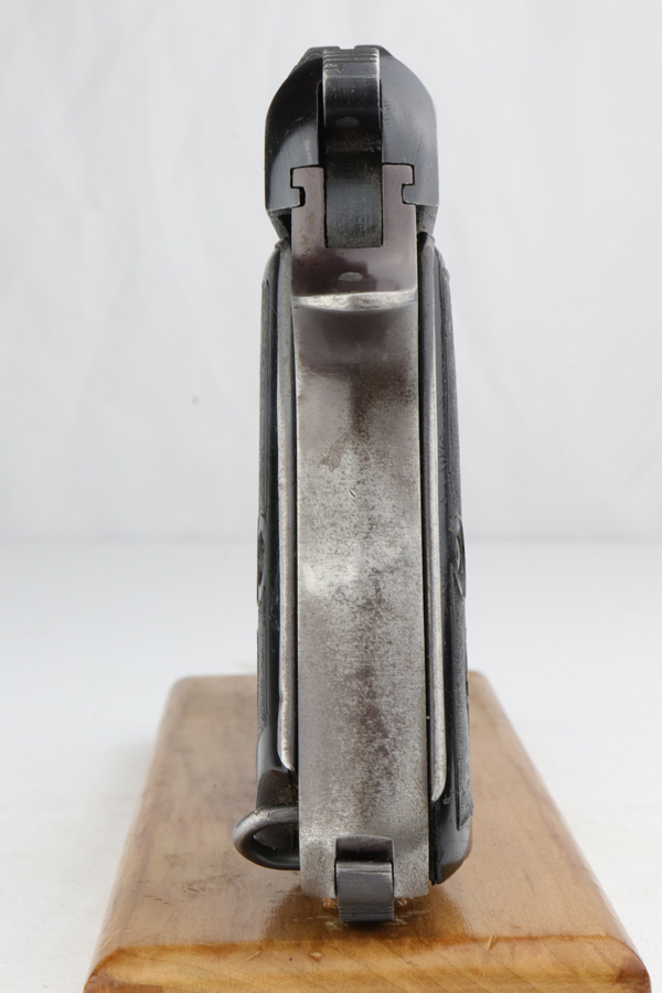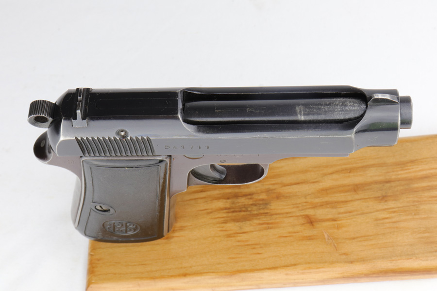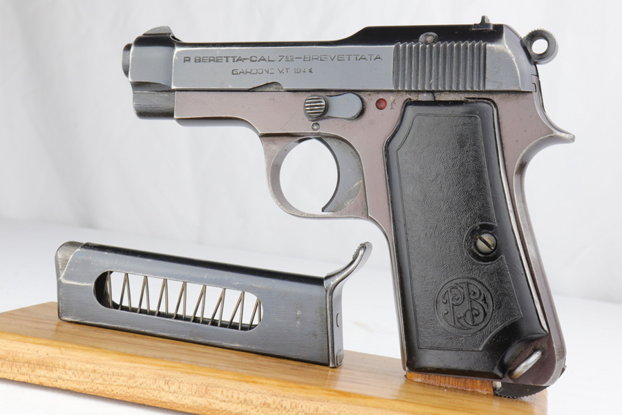 2/23/21 – This is a nice M1935 Beretta from World War II. The original finish is about 85% with a beautiful profile, emphasized by the plum color of the frame, but pronounced thinning on the straps. The pistol is 4UT marked on the tang, which means it was issued to the German Army. The pistol has all matching parts and a very nice bore. It is dated 1944 and is 7.65 caliber. Correct magazines and grips. Comes with an original holster and a total of two original magazines (only one is photoed).