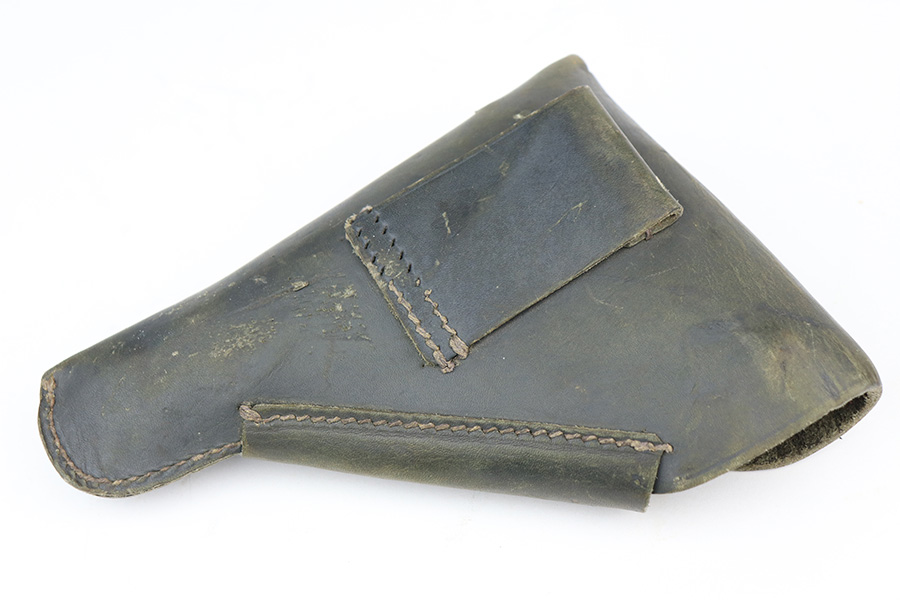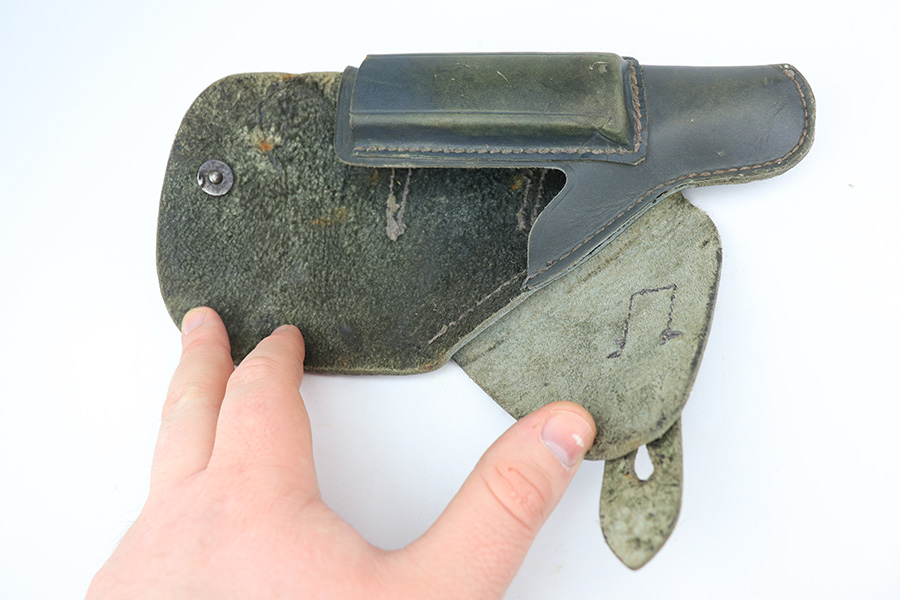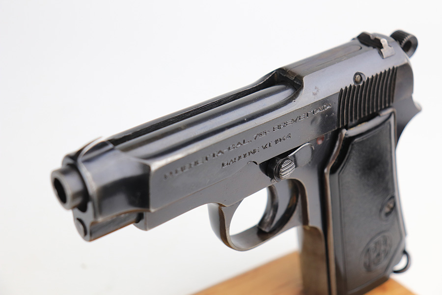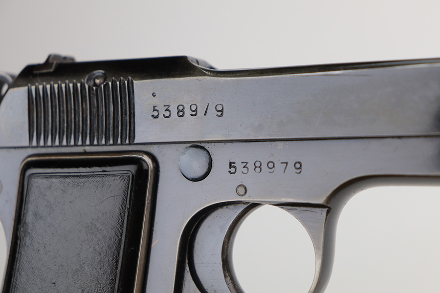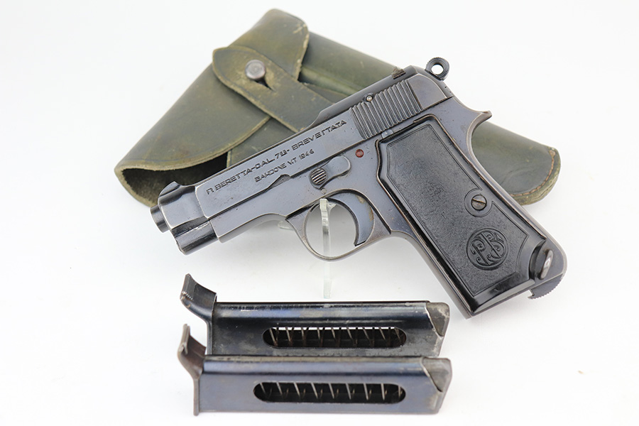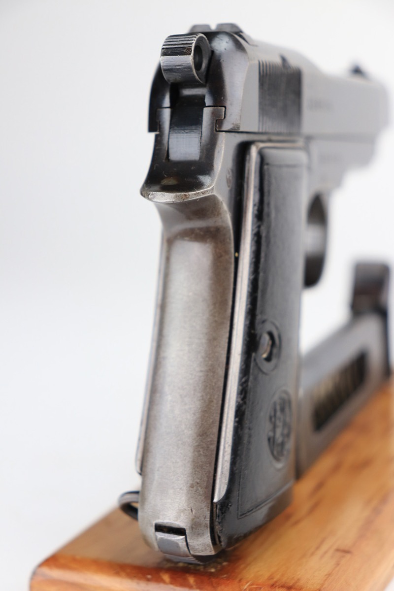 2/22/22 – This is a very nice example of a Beretta Model 1935 issued to the Nazi military in 1944. It is all matching and has the proper “4UT” proof on the right side of the tang, indicating it was delivered to the Nazi military. It comes as a rig with a period-correct green leather holster and two proper magazines. The gun has retained somewhere between 85-90% of its original high polish finish. The majority of the finish loss is on both of the grip straps. There is also minor wear around the high edges of the slide and around the muzzle. There is some minor discoloration on both sides of the slide and a few very light scratches on the right side of the slide. Comes with very nice period-correct grips – a few very small handling marks here and there. The bore is excellent – strong rifling with just a hint of frosting in some of the grooves.