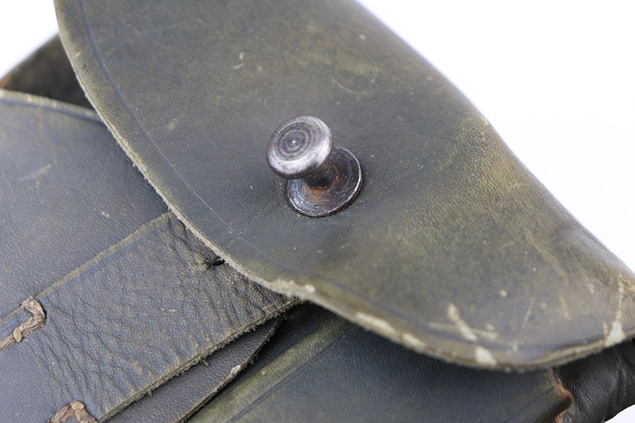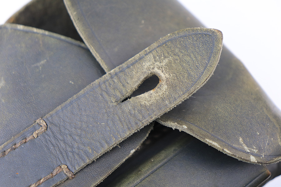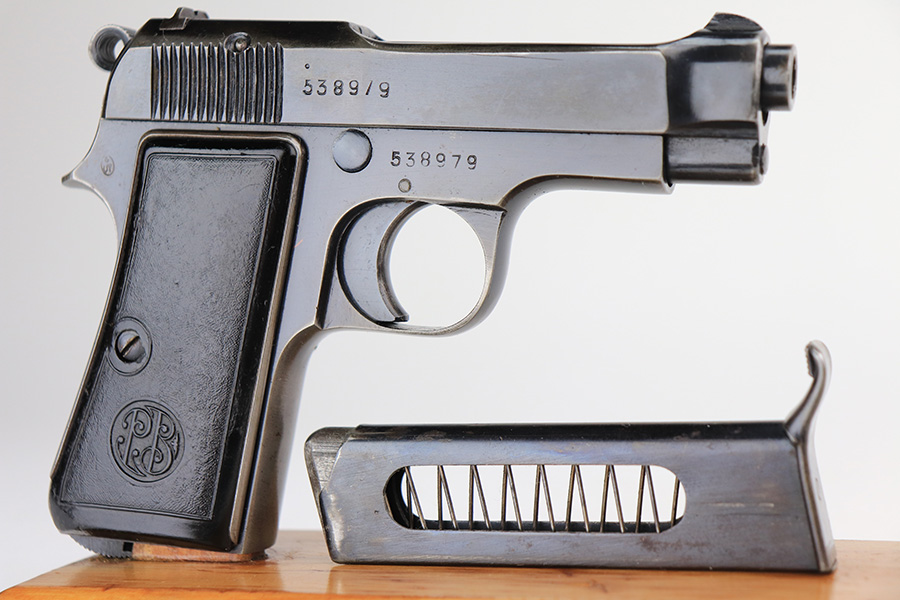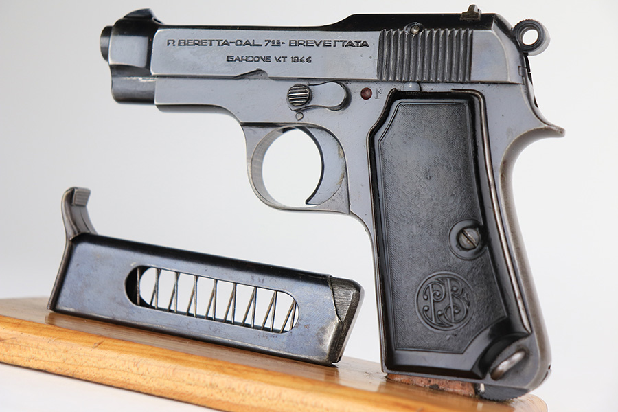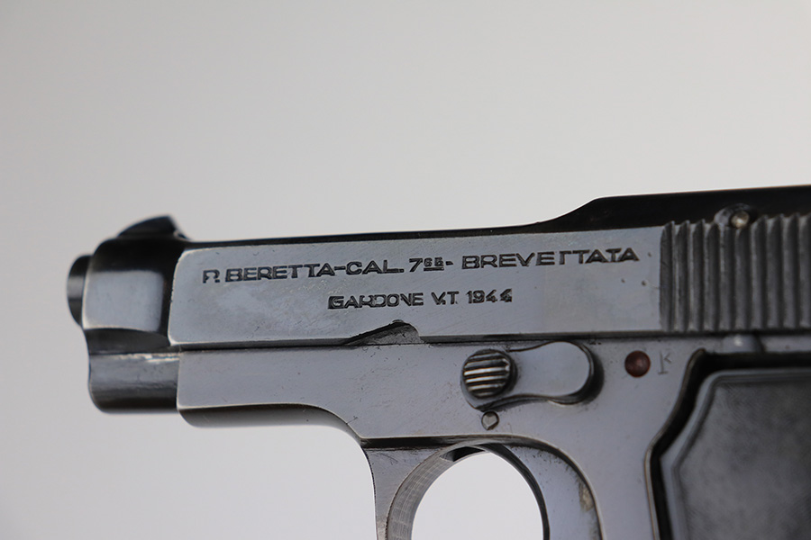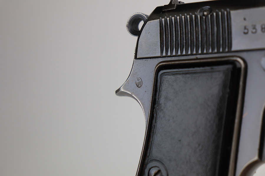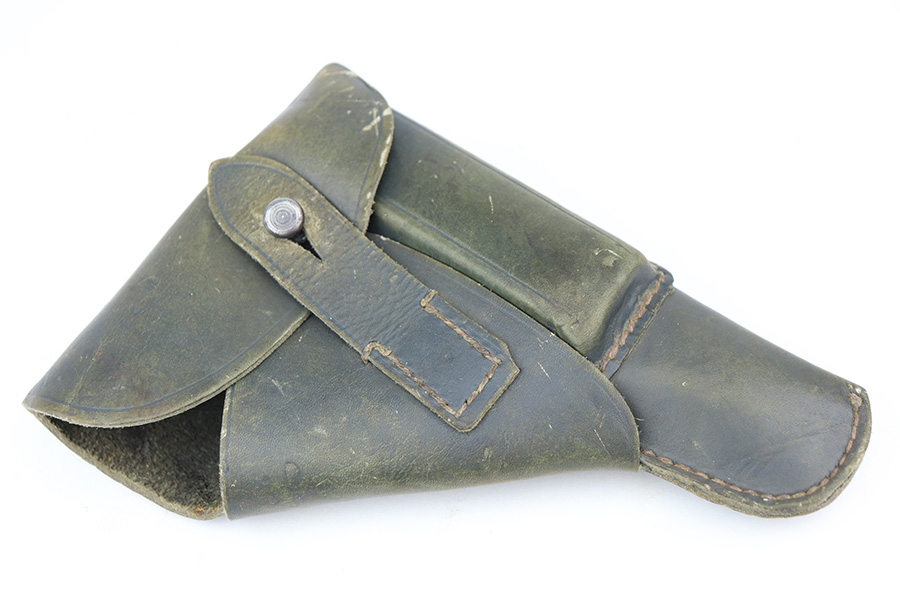 2/22/22 – This is a very nice example of a Beretta Model 1935 issued to the Nazi military in 1944. It is all matching and has the proper “4UT” proof on the right side of the tang, indicating it was delivered to the Nazi military. It comes as a rig with a period-correct green leather holster and two proper magazines. The gun has retained somewhere between 85-90% of its original high polish finish. The majority of the finish loss is on both of the grip straps. There is also minor wear around the high edges of the slide and around the muzzle. There is some minor discoloration on both sides of the slide and a few very light scratches on the right side of the slide. Comes with very nice period-correct grips – a few very small handling marks here and there. The bore is excellent – strong rifling with just a hint of frosting in some of the grooves.