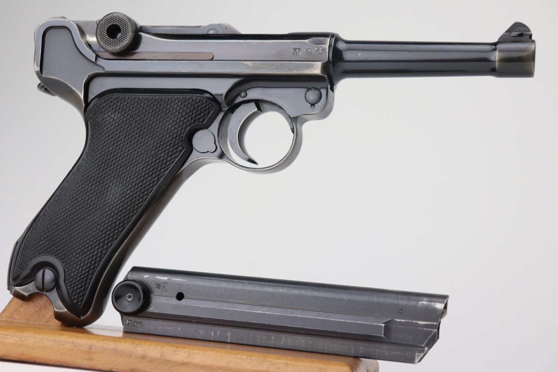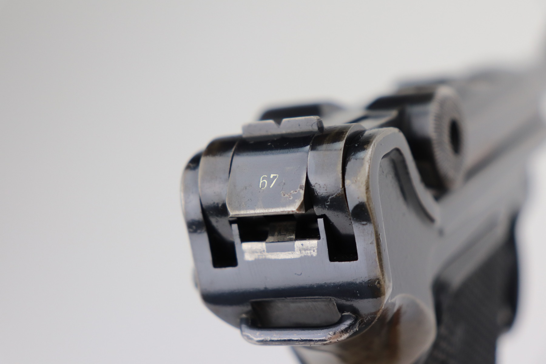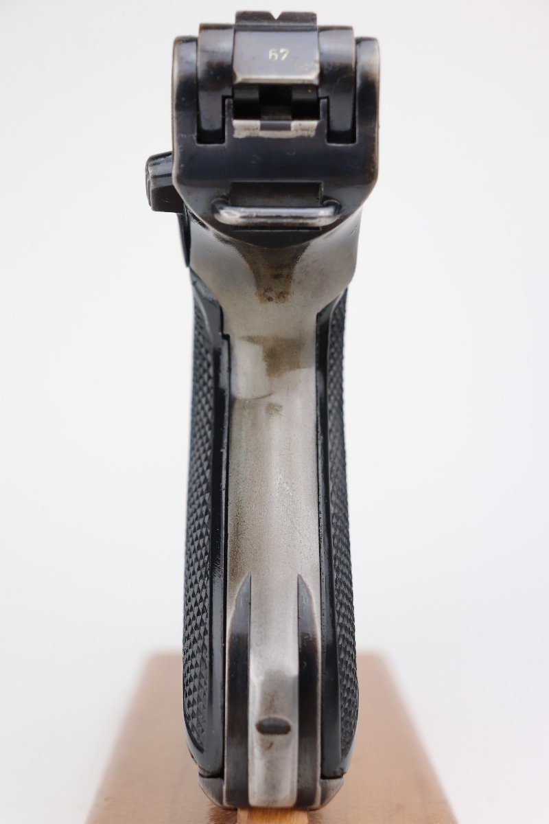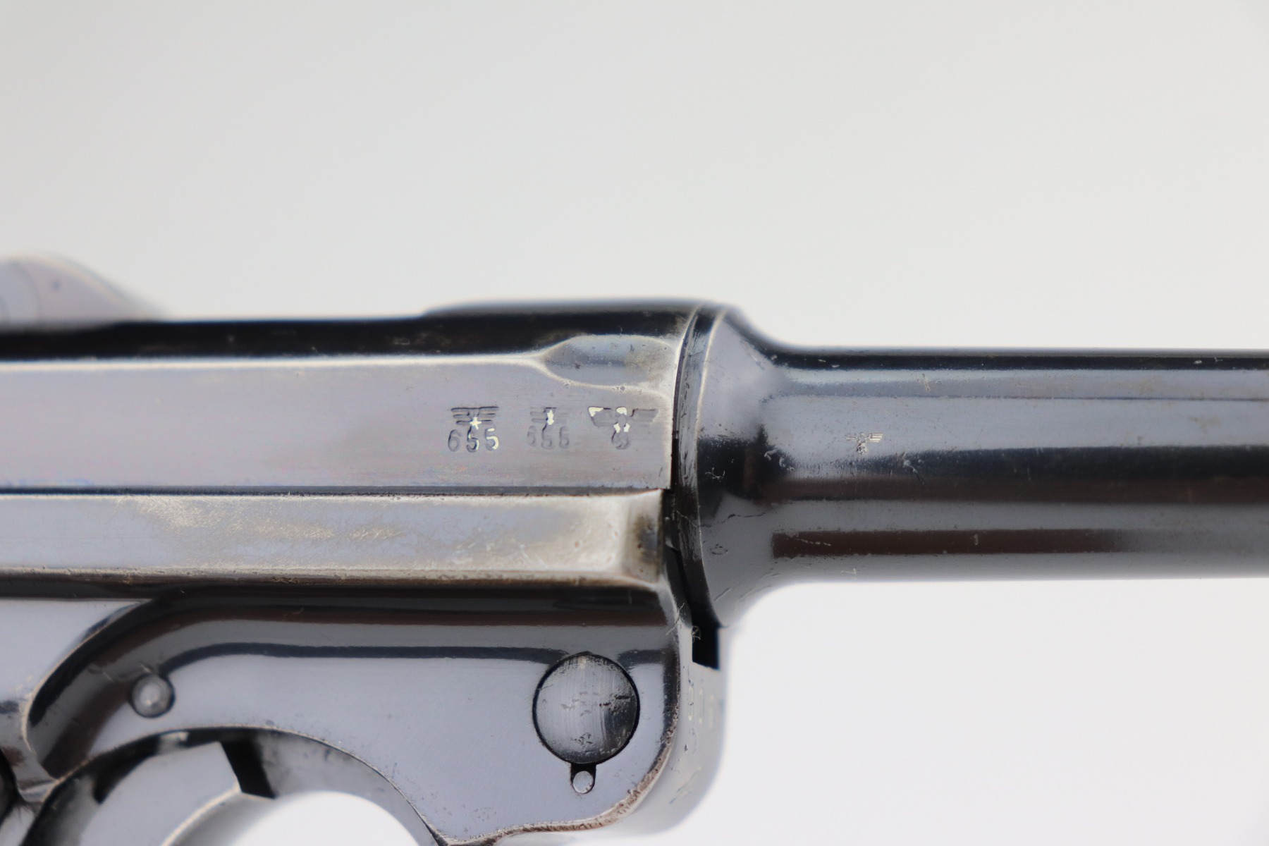 2/25/21 – This is a nice example of a Black Widow Luger Rig issued to the Nazi military in 1941. The gun comes with a 1941-dated holster, two black widow magazines, and an “Eagle 655” tool. The holster is stone mint and looks brand new. The gun is all matching and has the proper “Eagle 655” military proofs. It has retained roughly 60% of its finish. Most of the finish loss is on the straps, but there is also wear around the muzzle and most high edges in general. Excellent Black Widow grips. The bore is excellent – shiny with strong rifling.