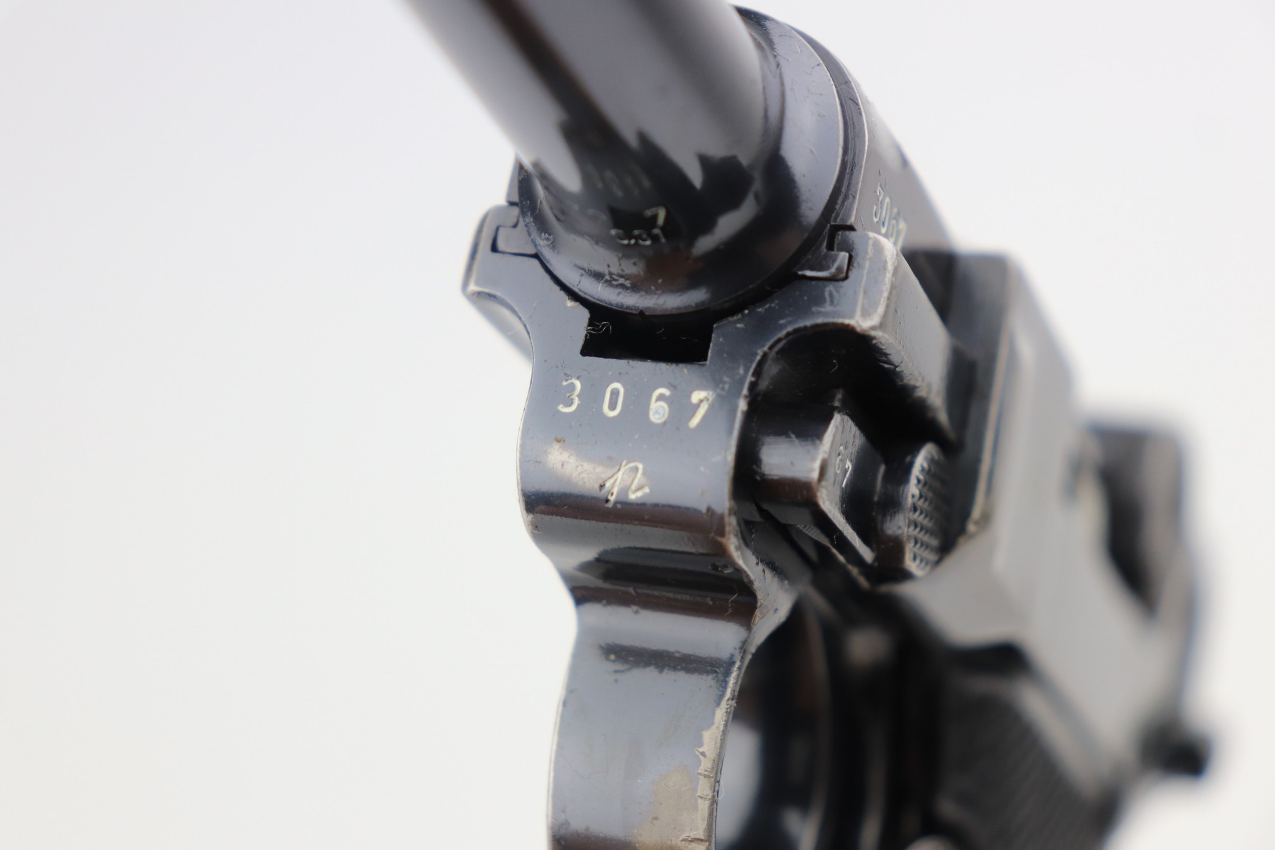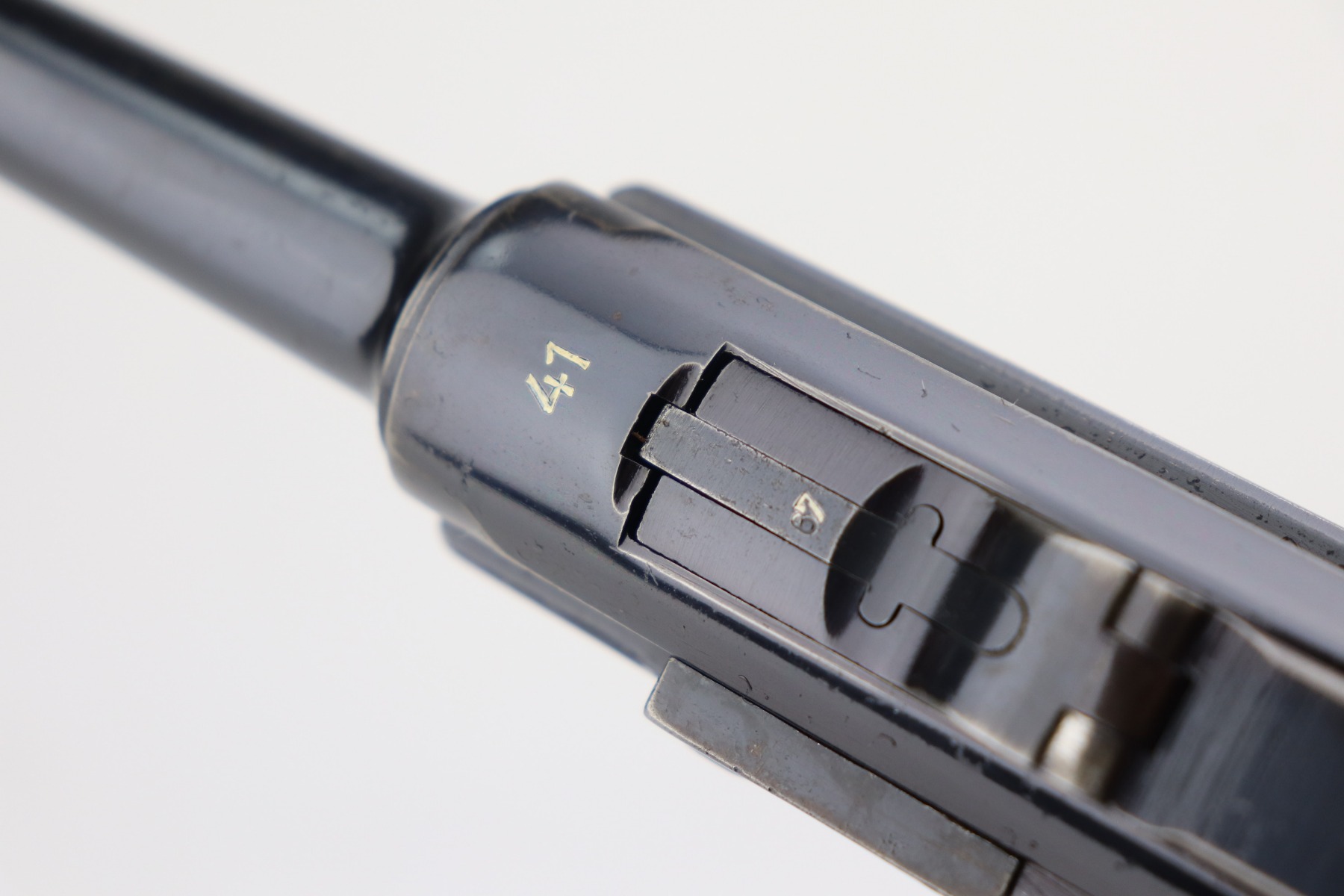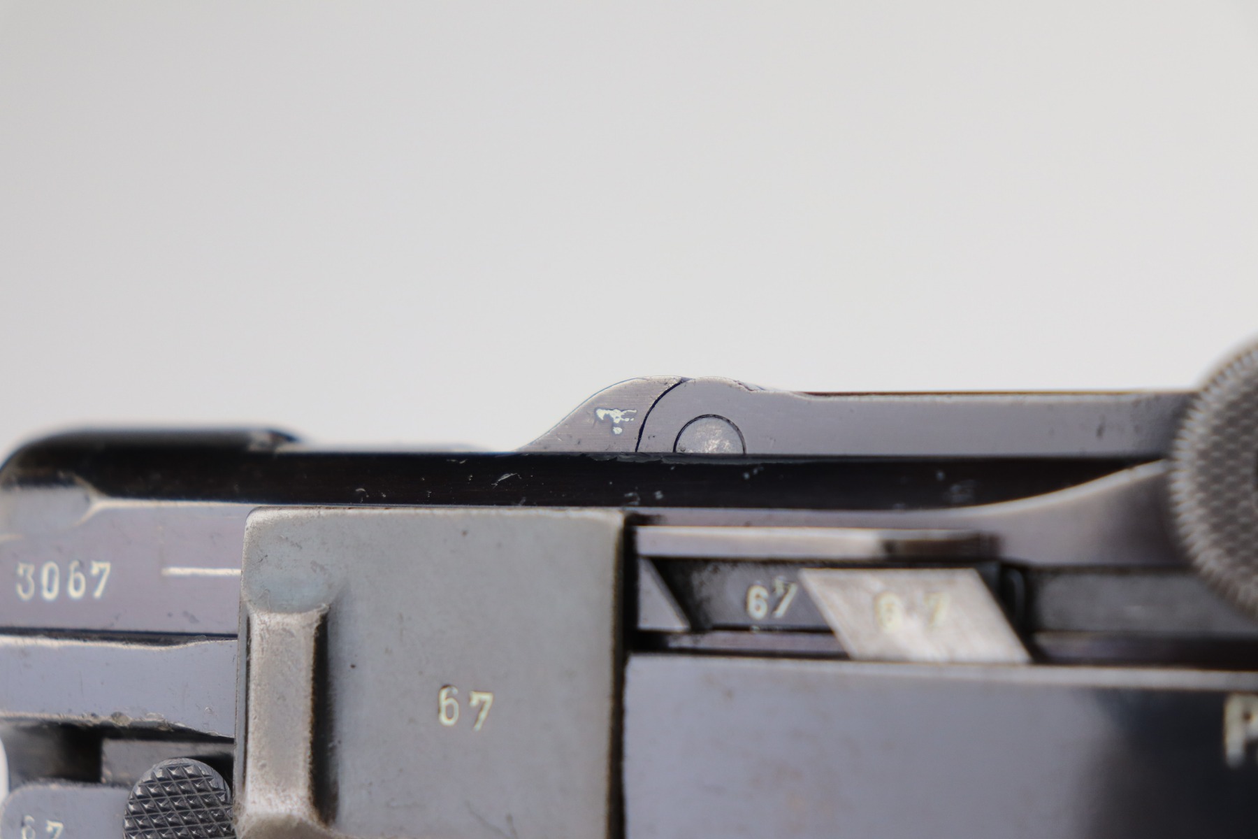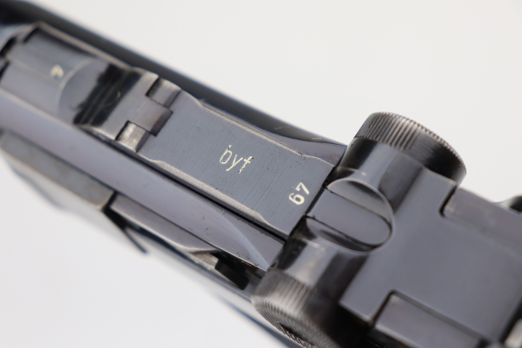 2/25/21 – This is a nice example of a Black Widow Luger Rig issued to the Nazi military in 1941. The gun comes with a 1941-dated holster, two black widow magazines, and an “Eagle 655” tool. The holster is stone mint and looks brand new. The gun is all matching and has the proper “Eagle 655” military proofs. It has retained roughly 60% of its finish. Most of the finish loss is on the straps, but there is also wear around the muzzle and most high edges in general. Excellent Black Widow grips. The bore is excellent – shiny with strong rifling.