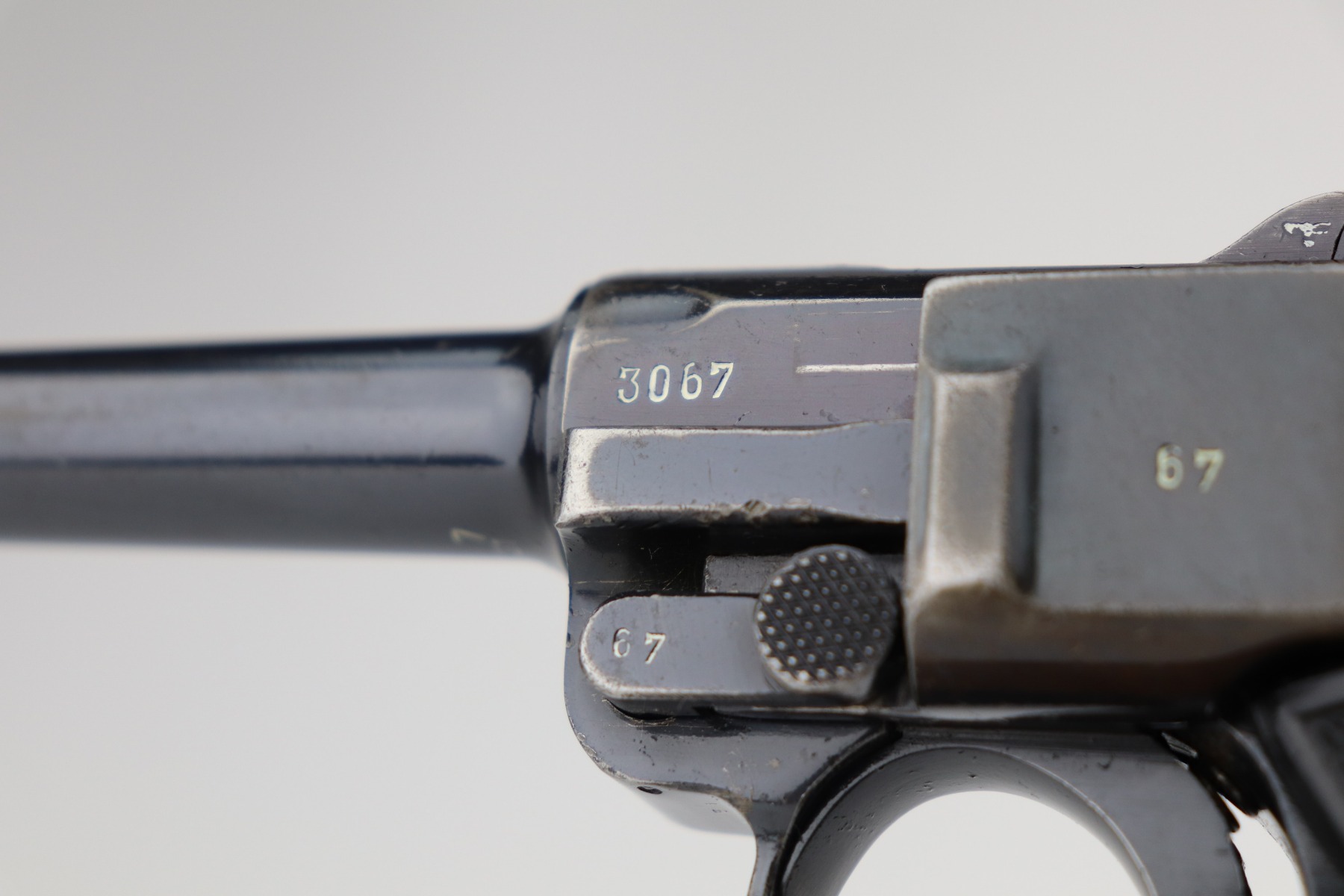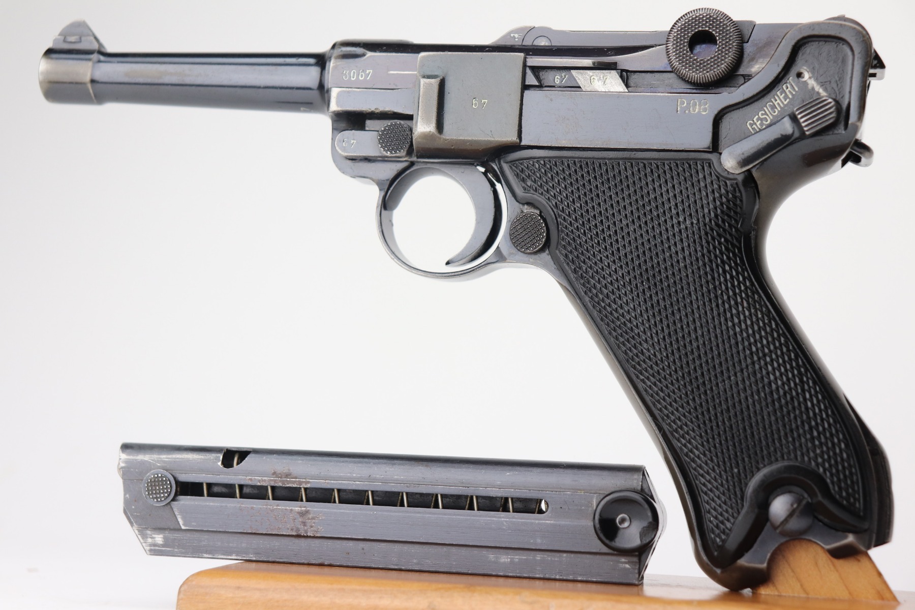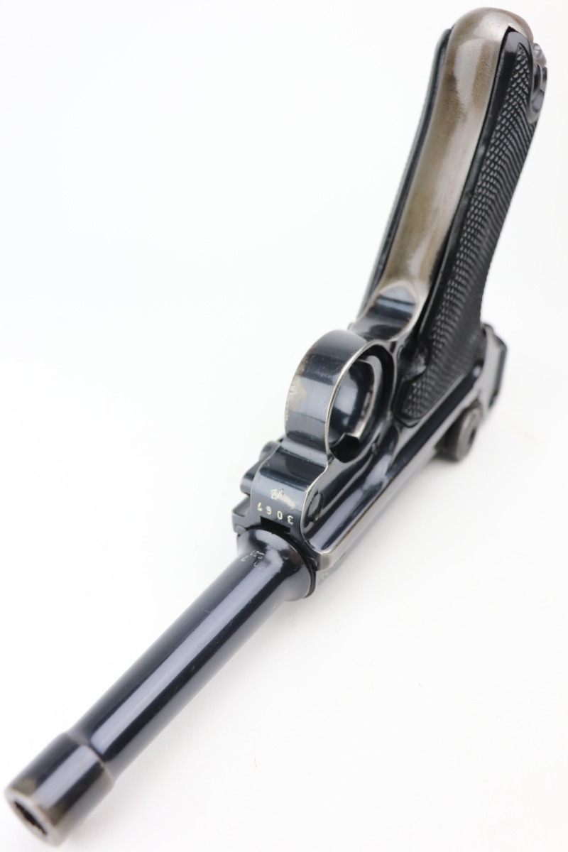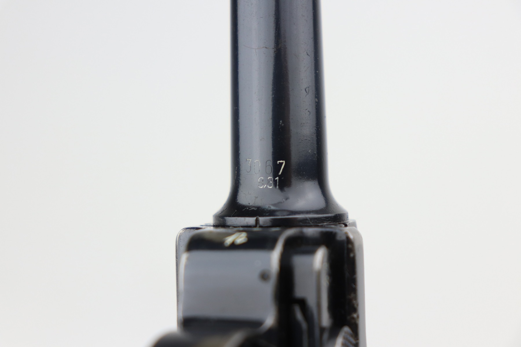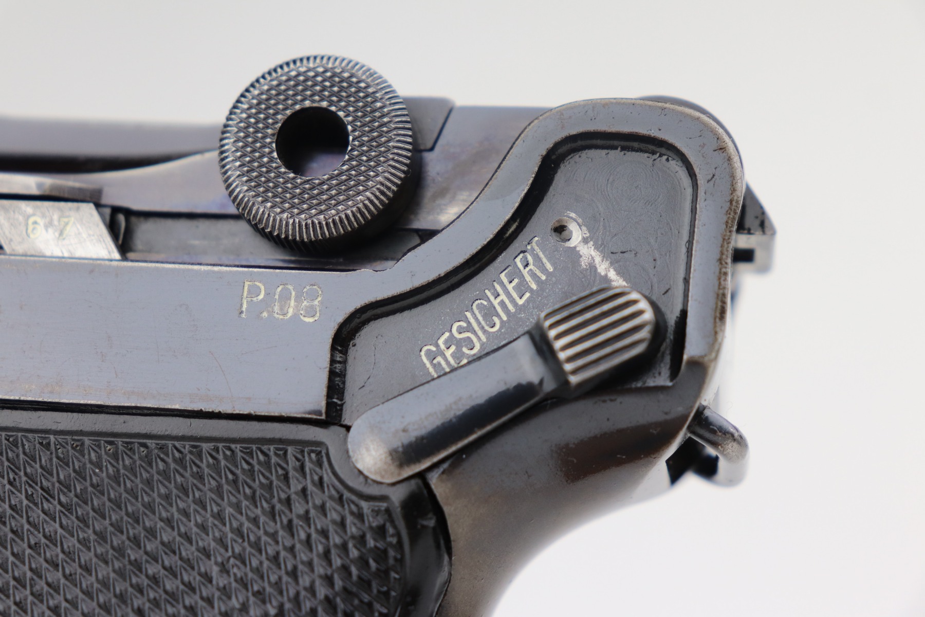 2/25/21 – This is a nice example of a Black Widow Luger Rig issued to the Nazi military in 1941. The gun comes with a 1941-dated holster, two black widow magazines, and an “Eagle 655” tool. The holster is stone mint and looks brand new. The gun is all matching and has the proper “Eagle 655” military proofs. It has retained roughly 60% of its finish. Most of the finish loss is on the straps, but there is also wear around the muzzle and most high edges in general. Excellent Black Widow grips. The bore is excellent – shiny with strong rifling.