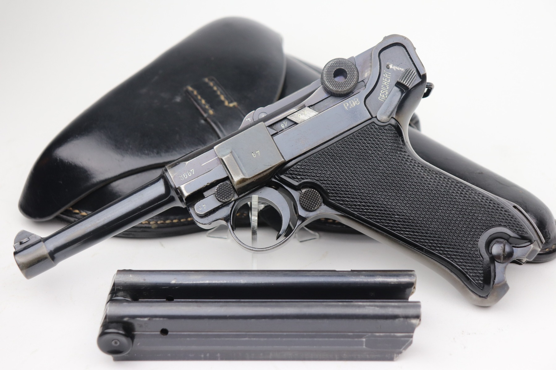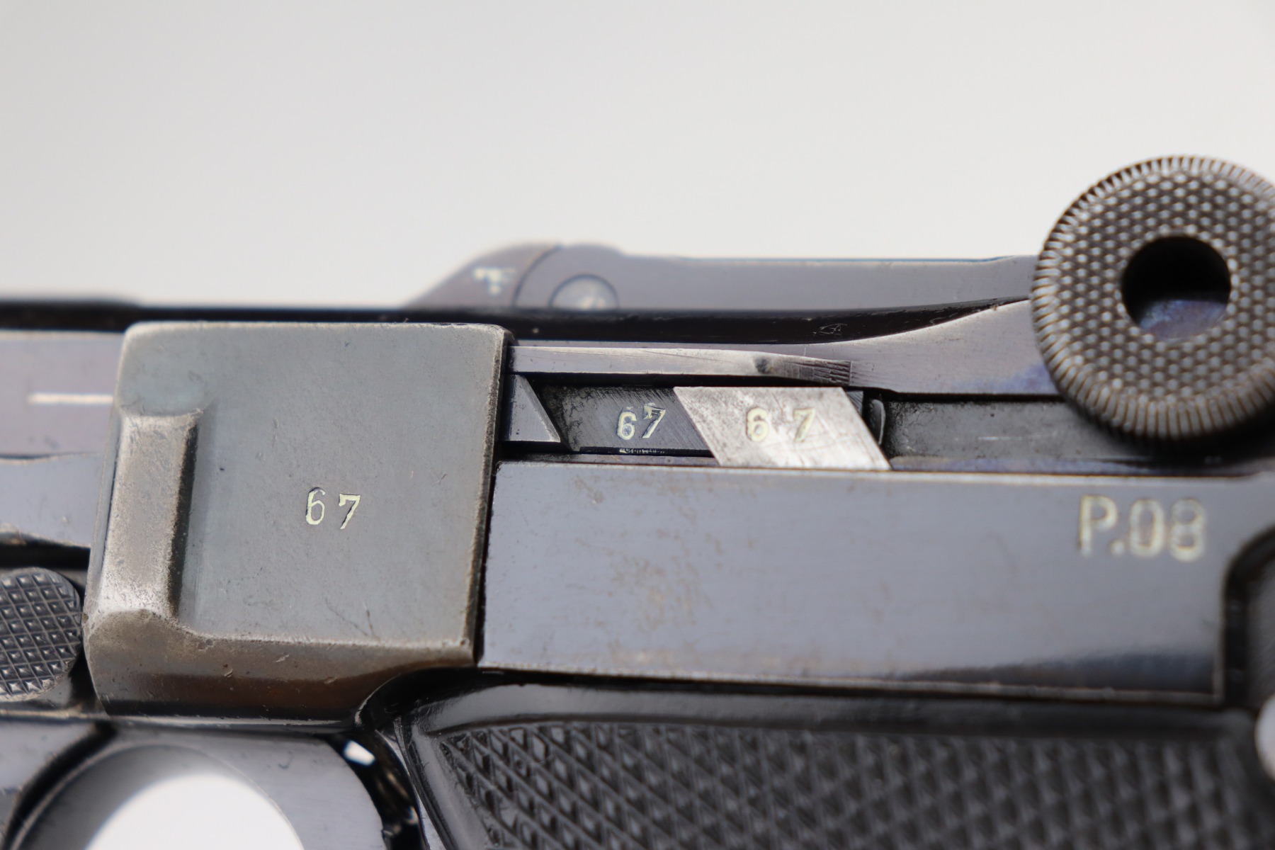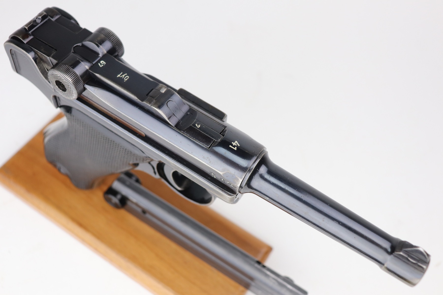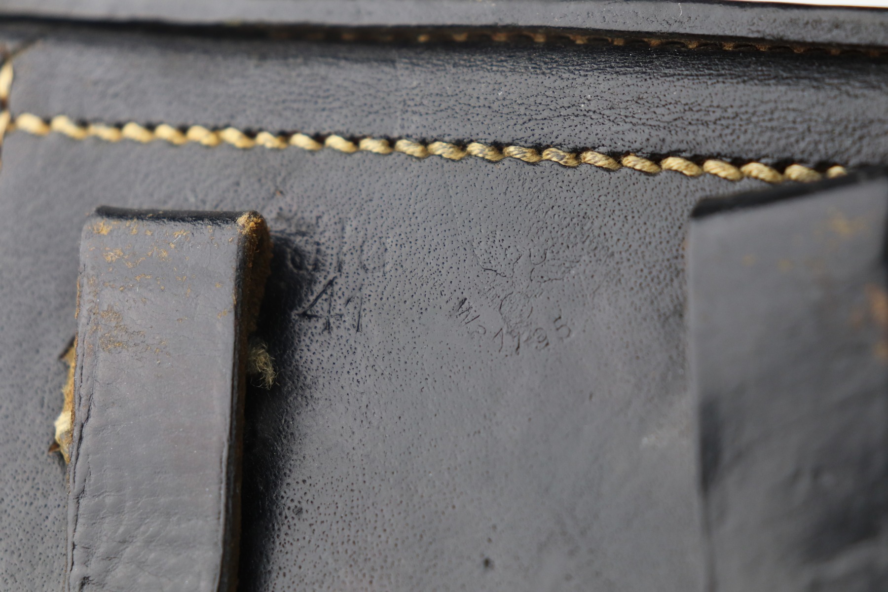 2/25/21 – This is a nice example of a Black Widow Luger Rig issued to the Nazi military in 1941. The gun comes with a 1941-dated holster, two black widow magazines, and an “Eagle 655” tool. The holster is stone mint and looks brand new. The gun is all matching and has the proper “Eagle 655” military proofs. It has retained roughly 60% of its finish. Most of the finish loss is on the straps, but there is also wear around the muzzle and most high edges in general. Excellent Black Widow grips. The bore is excellent – shiny with strong rifling.