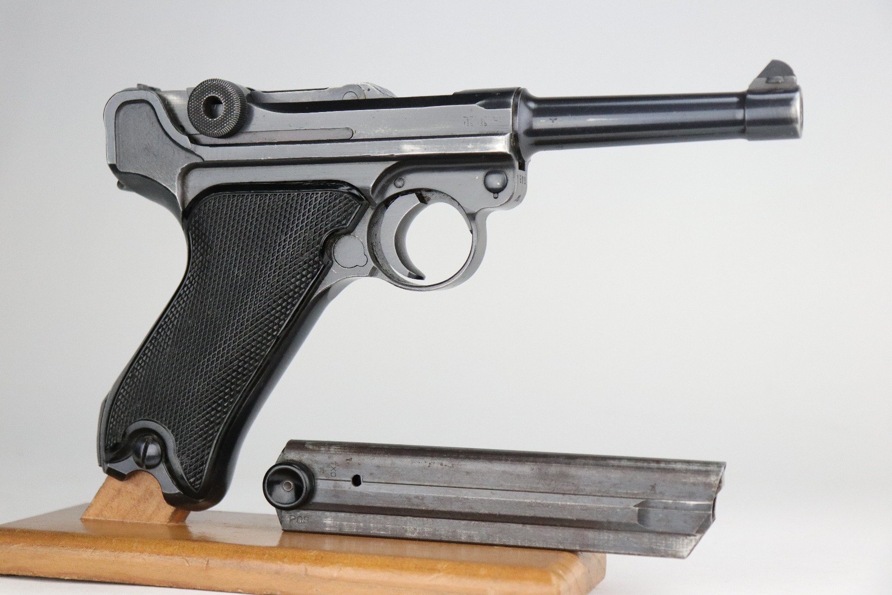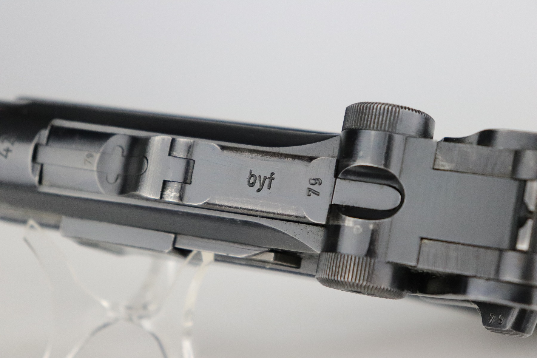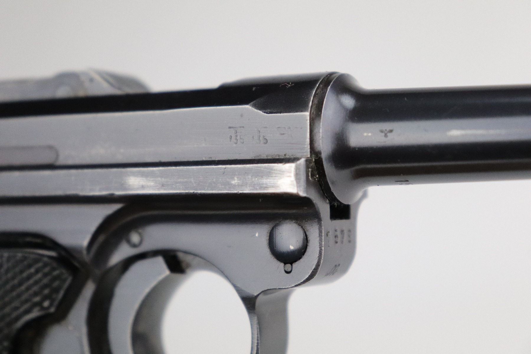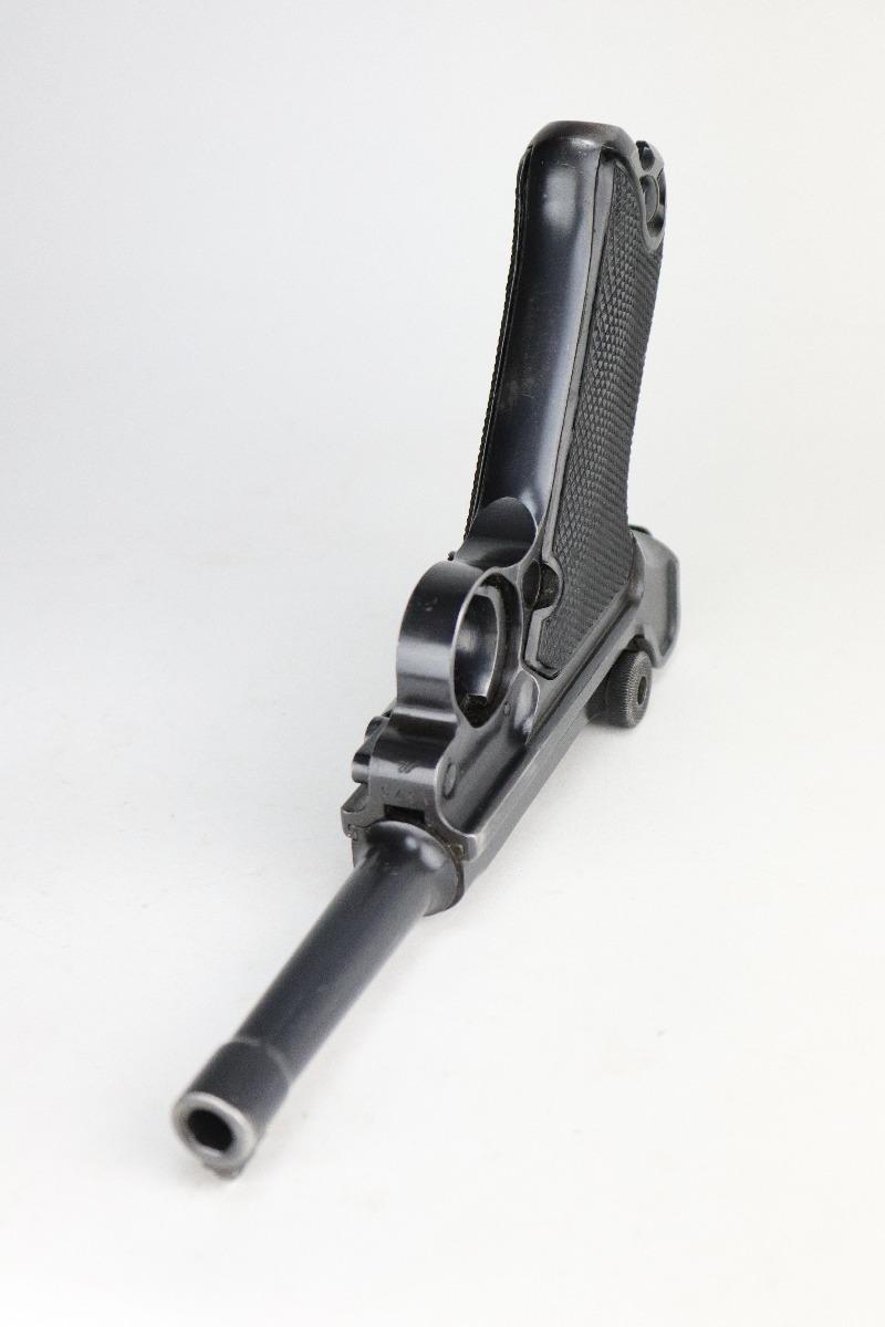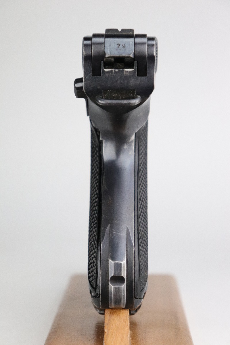 8/20/20 – This is an original “Black Widow” Mauser Luger P.08 issued to the Nazi military in 1942. It is dated 1942 and has the “byf” Mauser factory code. The right side of the slide is properly “Eagle 655” Nazi military proofed. There is a star marking on the barrel. The gun is completely matching. It has retained about 95% of its original finish. There is muzzle and general mionr high edge wear. One small spot of wear on the left side of the barrel. Minor spotty wear on the right side of the slide. Wear at the base of both straps. There are also small spots of wear and very minor handling marks on both straps. The grips are excellent and original. It comes with an excellent proper wartime black widow magazine. The bore is excellent – shiny with strong rifling.