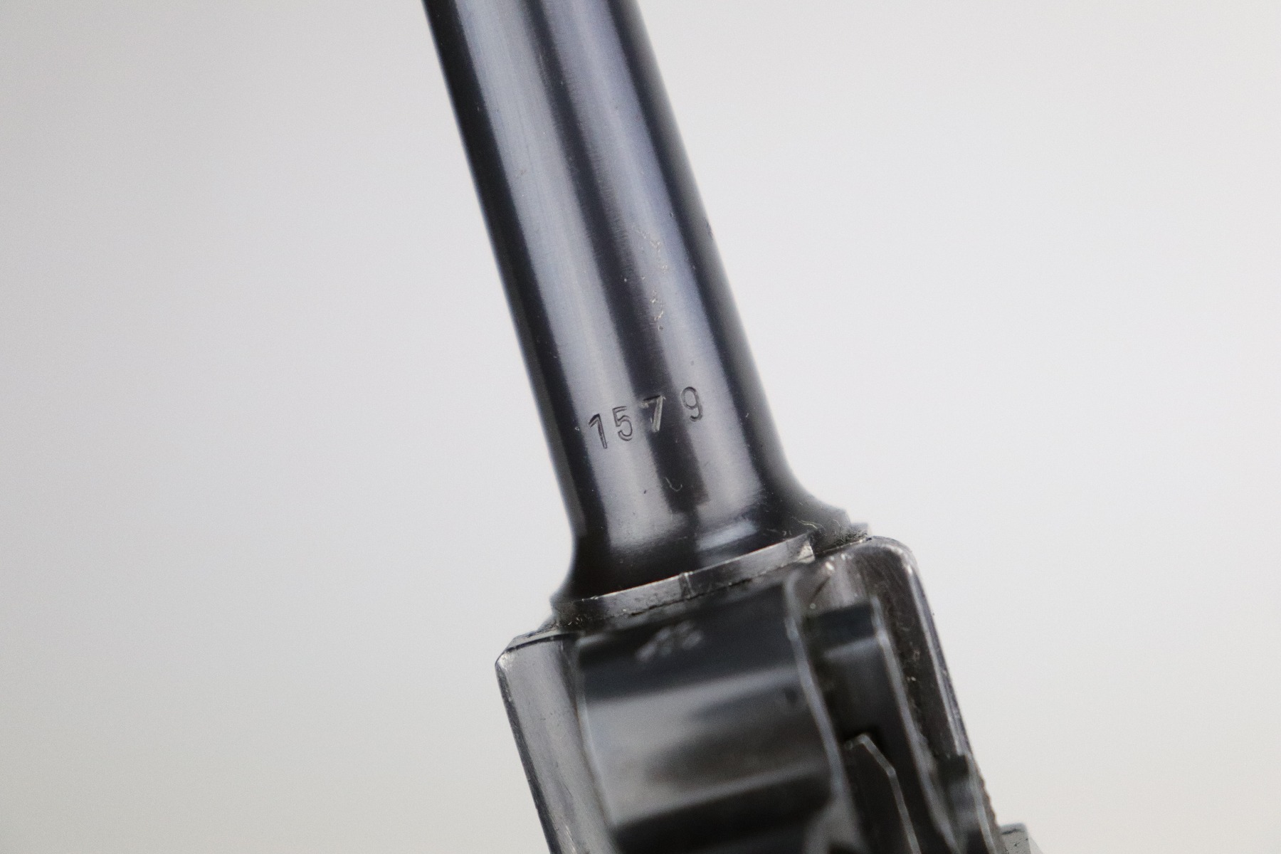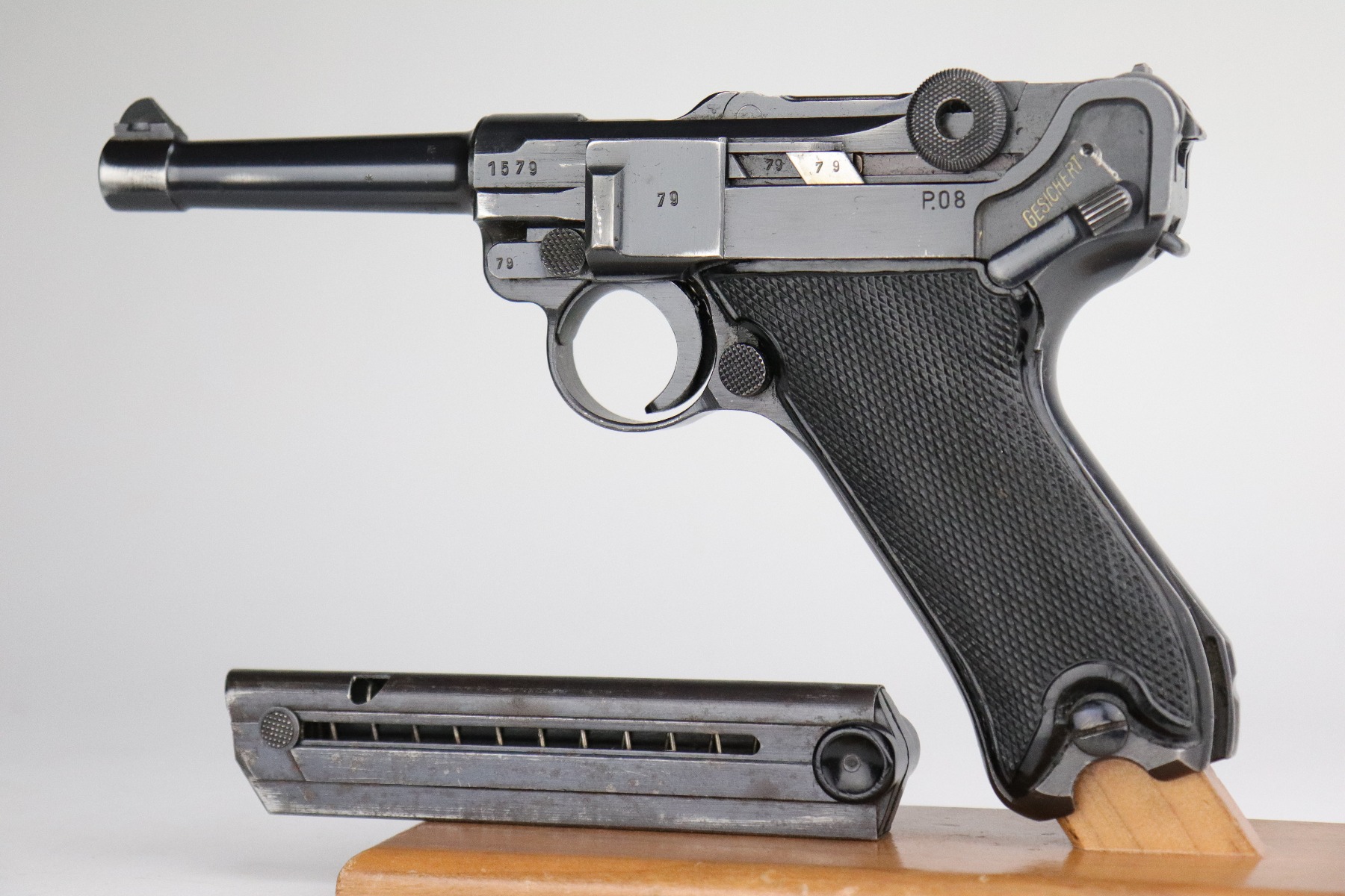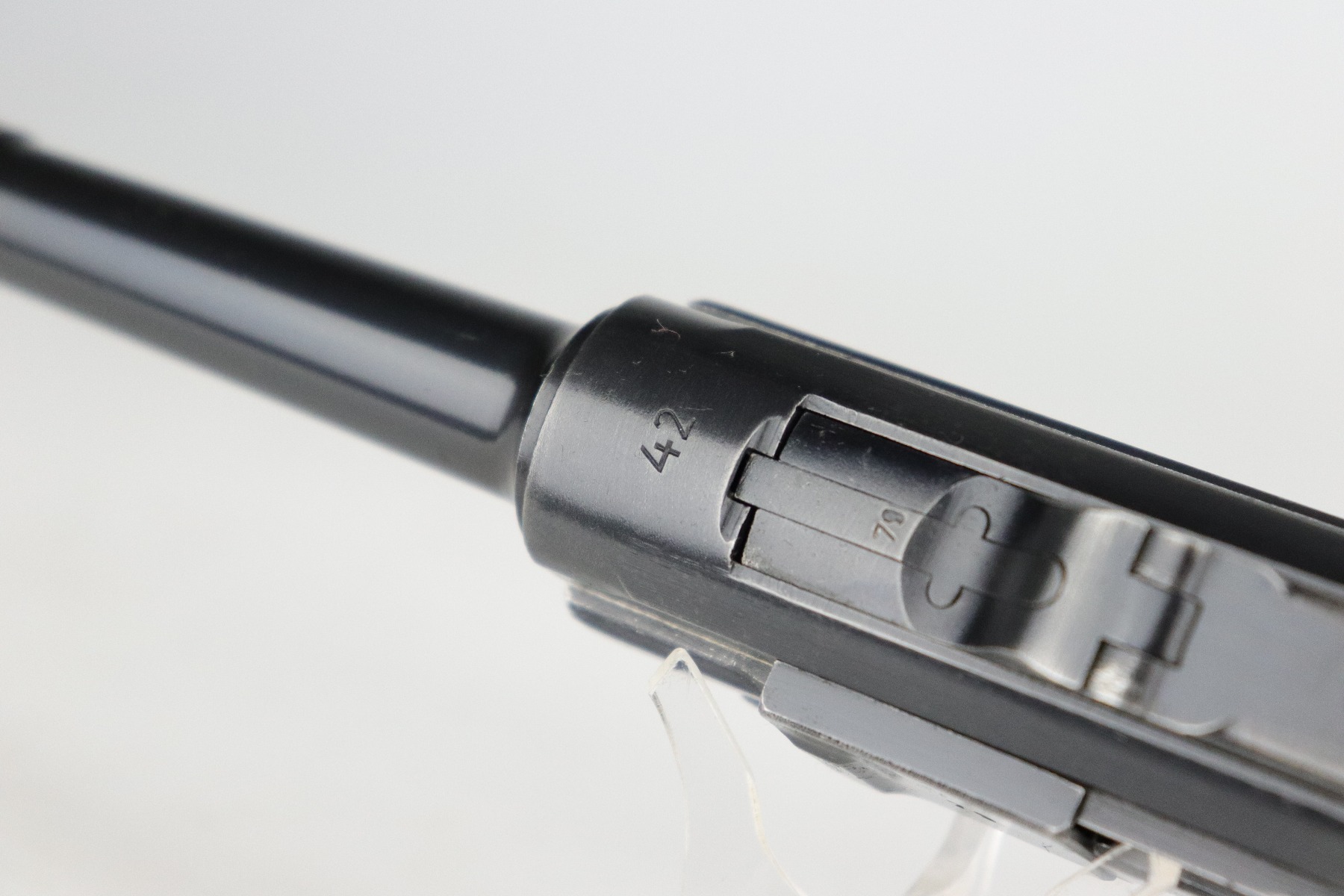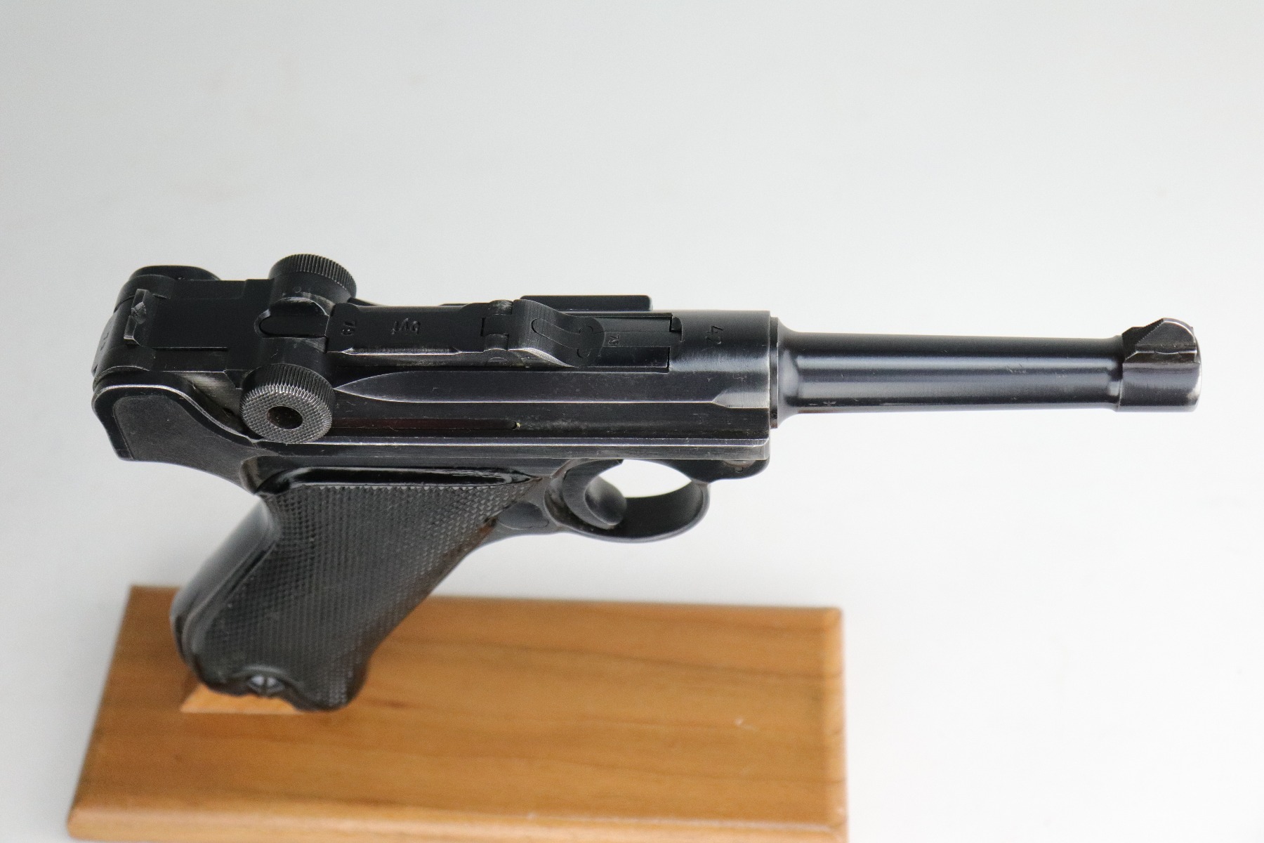 8/20/20 – This is an original “Black Widow” Mauser Luger P.08 issued to the Nazi military in 1942. It is dated 1942 and has the “byf” Mauser factory code. The right side of the slide is properly “Eagle 655” Nazi military proofed. There is a star marking on the barrel. The gun is completely matching. It has retained about 95% of its original finish. There is muzzle and general mionr high edge wear. One small spot of wear on the left side of the barrel. Minor spotty wear on the right side of the slide. Wear at the base of both straps. There are also small spots of wear and very minor handling marks on both straps. The grips are excellent and original. It comes with an excellent proper wartime black widow magazine. The bore is excellent – shiny with strong rifling.