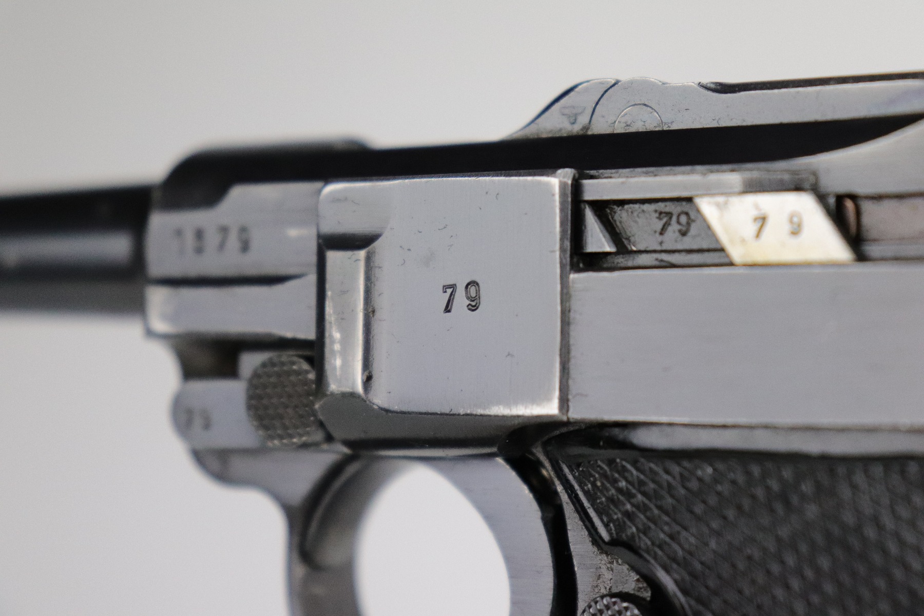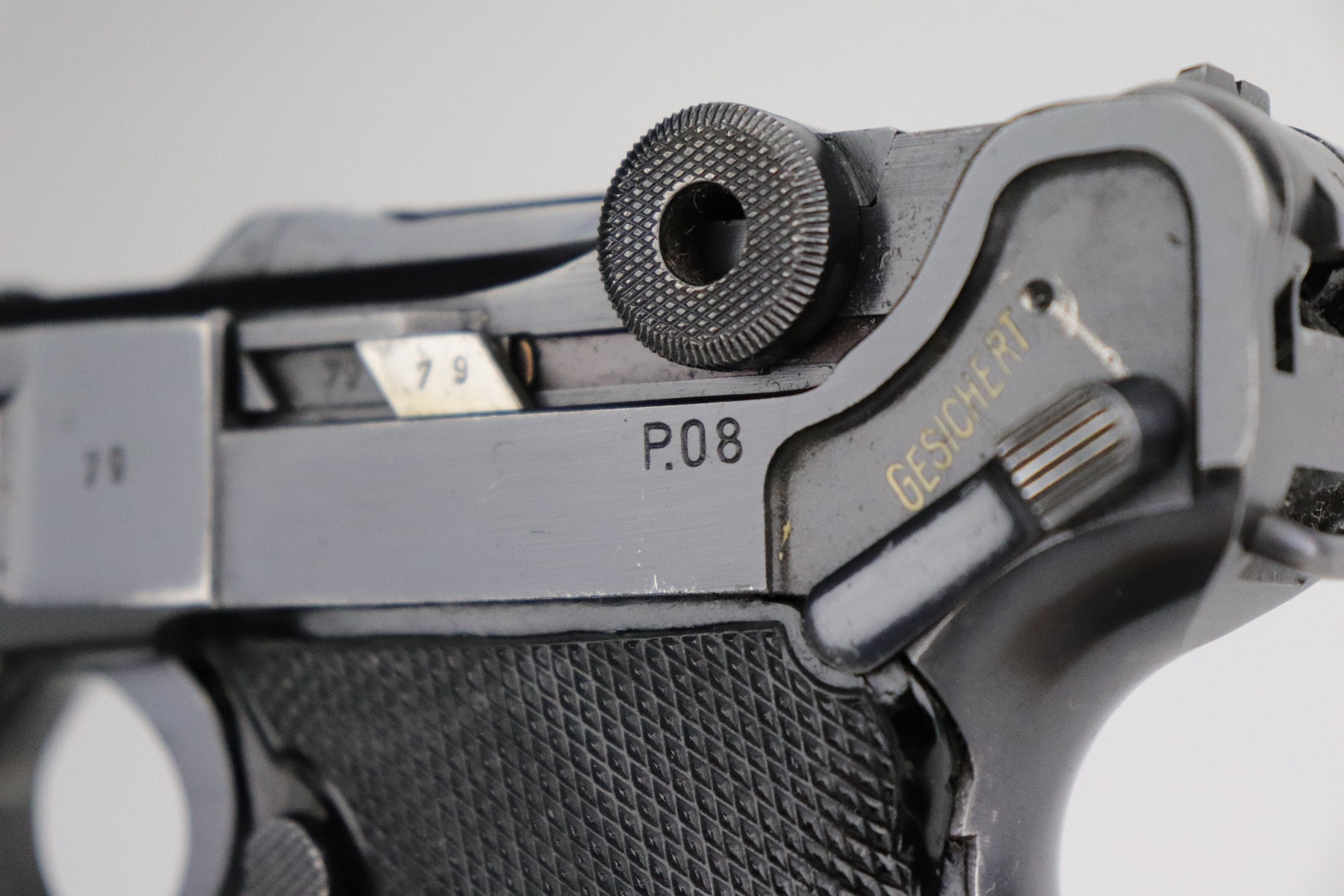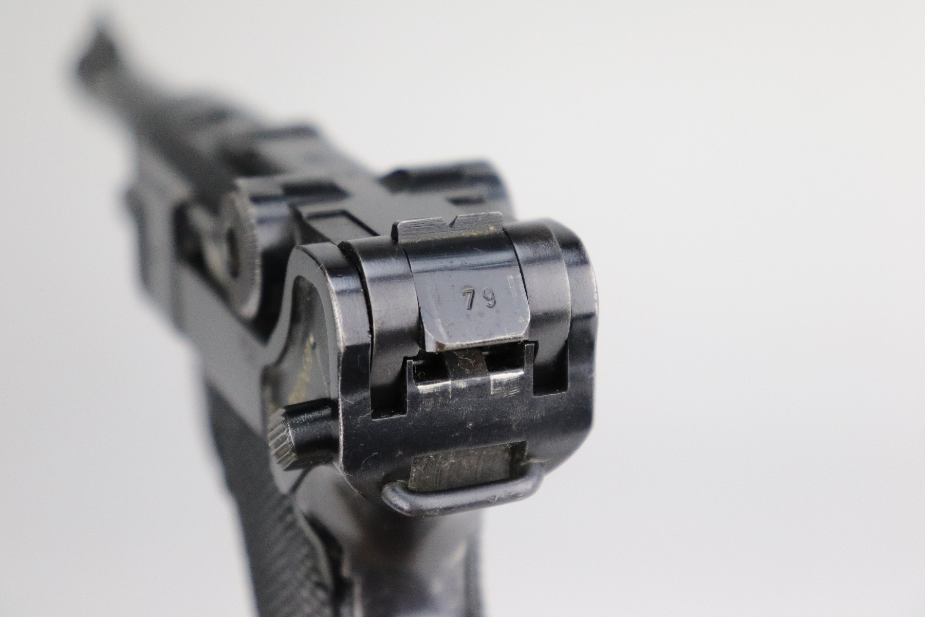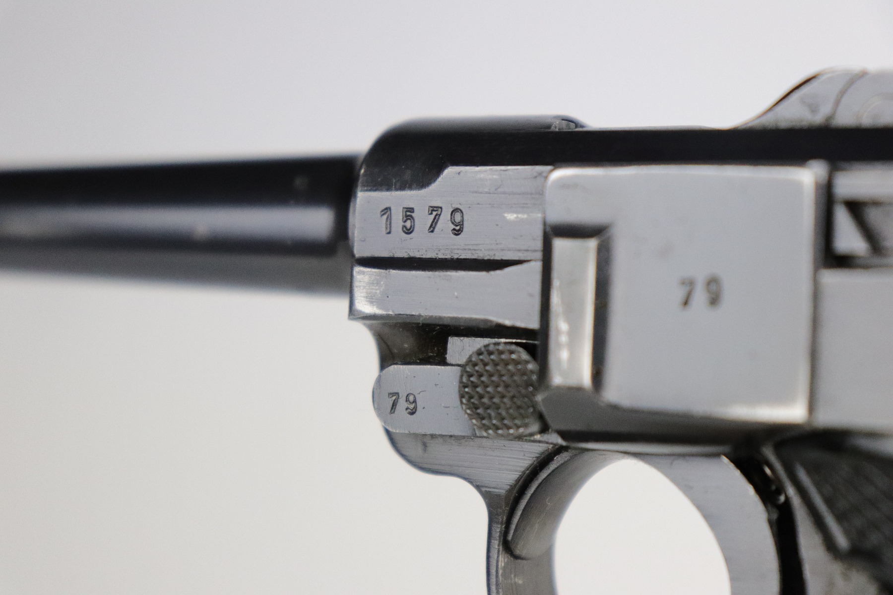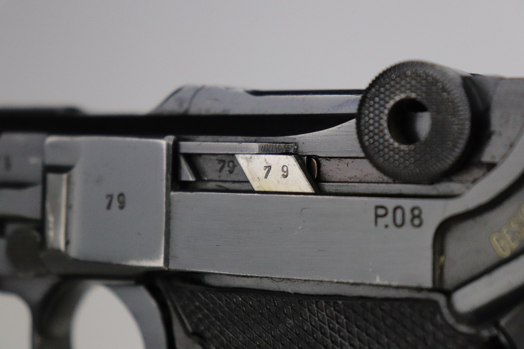 8/20/20 – This is an original “Black Widow” Mauser Luger P.08 issued to the Nazi military in 1942. It is dated 1942 and has the “byf” Mauser factory code. The right side of the slide is properly “Eagle 655” Nazi military proofed. There is a star marking on the barrel. The gun is completely matching. It has retained about 95% of its original finish. There is muzzle and general mionr high edge wear. One small spot of wear on the left side of the barrel. Minor spotty wear on the right side of the slide. Wear at the base of both straps. There are also small spots of wear and very minor handling marks on both straps. The grips are excellent and original. It comes with an excellent proper wartime black widow magazine. The bore is excellent – shiny with strong rifling.