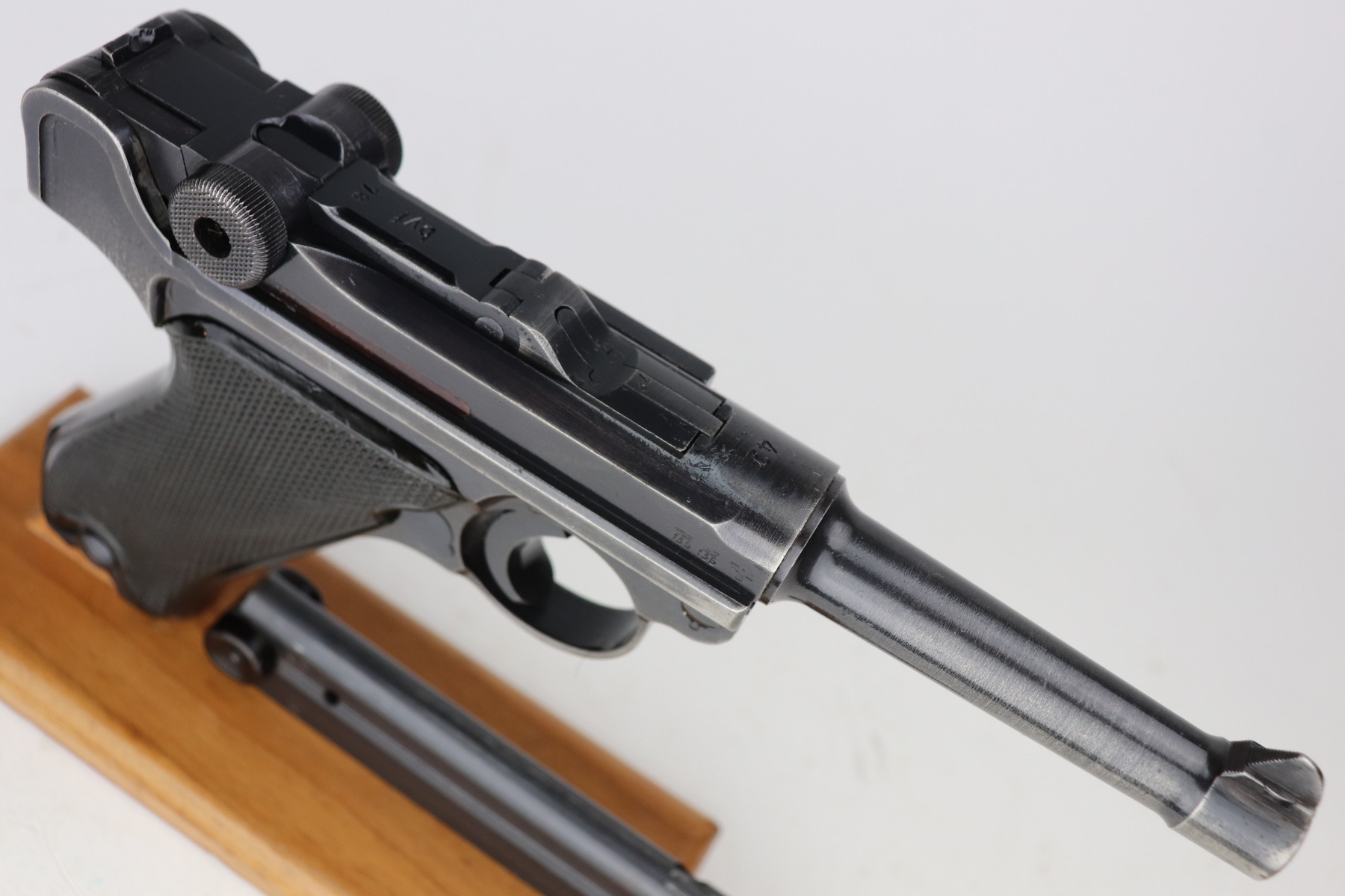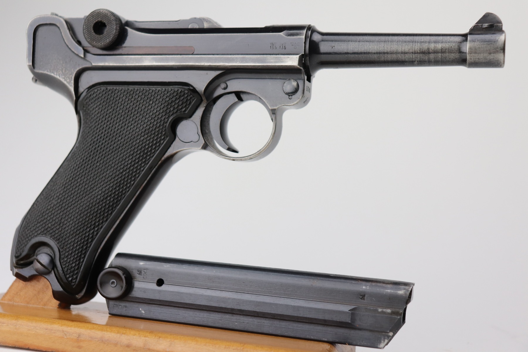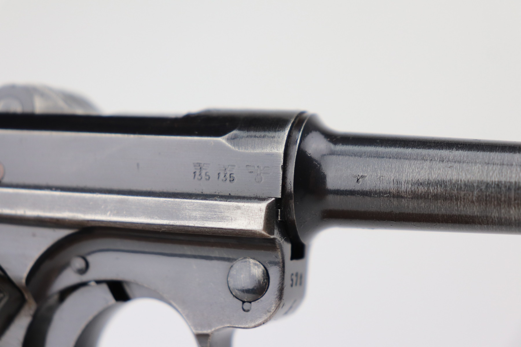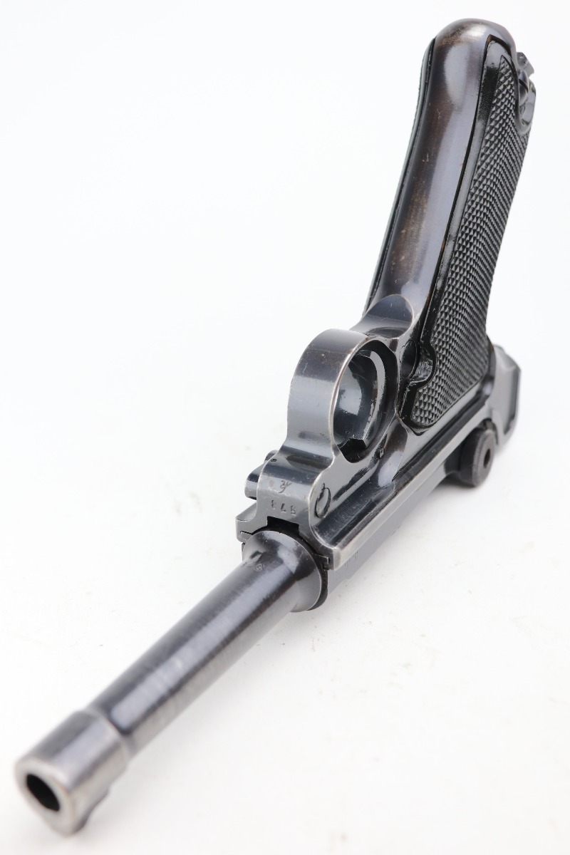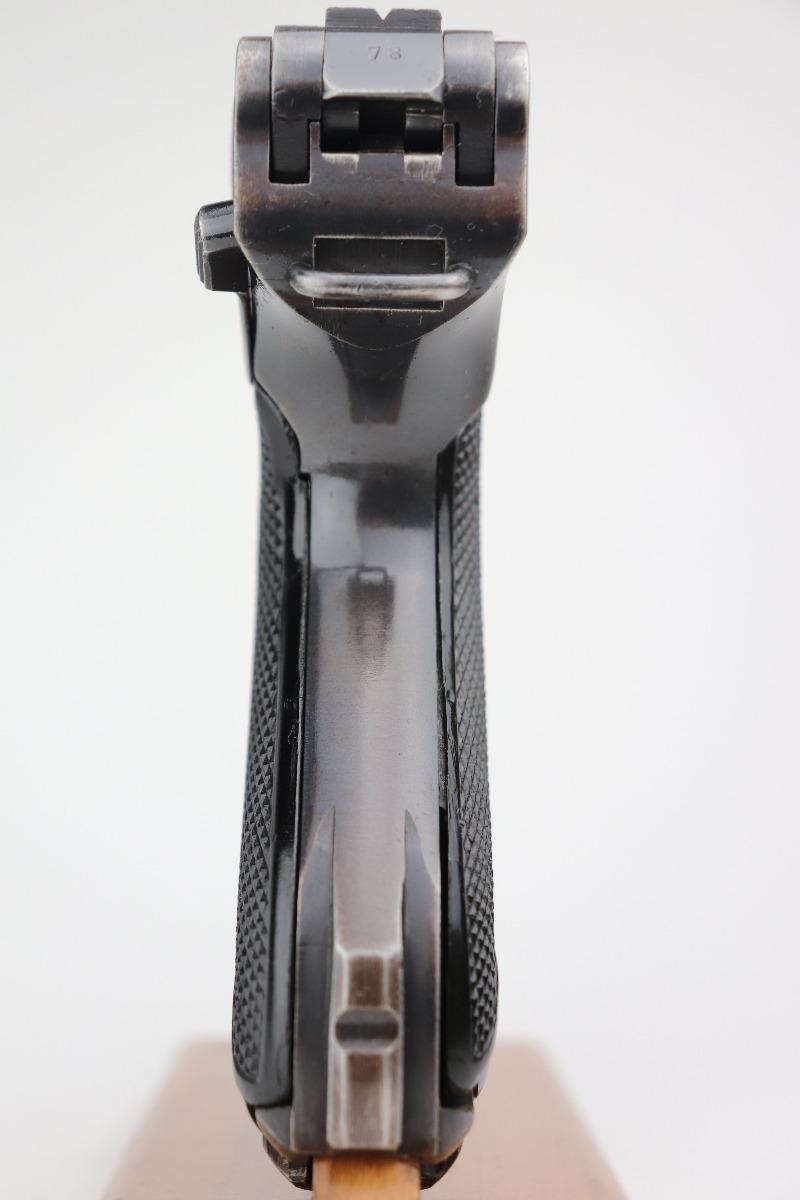 3/4/21 – This is a very nice example of a Black Widow Mauser Luger issued to the Nazi military in 1942. It is all matching and has the proper “Eagle 135” military proofs. It has retained about 90% of its original bluing. There is somewhat spotty wear on the front strap, left side of the frame, side plate, high edges of the frame, around the muzzle, and chamber. Thinning on the barrel. It comes with excellent original black widow grips and a black widow magazine. The bore is shiny with strong rifling and areas of minor freckling throughout.