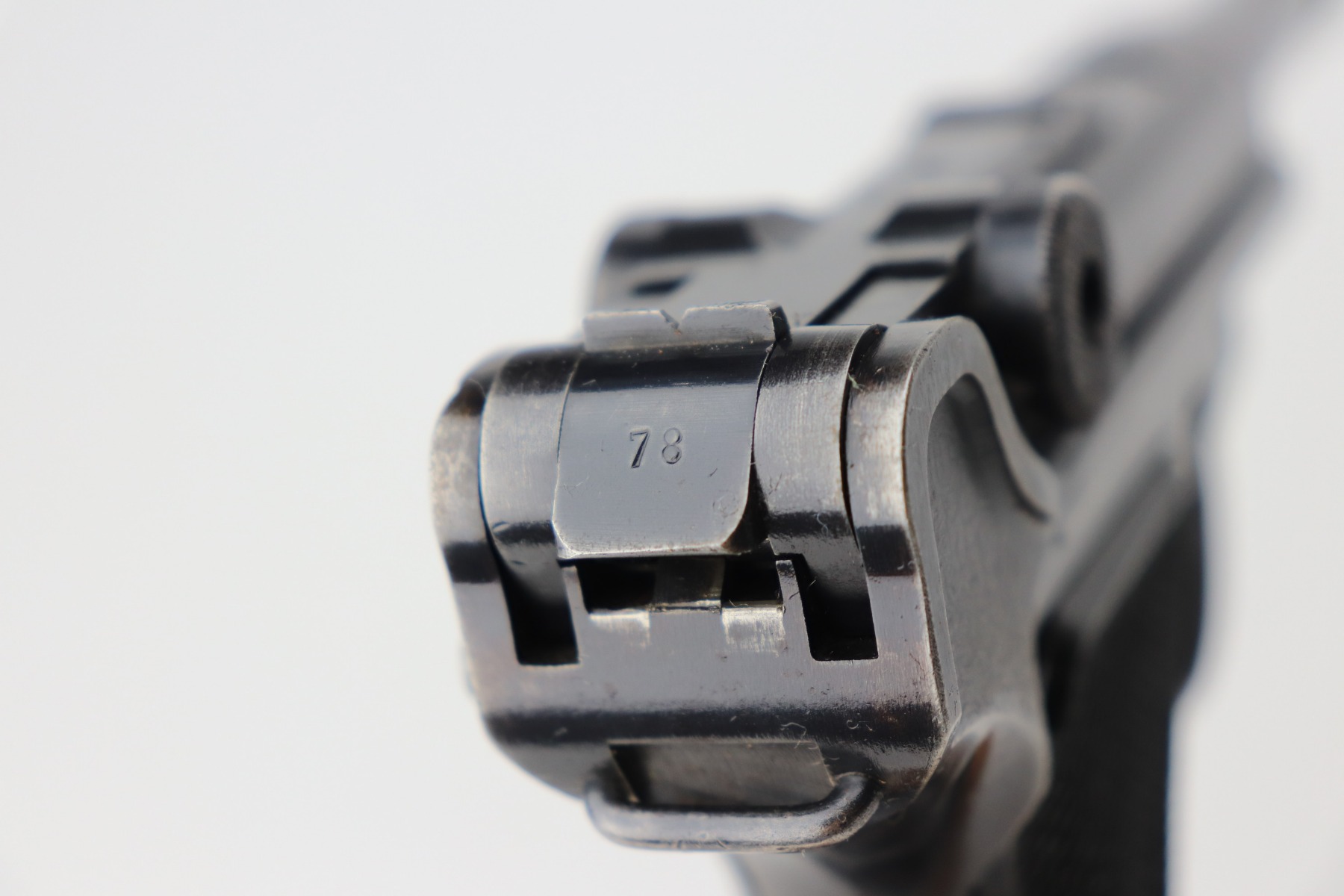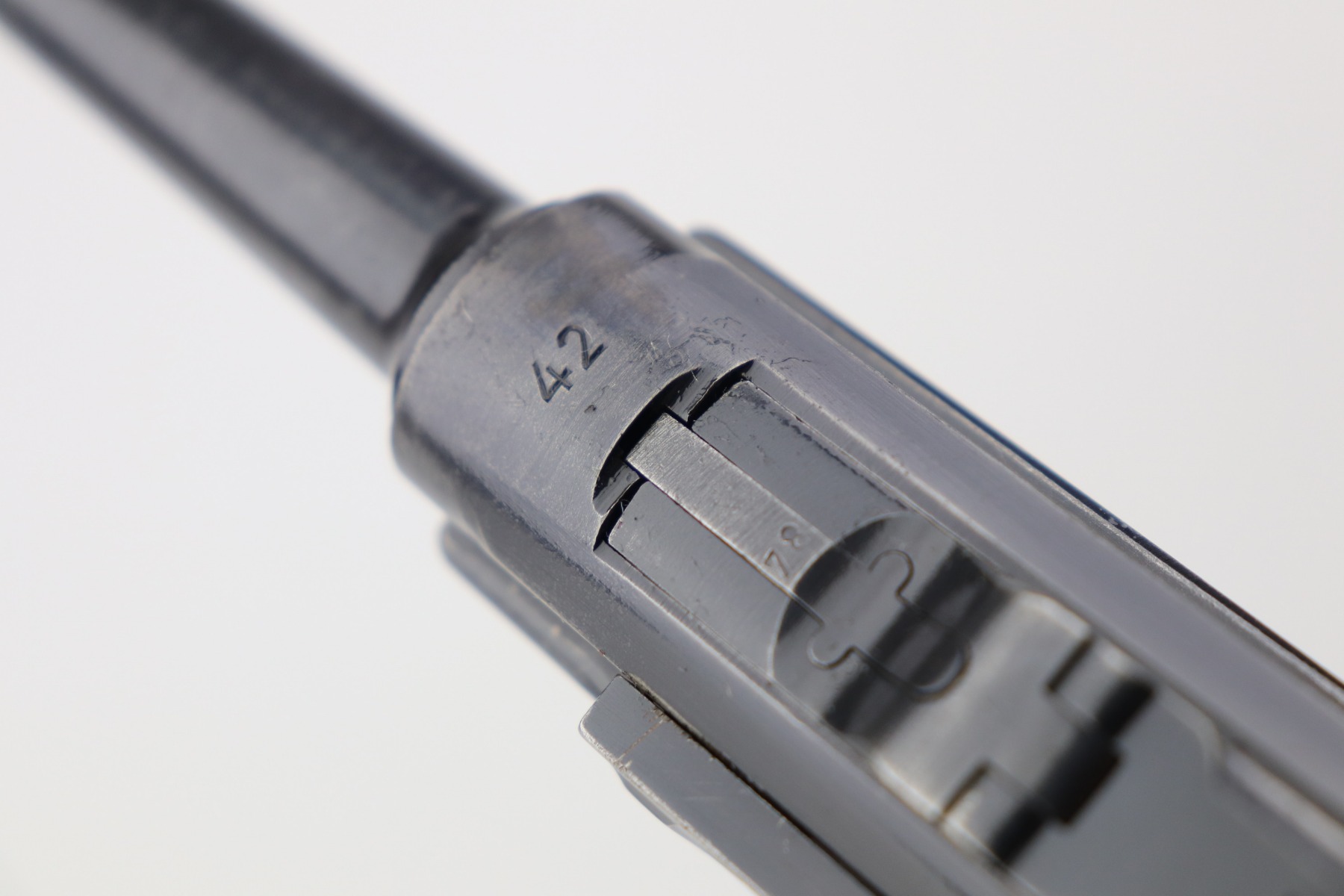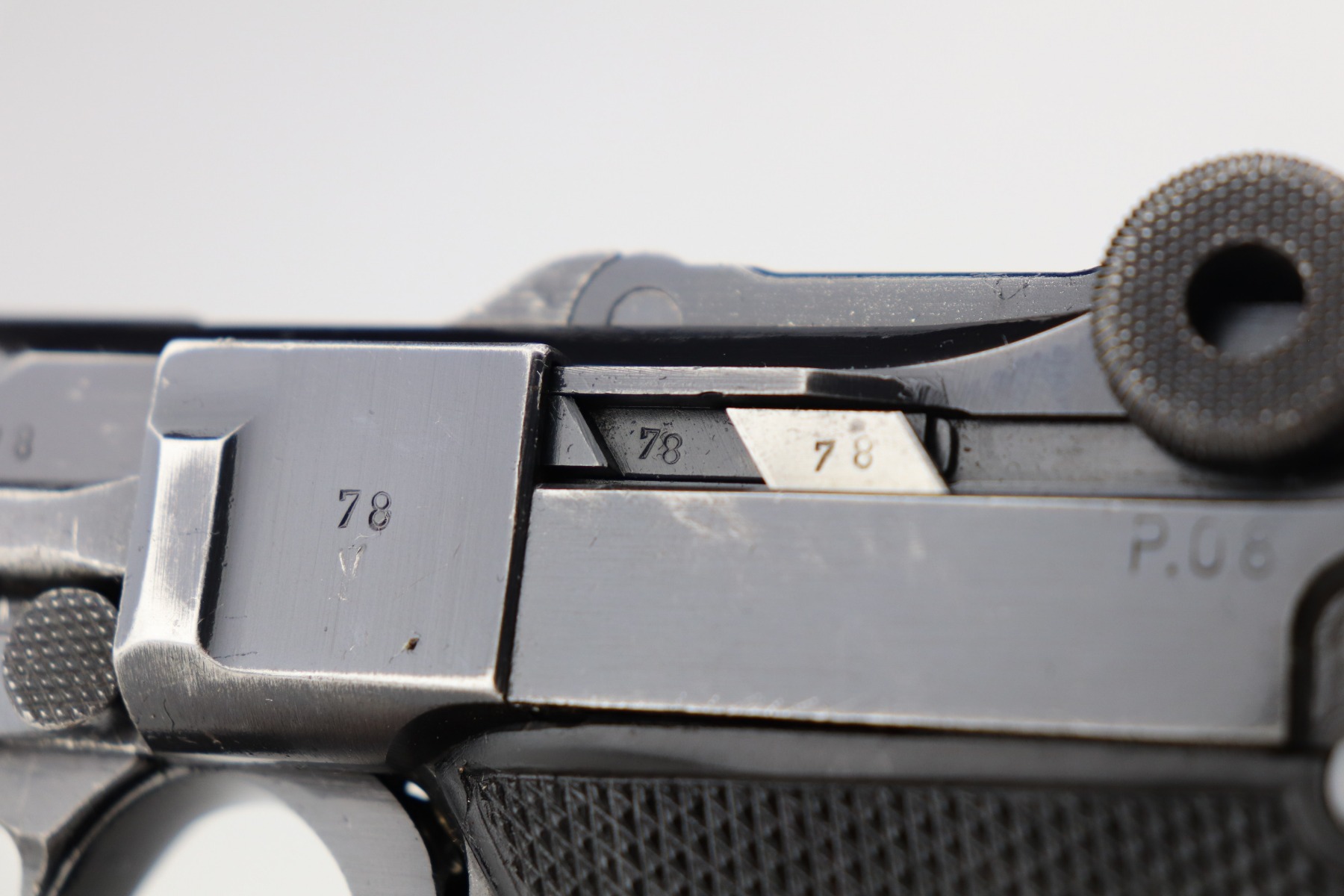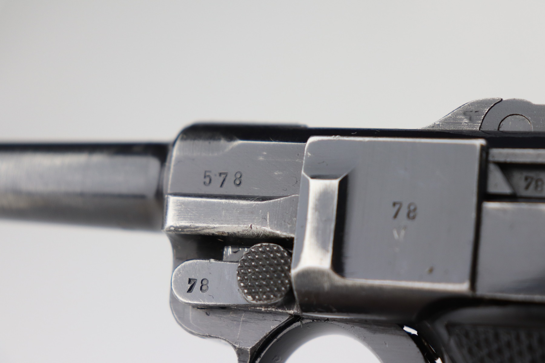 3/4/21 – This is a very nice example of a Black Widow Mauser Luger issued to the Nazi military in 1942. It is all matching and has the proper “Eagle 135” military proofs. It has retained about 90% of its original bluing. There is somewhat spotty wear on the front strap, left side of the frame, side plate, high edges of the frame, around the muzzle, and chamber. Thinning on the barrel. It comes with excellent original black widow grips and a black widow magazine. The bore is shiny with strong rifling and areas of minor freckling throughout.
