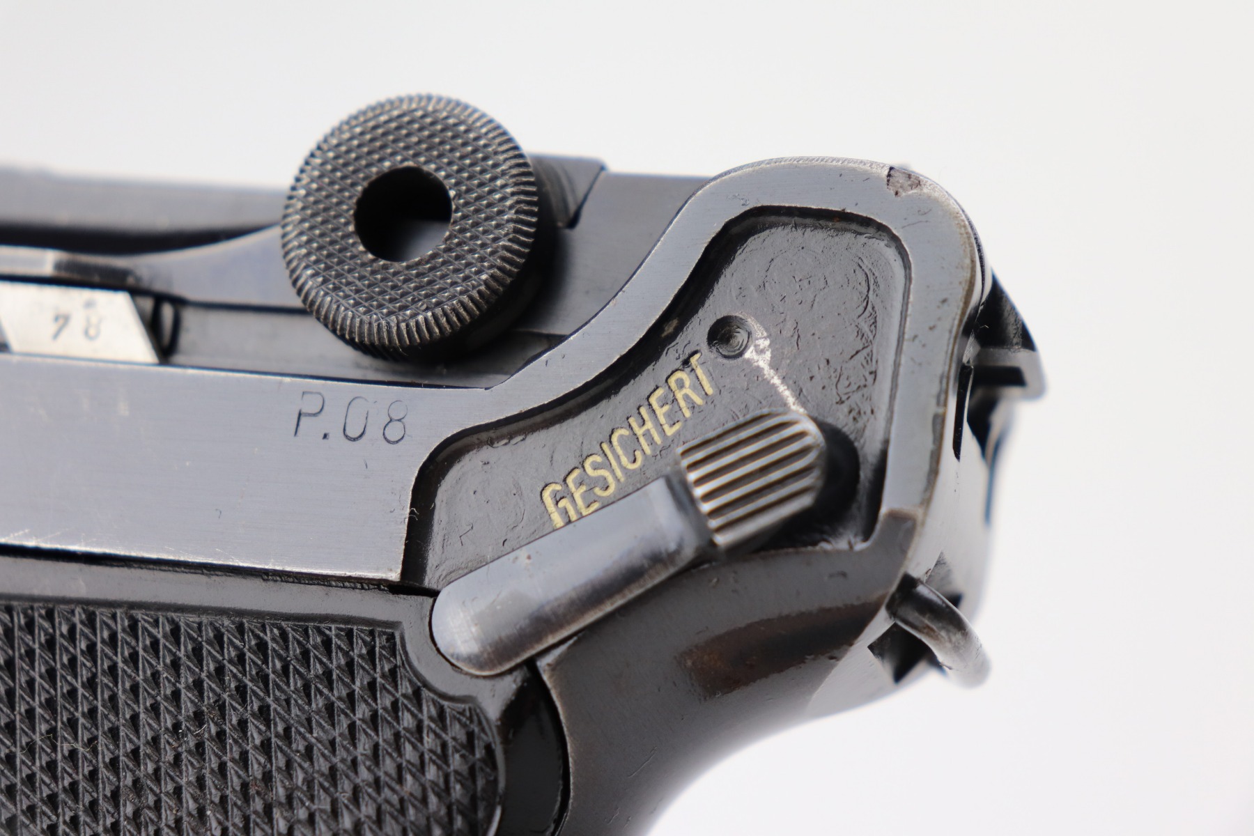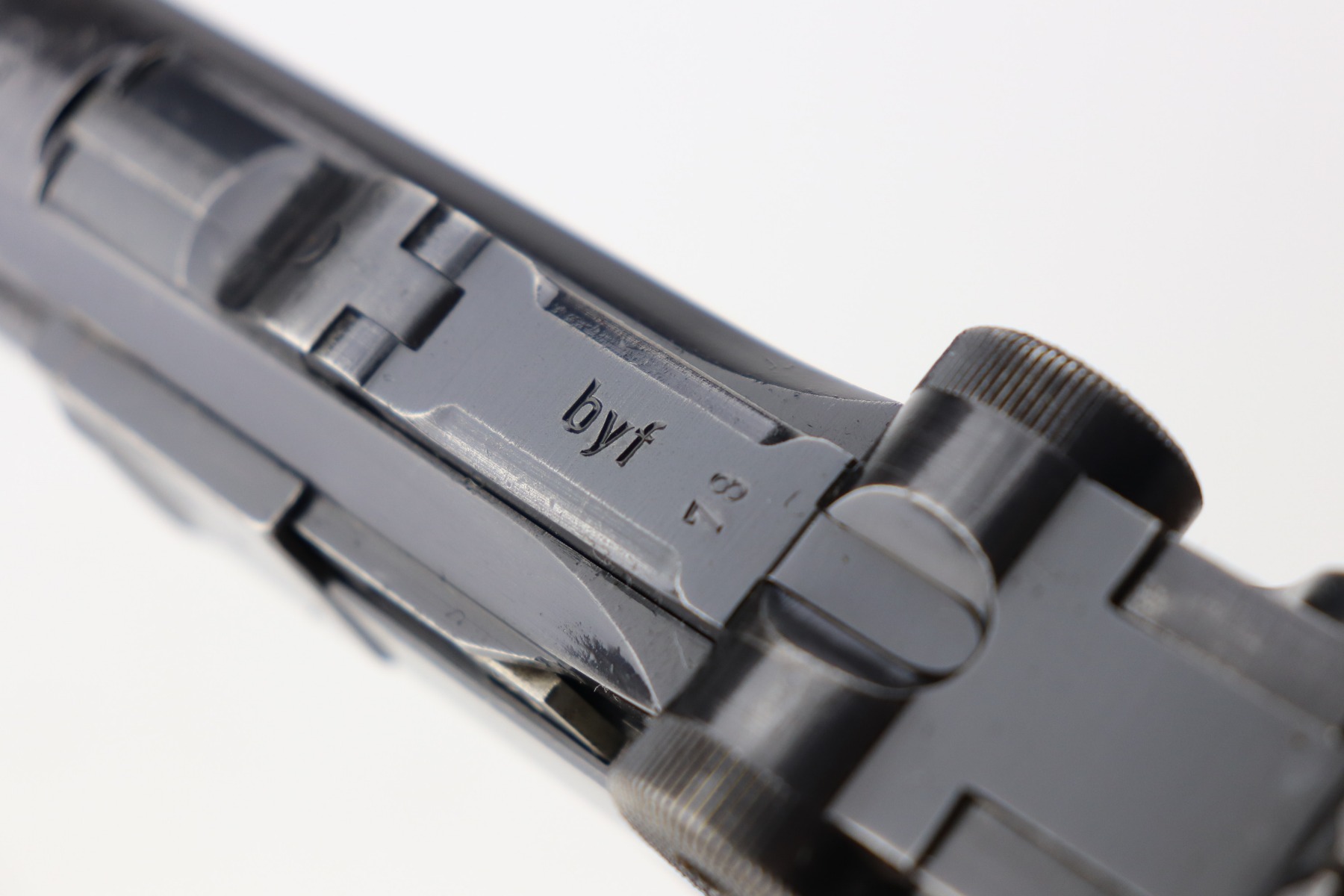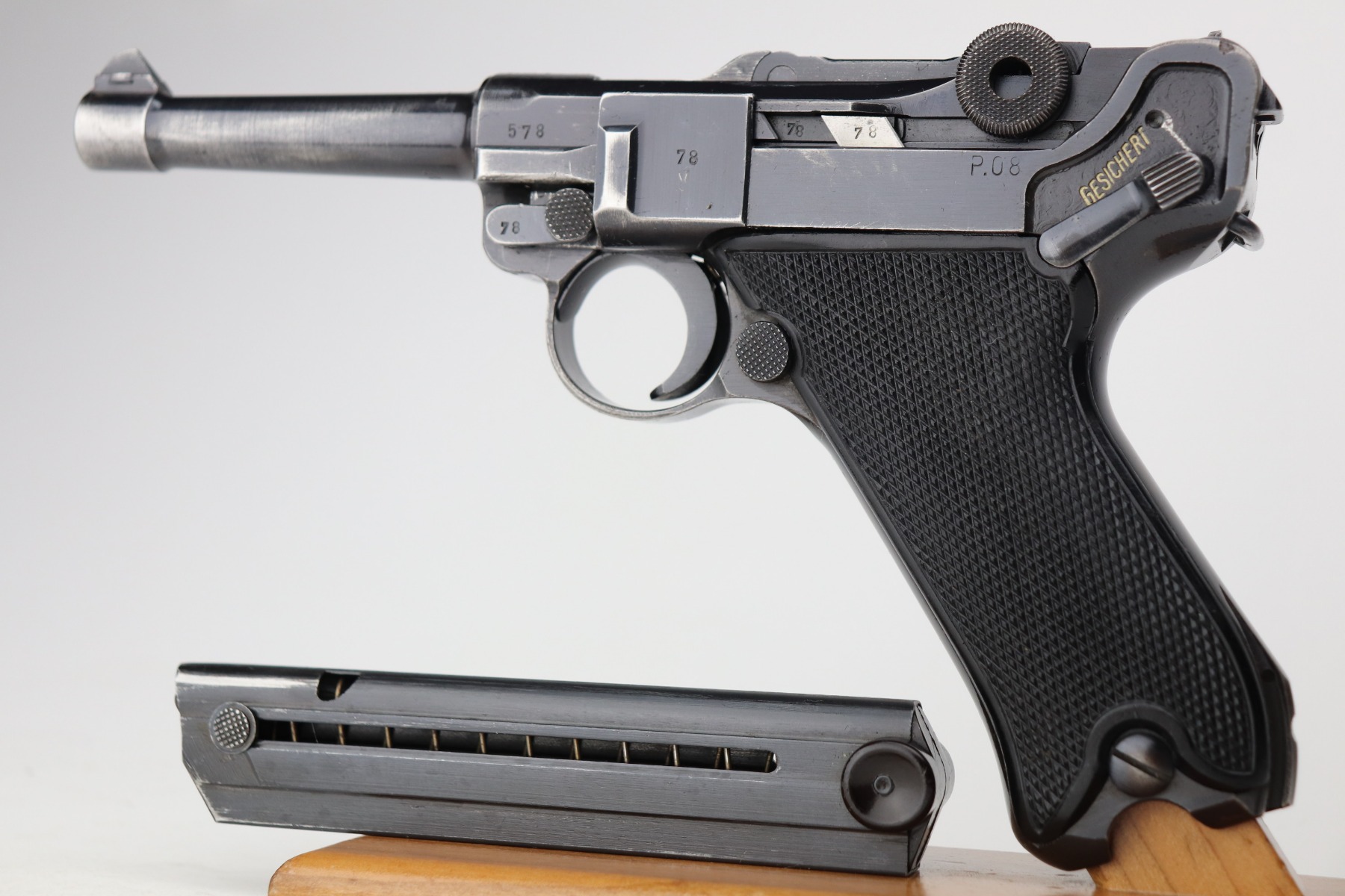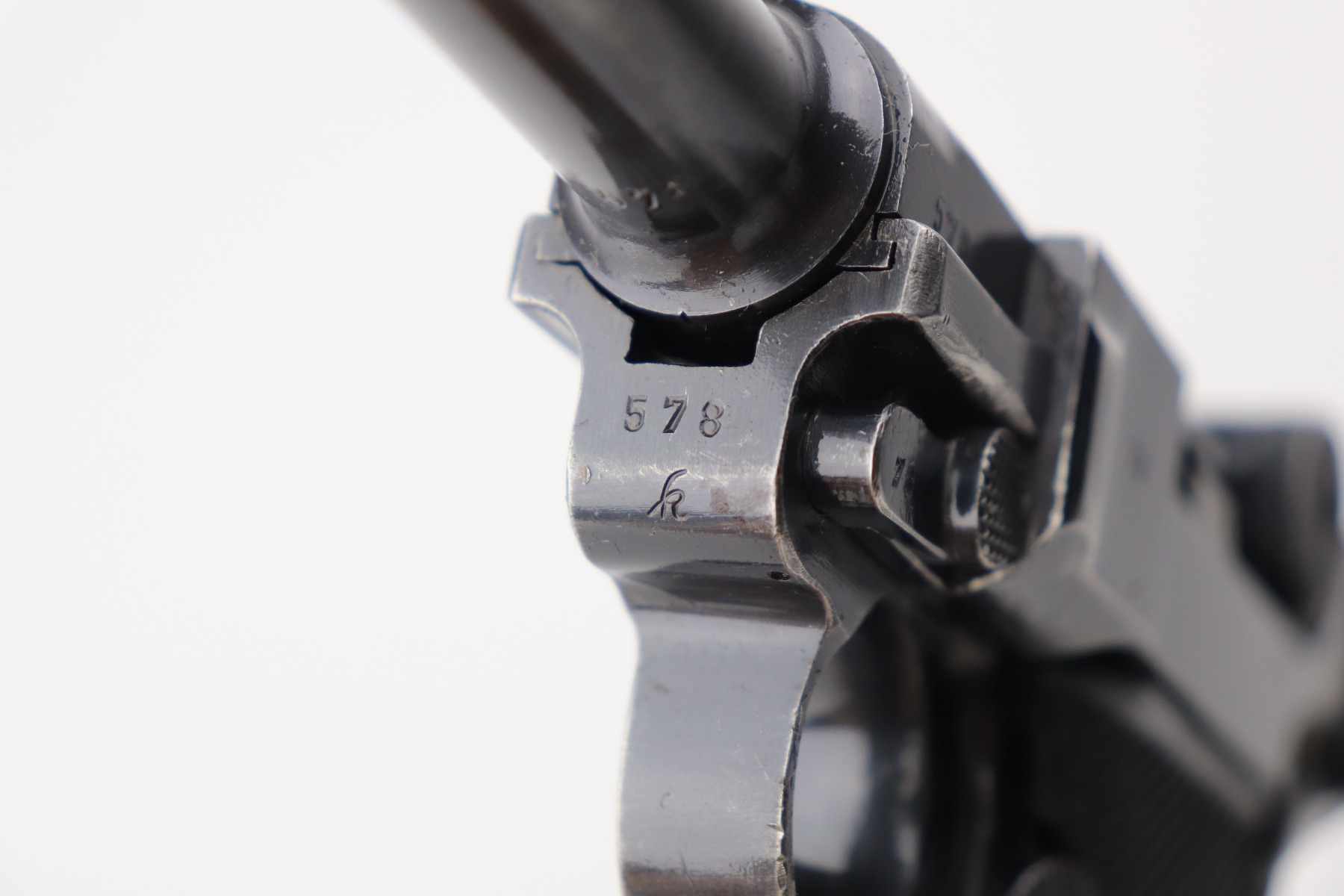 3/4/21 – This is a very nice example of a Black Widow Mauser Luger issued to the Nazi military in 1942. It is all matching and has the proper “Eagle 135” military proofs. It has retained about 90% of its original bluing. There is somewhat spotty wear on the front strap, left side of the frame, side plate, high edges of the frame, around the muzzle, and chamber. Thinning on the barrel. It comes with excellent original black widow grips and a black widow magazine. The bore is shiny with strong rifling and areas of minor freckling throughout.