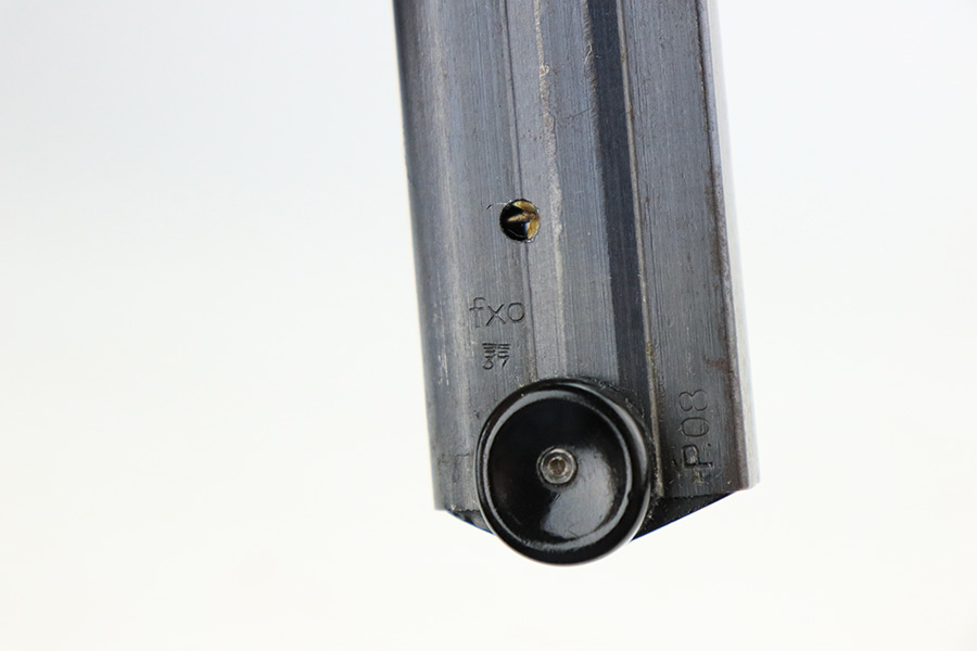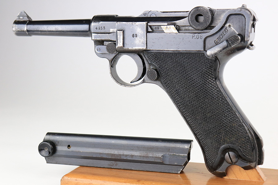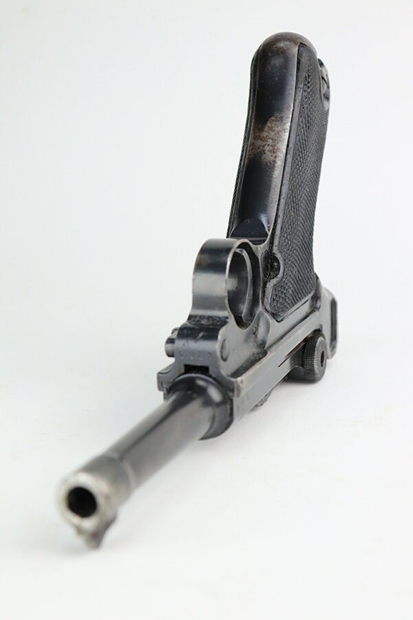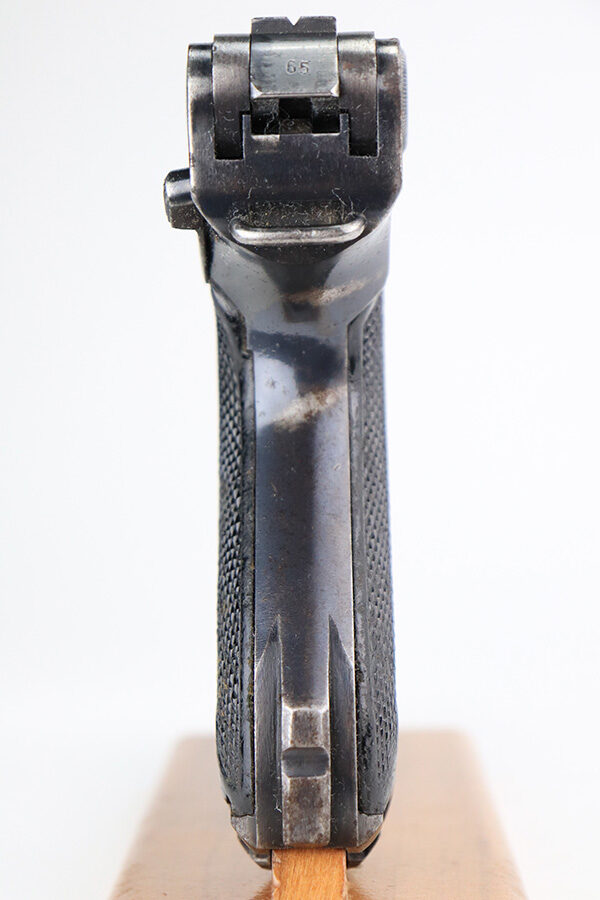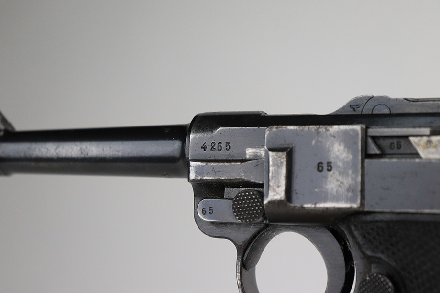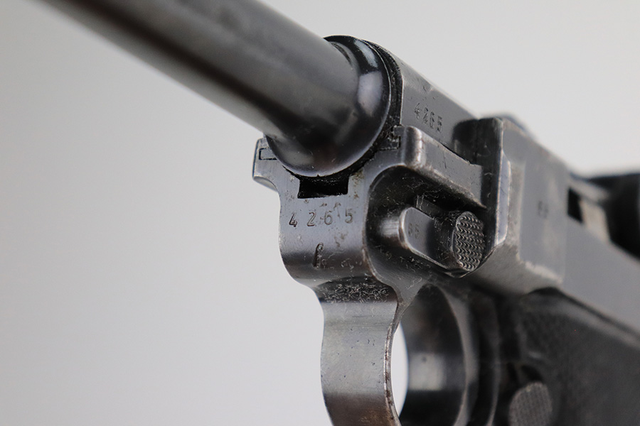 6/4/21 – This is a nice example of a “Black Widow” Mauser Luger issued to the Nazi military in 1942. It is all matching and has the proper “Eagle 135” military proofs. It has retained roughly 85% of its original finish. There are areas of wear on both straps, on the side plate, side rails, and around the muzzle. Minor thinning on the toggle, chamber, and on the barrel. A few handling marks on the front strap. There is spotty oxidation throughout, most noticeable on the barrel and straps. Comes with slightly worn original black widow grips and a proper black widow magazine – two repaired cracks in the mag bottom. The bore has strong rifling with noticeable freckling throughout.