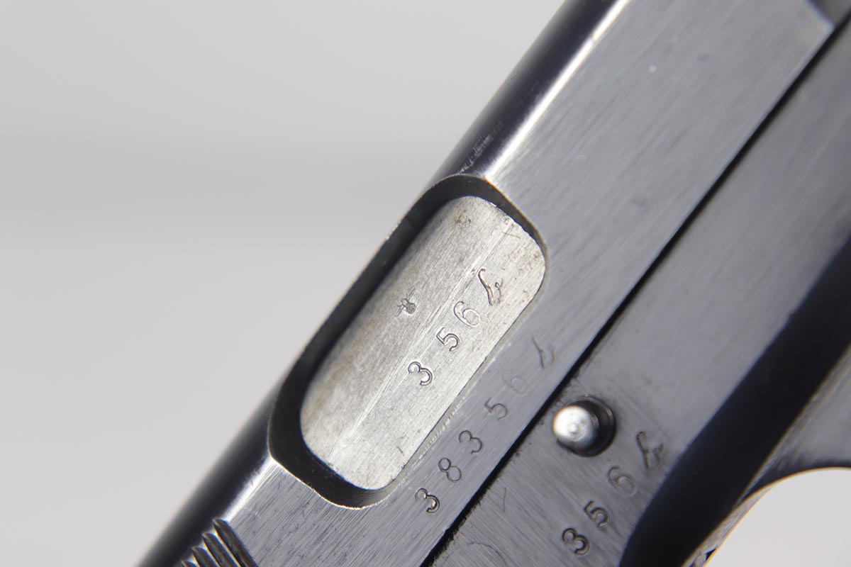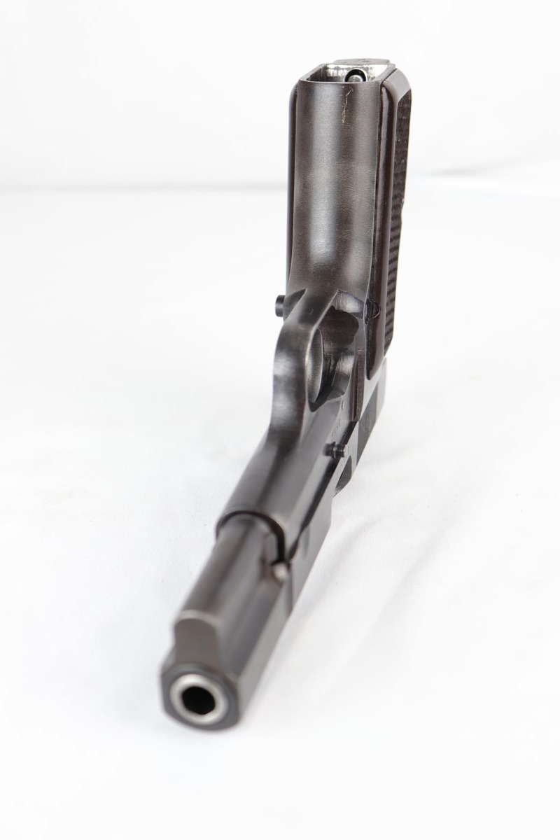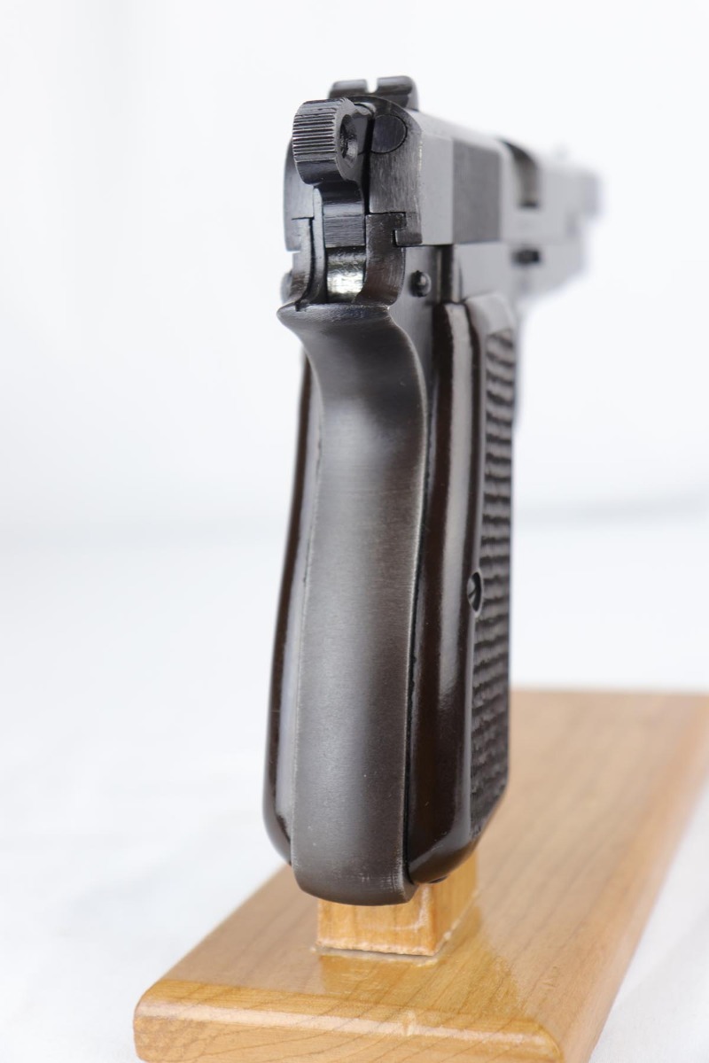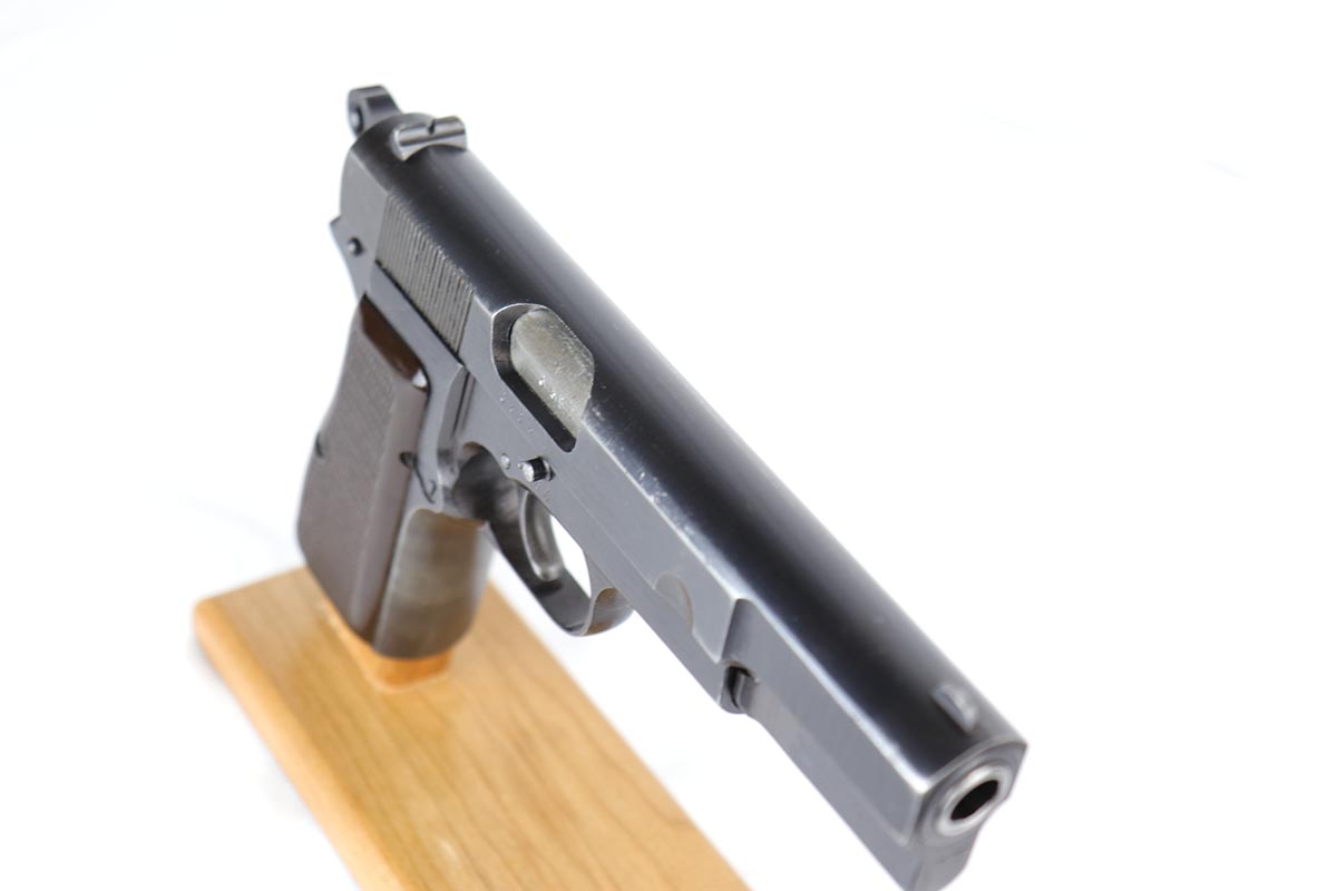 7/17/18 – This is a nice example of an original and matching Browning Hi Power, made in Belgium in the early 40s for the German Army. The original finish rates at 94-95% with most wear since in the form of patina/thinning on the straps. Minty bore and excellent brown plastic grips. Unmarked but original magazine.