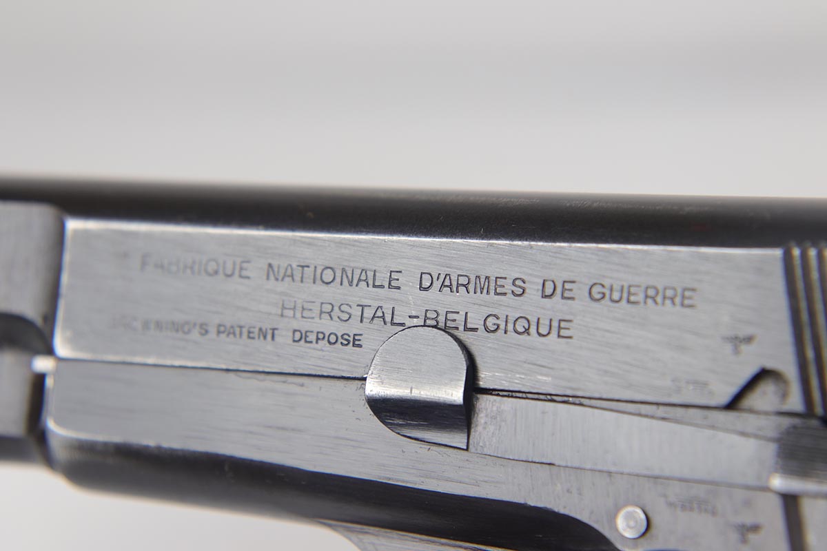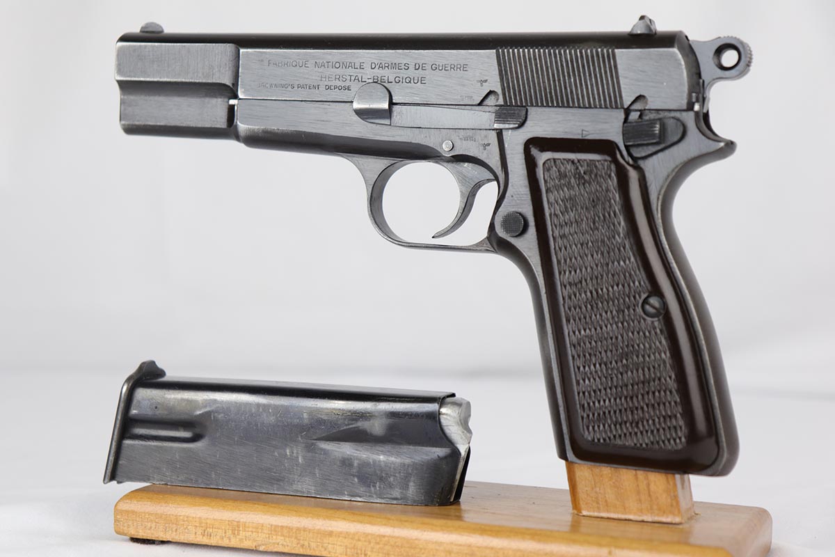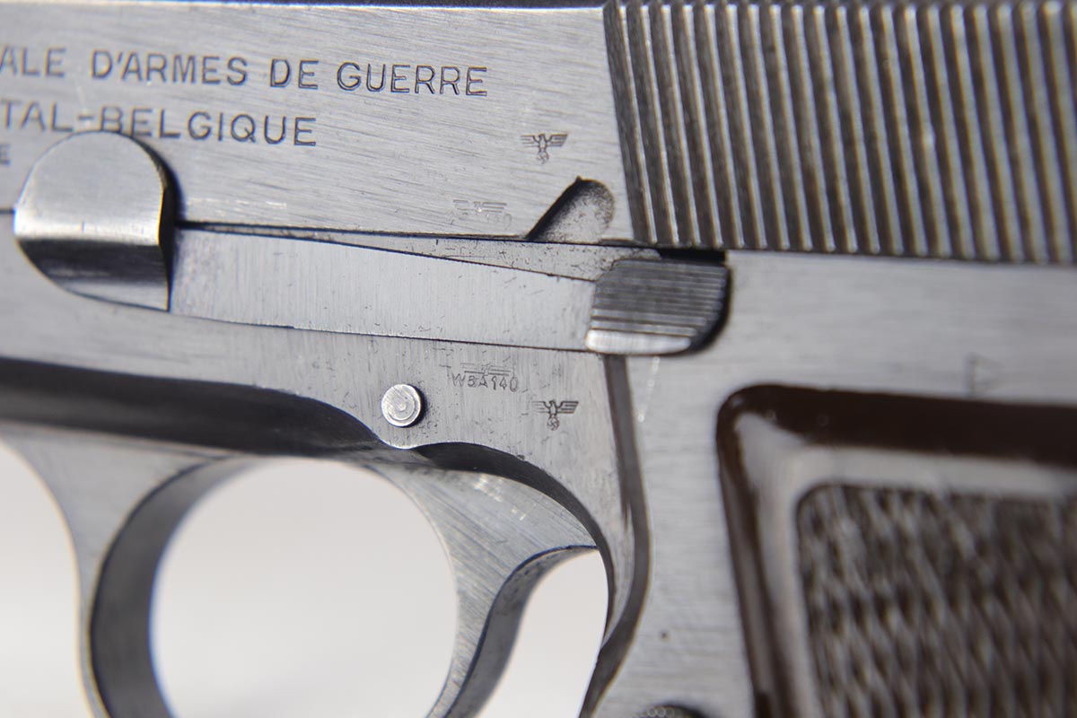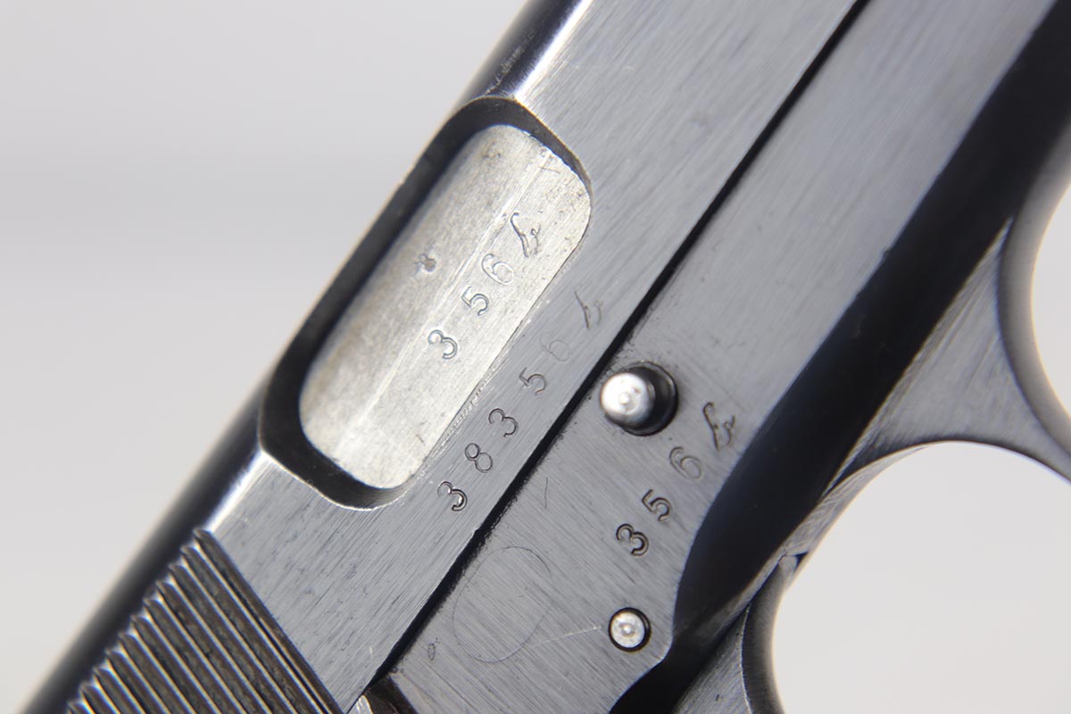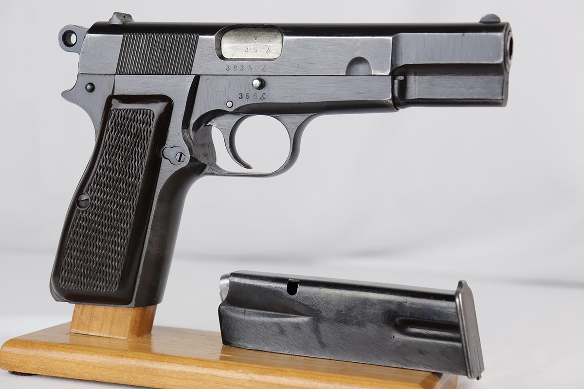 7/17/18 – This is a nice example of an original and matching Browning Hi Power, made in Belgium in the early 40s for the German Army. The original finish rates at 94-95% with most wear since in the form of patina/thinning on the straps. Minty bore and excellent brown plastic grips. Unmarked but original magazine.
