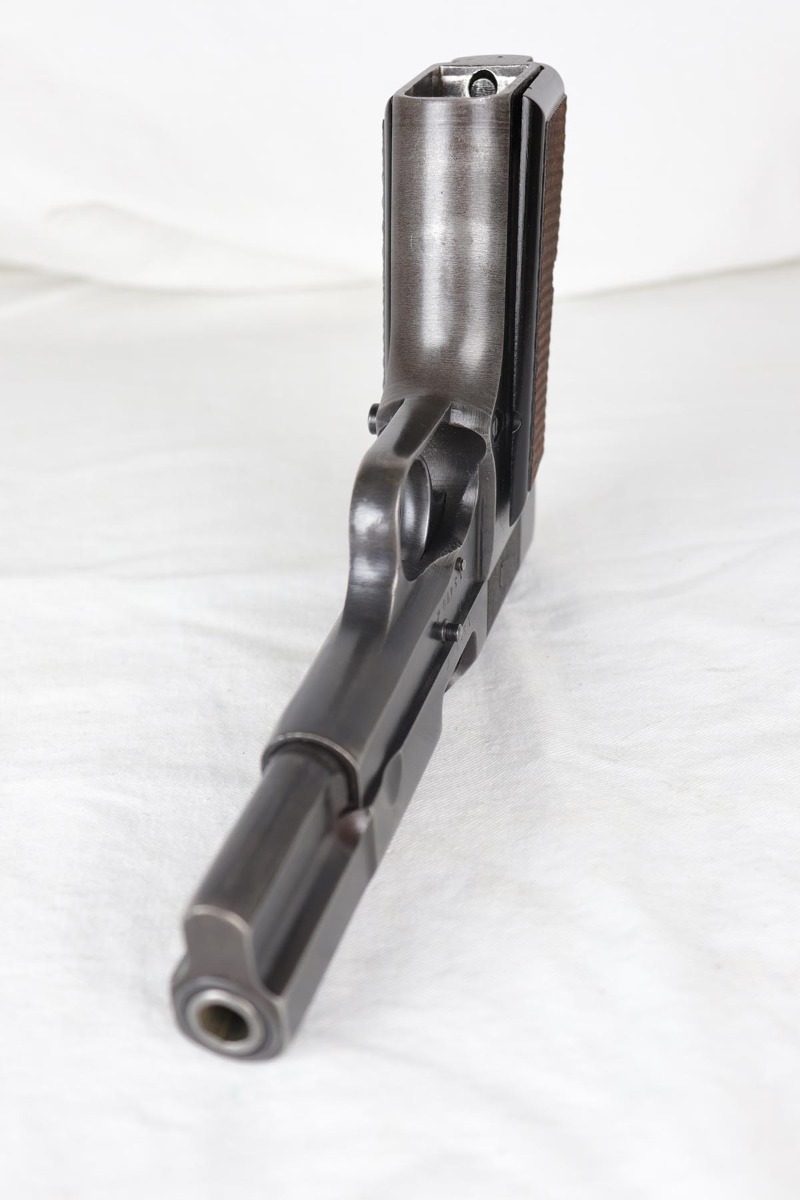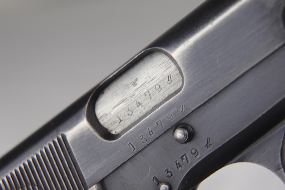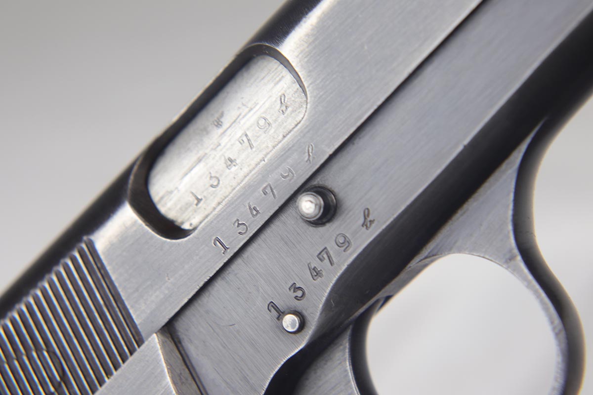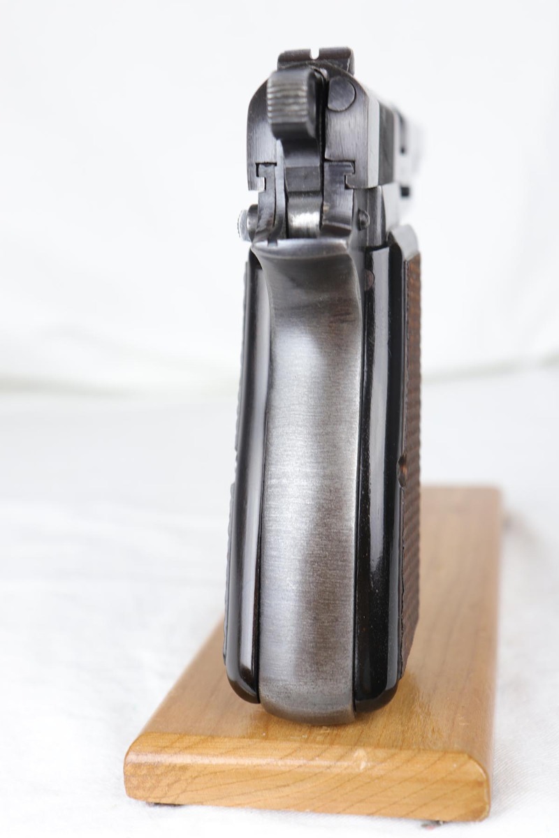 7/24/18 – This is an original and matching Browning Hi Power that was issued to the German Army in the latter half of the war. The finish rates in the 80s with thin straps and high edge wear. WaA140 proofs on slide and frame. Original magazine is unmarked. Plastic grips were likely made after the war. Terrific bore.